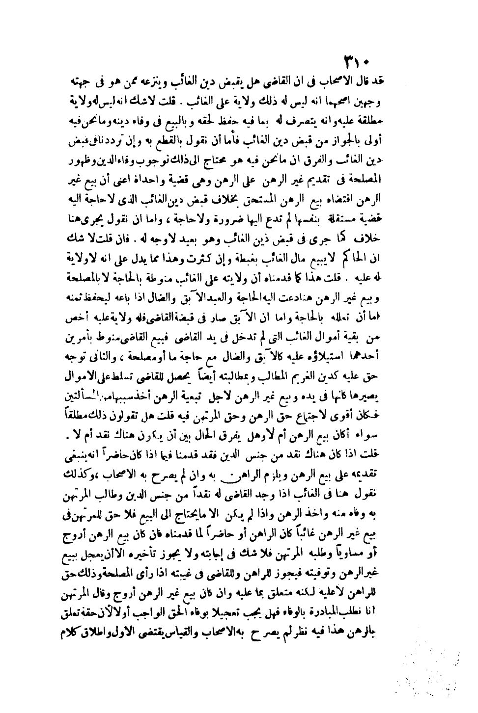 ، وَالثَّانِي تَوَجُّهُ حَقٍّ عَلَيْهِ كَدَيْنِ الْغَرِيمِ الْمَطَالِبِ، وَبِمُطَالَبَتِهِ أَيْضًا يَحْصُلُ لِلْقَاضِي تَسَلُّطٌ عَلَى الْأَمْوَالِ يُصَيِّرُهَا كَأَنَّهَا فِي يَدِهِ، وَبَيْعُ غَيْرِ الرَّهْنِ لِأَجْلِ تَبَعِيَّةِ الرَّهْنِ أُخِذَ سَبَبُهَا مِنْ الْمَسْأَلَتَيْنِ، فَكَانَ أَقْوَى لِاجْتِمَاعِ حَقِّ الرَّهْنِ، وَحَقِّ الْمُرْتَهِنِ فِيهِ قُلْت: هَلْ تَقُولُونَ ذَلِكَ مُطْلَقًا سَوَاءٌ أَكَانَ بَيْعُ الرَّهْنِ أَمْ لَا، وَهَلْ يُفَرَّقُ الْحَالُ بَيْنَ أَنْ يَكُونَ هُنَاكَ نَقْدٌ أَمْ لَا.