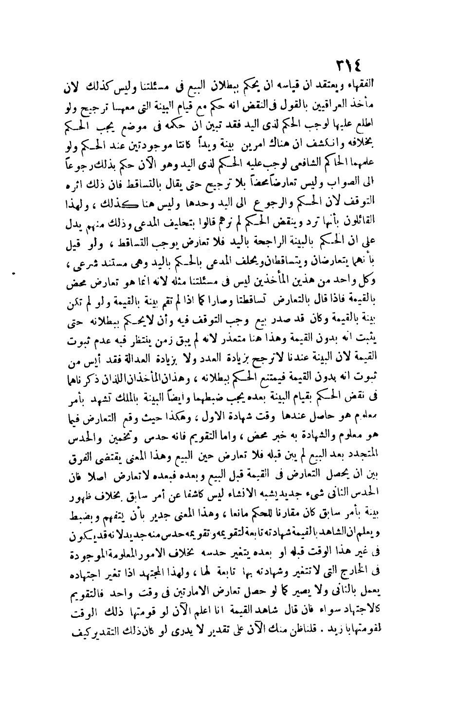 الْفُقَهَاءِ، وَيُعْتَقَدُ أَنَّ قِيَاسَهُ أَنْ يَحْكُمَ بِبُطْلَانِ الْبَيْعِ فِي مَسْأَلَتِنَا، وَلَيْسَ كَذَلِكَ؛ لِأَنَّ مَأْخَذَ الْعِرَاقِيِّينَ بِالْقَوْلِ فِي النَّقْضِ أَنَّهُ حُكْمٌ مَعَ قِيَامِ الْبَيِّنَةِ الَّتِي مَعَهَا تَرْجِيحٌ، وَلَوْ اطَّلَعَ عَلَيْهَا لَوَجَبَ الْحُكْمُ لِذِي الْيَدِ فَقَدْ تَبَيَّنَ أَنَّ حُكْمَهُ فِي مَوْضِعٍ يَجِبُ الْحُكْمُ بِخِلَافِهِ، وَانْكَشَفَ أَنَّ هُنَاكَ أَمْرَيْنِ: بَيِّنَةً، وَيَدًا كَانَتَا مَوْجُودَتَيْنِ عِنْدَ الْحُكْمِ، وَلَوْ عَلِمَهُمَا الْحَاكِمُ الشَّافِعِيُّ لَوَجَبَ عَلَيْهِ الْحُكْمُ لِذِي الْيَدِ، وَهُوَ الْآنَ حَكَمَ بِذَلِكَ رُجُوعًا إلَى الصَّوَابِ، وَلَيْسَ تَعَارُضًا مَحْضًا بِلَا تَرْجِيحٍ حَتَّى يُقَالَ بِالتَّسَاقُطِ فَإِنَّ ذَلِكَ أَثَرُهُ التَّوَقُّفُ؛ لِأَنَّ الْحُكْمَ، وَالرُّجُوعَ إلَى الْيَدِ وَحْدَهَا، وَلَيْسَ هُنَا كَذَلِكَ؛ وَلِهَذَا الْقَائِلُونَ بِأَنَّهَا تُرَدُّ، وَيُنْقَضُ الْحُكْمُ لَمْ نَرَهُمْ قَالُوا بِتَحْلِيفِ الْمُدَّعِي، وَذَلِكَ مِنْهُمْ يَدُلُّ عَلَى أَنَّ الْحُكْمَ بِالْبَيِّنَةِ الرَّاجِحَةِ بِالْيَدِ فَلَا تَعَارُضَ يُوجِبُ التَّسَاقُطَ، وَلَوْ قِيلَ بِأَنَّهُمَا يَتَعَارَضَانِ، وَيَتَسَاقَطَانِ، وَيَحْلِفُ الْمُدَّعِي بِالْحُكْمِ بِالْيَدِ، وَهِيَ مُسْتَنَدٌ شَرْعِيٌّ.