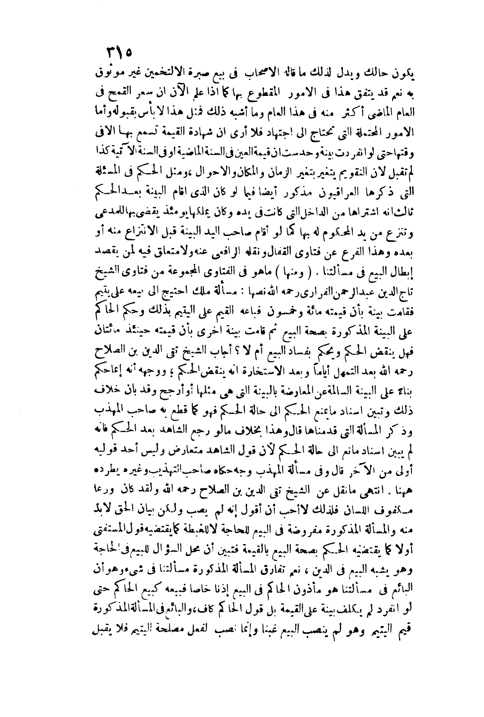 وَلَقَدْ كَانَ وَرِعًا مَكْفُوفَ اللِّسَانِ فَلِذَلِكَ لَا أُحِبُّ أَنْ أَقُولَ: إنَّهُ لَمْ يُصِبْ، وَلَكِنَّ بَيَانَ الْحَقِّ لَا بُدَّ مِنْهُ، وَالْمَسْأَلَةُ الْمَذْكُورَةُ مَفْرُوضَةٌ فِي الْبَيْعِ لِلْحَاجَةِ لَا لِلْغِبْطَةِ كَمَا يَقْتَضِيه قَوْلُ الْمُسْتَفْتِي أَوَّلًا كَمَا يَقْتَضِيه الْحُكْمُ بِصِحَّةِ الْبَيْعِ بِالْقِيمَةِ فَتَبَيَّنَ أَنَّ مَحَلَّ السُّؤَالِ لِلْبَيْعِ فِي الْحَاجَةِ، وَهُوَ يُشْبِهُ الْبَيْعَ فِي الدَّيْنِ، نَعَمْ تُفَارِقُ الْمَسْأَلَةُ الْمَذْكُورَةُ مَسْأَلَتَنَا فِي شَيْءٍ، وَهُوَ أَنَّ الْبَائِعَ فِي مَسْأَلَتِنَا هُوَ مَأْذُونُ الْحَاكِمِ فِي الْبَيْعِ إذْنًا خَاصًّا فَبَيْعُهُ كَبَيْعِ الْحَاكِمِ حَتَّى لَوْ انْفَرَدَ لَمْ يُكَلَّفْ بَيِّنَةً عَلَى الْقِيمَةِ بَلْ قَوْلُ الْحَاكِمِ كَافٍ، وَالْبَائِعُ فِي الْمَسْأَلَةِ الْمَذْكُورَةِ قَيِّمُ الْيَتِيمِ، وَهُوَ لَمْ يَنْصِبْ الْبَيْعَ غَبْنًا، وَإِنَّمَا نَصَّبَ لِفِعْلِ مَصْلَحَةِ الْيَتِيمِ فَلَا يُقْبَلُ