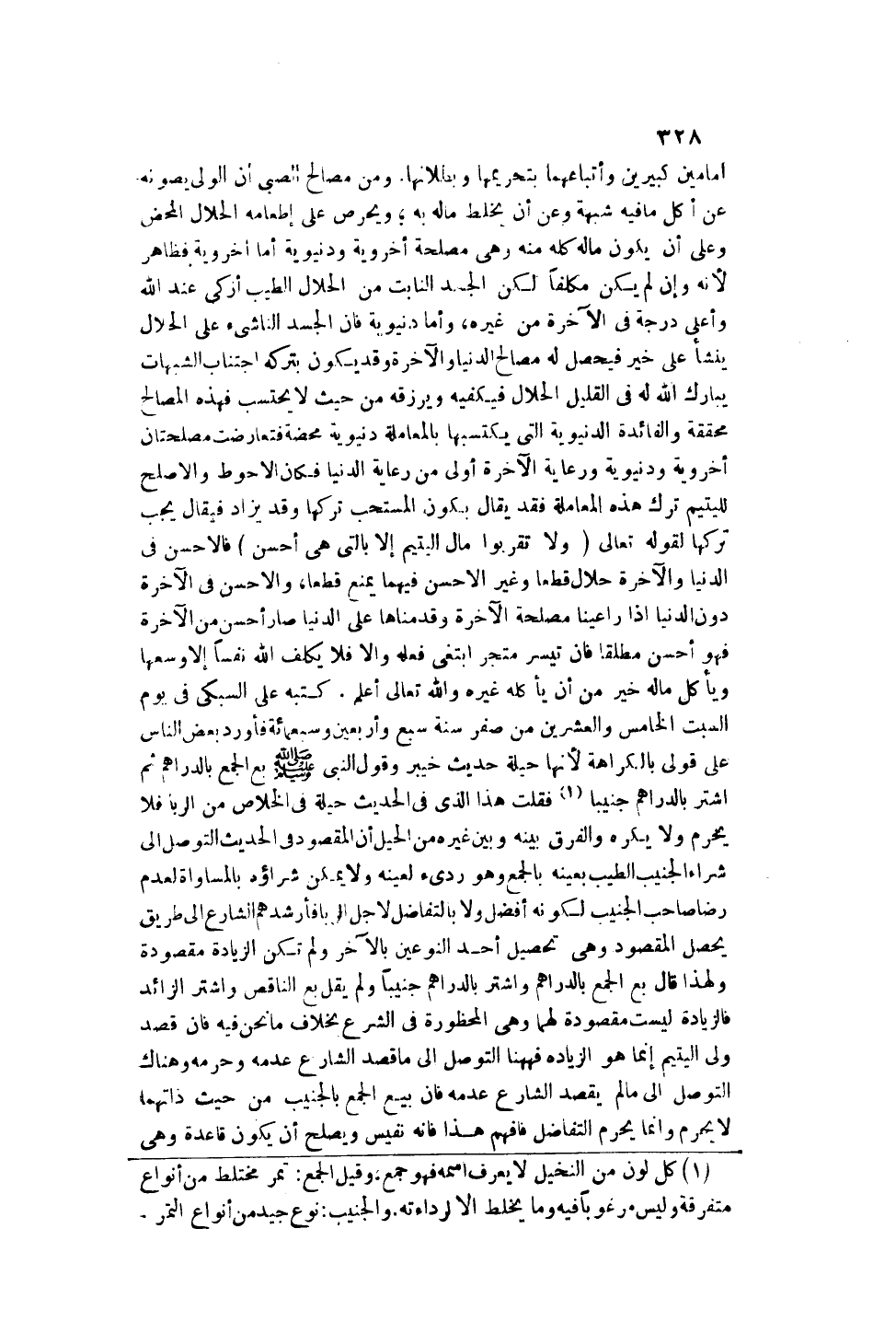 وَمِنْ مَصَالِحِ الصَّبِيِّ أَنَّ الْوَلِيَّ يَصُونُهُ عَنْ أَكْلِ مَا فِيهِ شُبْهَةٌ، وَعَنْ أَنْ يَخْلِطَ مَالَهُ بِهِ، وَيَحْرِصَ عَلَى إطْعَامِهِ الْحَلَالَ الْمَحْضَ، وَعَلَى أَنْ يَكُونَ مَالُهُ كُلُّهُ مِنْهُ، وَهِيَ مَصْلَحَةٌ أُخْرَوِيَّةٌ، وَدُنْيَوِيَّةٌ؛ أَمَّا أُخْرَوِيَّةٌ فَظَاهِرٌ؛ لِأَنَّهُ وَإِنْ لَمْ يَكُنْ مُكَلَّفًا لَكِنَّ الْجَسَدَ النَّابِتَ مِنْ الْحَلَالِ الطَّيِّبِ أَزْكَى عِنْدَ اللَّهِ، وَأَعْلَى دَرَجَةً فِي الْآخِرَةِ مِنْ غَيْرِهِ، وَأَمَّا دُنْيَوِيَّةٌ فَإِنَّ الْجَسَدَ النَّاشِئَ عَلَى الْحَلَالِ يَنْشَأُ عَلَى خَيْرٍ فَيَحْصُلُ لَهُ مَصَالِحُ الدُّنْيَا، وَالْآخِرَةِ، وَقَدْ يَكُونُ بِتَرْكِهِ اجْتِنَابَ الشُّبُهَاتِ يُبَارِكُ اللَّهُ لَهُ فِي الْقَلِيلِ الْحَلَالِ فَيَكْفِيه، وَيَرْزُقُهُ مِنْ حَيْثُ لَا يَحْتَسِبُ فَهَذِهِ الْمَصَالِحُ مُحَقَّقَةٌ، وَالْفَائِدَةُ الدُّنْيَوِيَّةُ الَّتِي يَكْتَسِبُهَا بِالْمُعَامَلَةِ دُنْيَوِيَّةٌ مَحْضَةٌ فَتَعَارَضَتْ مَصْلَحَتَانِ أُخْرَوِيَّةٌ، وَدُنْيَوِيَّةٌ، وَرِعَايَةُ الْآخِرَةِ أَوْلَى مِنْ رِعَايَةِ الدُّنْيَا فَكَانَ الْأَحْوَطُ، وَالْأَصْلَحُ لِلْيَتِيمِ تَرْكَ هَذِهِ الْمُعَامَلَةِ فَقَدْ يُقَالُ بِكَوْنِ الْمُسْتَحَبِّ تَرْكَهَا، وَقَدْ يُزَادُ فَيُقَالُ: يَجِبُ تَرْكُهَا لِقَوْلِهِ تَعَالَى {وَلا تَقْرَبُوا مَالَ الْيَتِيمِ إِلا بِالَّتِي هِيَ أَحْسَنُ} [الأنعام: 152] فَالْأَحْسَنُ فِي الدُّنْيَا، وَالْآخِرَةِ حَلَالٌ قَطْعًا، وَغَيْرُ الْأَحْسَنِ فِيهِمَا يُمْنَعُ قَطْعًا، وَالْأَحْسَنُ فِي الْآخِرَةِ دُونَ الدُّنْيَا إذَا رَاعَيْنَا مَصْلَحَةَ الْآخِرَةِ، وَقَدَّمْنَاهَا عَلَى الدُّنْيَا صَارَ أَحْسَنَ مِنْ الْآخِرَةِ فَهُوَ أَحْسَنُ مُطْلَقًا، فَإِنْ تَيَسَّرَ مُتَّجَرٌ ابْتَغَى فِعْلَهُ، وَإِلَّا فَلَا يُكَلِّفُ اللَّهُ نَفْسًا إلَّا وُسْعَهَا، وَيَأْكُلُ مَالَهُ خَيْرٌ مِنْ أَنْ يَأْكُلَهُ غَيْرُهُ، وَاَللَّهُ تَعَالَى أَعْلَمُ. كَتَبَهُ عَلِيٌّ السُّبْكِيُّ فِي يَوْمِ السَّبْتِ الْخَامِسِ وَالْعِشْرِينَ مِنْ صَفَرٍ سَنَةَ سَبْعٍ وَأَرْبَعِينَ، وَسَبْعِمِائَةٍ فَأَوْرَدَ بَعْضُ النَّاسِ عَلَى قَوْلِي بِالْكَرَاهَةِ؛ لِأَنَّهَا حِيلَةُ حَدِيثِ خَيْبَرَ.