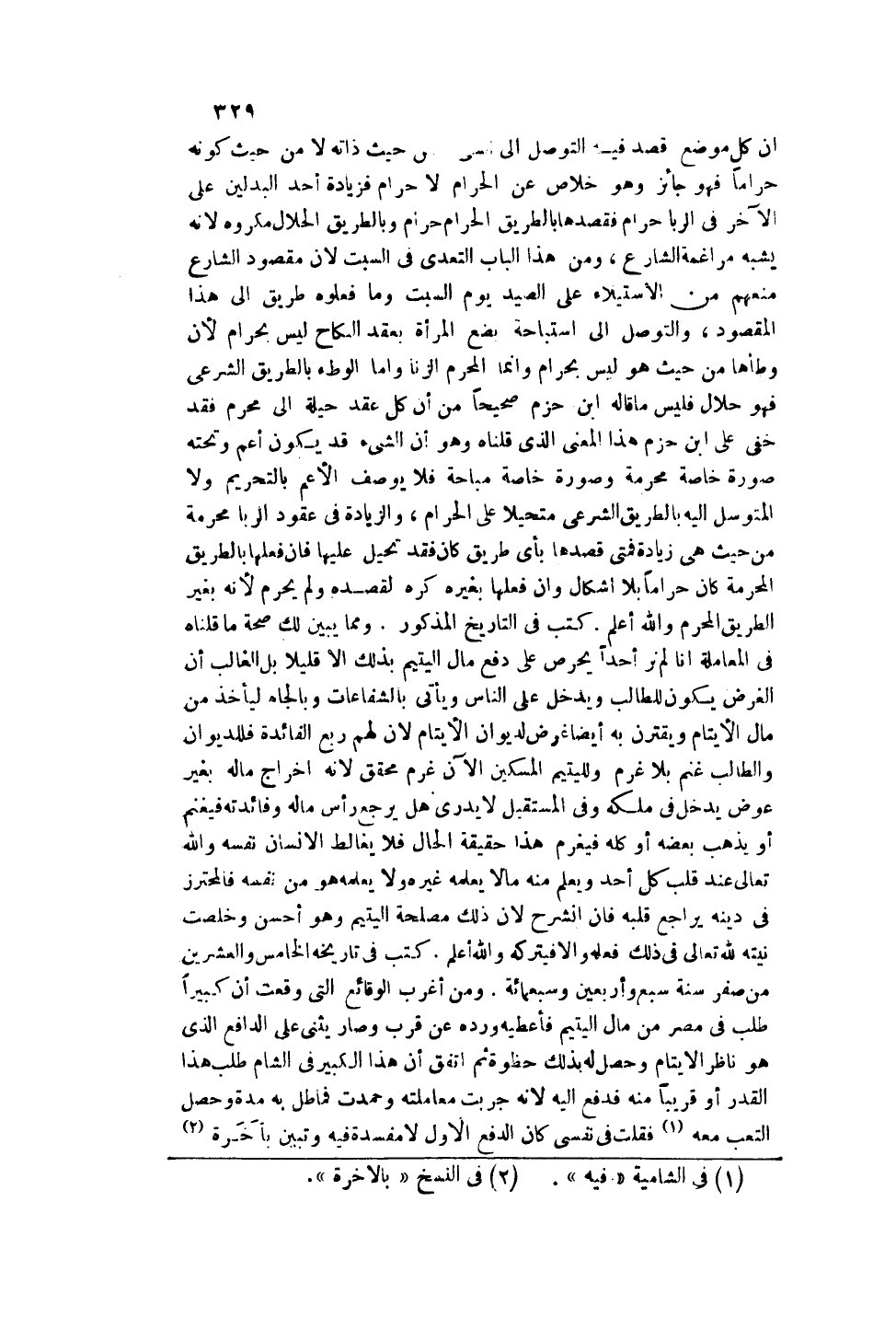 وَأَمَّا الْوَطْءُ بِالطَّرِيقِ الشَّرْعِيِّ فَهُوَ حَلَالٌ فَلَيْسَ مَا قَالَهُ ابْنُ حَزْمٍ صَحِيحًا مِنْ أَنَّ كُلَّ عَقْدٍ حِيلَةٌ إلَى مُحَرَّمٍ فَقَدْ خَفِيَ عَلَى ابْنِ حَزْمٍ هَذَا الْمَعْنَى الَّذِي قُلْنَاهُ، وَهُوَ أَنَّ الشَّيْءَ قَدْ يَكُونُ أَعَمَّ، وَتَحْتَهُ صُورَةٌ خَاصَّةٌ مُحَرَّمَةٌ، وَصُورَةٌ خَاصَّةٌ مُبَاحَةٌ فَلَا يُوصَفُ الْأَعَمُّ بِالتَّحْرِيمِ، وَلَا الْمُتَوَصِّلُ إلَيْهِ بِالطَّرِيقِ الشَّرْعِيِّ مُتَحَيِّلًا عَلَى الْحَرَامِ، وَالزِّيَادَةُ فِي عُقُودِ الرِّبَا مُحَرَّمَةٌ مِنْ حَيْثُ هِيَ زِيَادَةٌ فَمَتَى قَصَدَهَا بِأَيِّ طَرِيقٍ كَانَ فَقَدْ تَحَيَّلَ عَلَيْهَا، فَإِنْ فَعَلَهَا بِالطَّرِيقِ الْمُحَرَّمَةِ كَانَ حَرَامًا بِلَا إشْكَالٍ، وَإِنْ فَعَلَهَا بِغَيْرِهِ كُرِهَ لِقَصْدِهِ، وَلَمْ يُحَرَّمْ؛ لِأَنَّهُ بِغَيْرِ الطَّرِيقِ الْمُحَرَّمِ، وَاَللَّهُ أَعْلَمُ. كَتَبَ فِي التَّارِيخِ الْمَذْكُورِ: وَمِمَّا يُبَيِّنُ لَك صِحَّةَ مَا قُلْنَاهُ فِي الْمُعَامَلَةِ أَنَّا لَمْ نَرَ أَحَدًا يَحْرِصُ عَلَى دَفْعِ مَالِ الْيَتِيمِ بِذَلِكَ إلَّا قَلِيلًا بَلْ الْغَالِبُ أَنَّ الْغَرَضَ يَكُونُ لِلطَّالِبِ، وَيَدْخُلُ عَلَى النَّاسِ، وَيَأْتِي بِالشَّفَاعَاتِ، وَبِالْجَاهِ لِيَأْخُذَ مِنْ مَالِ الْأَيْتَامِ، وَيَقْتَرِنُ بِهِ أَيْضًا غَرَضٌ لِدِيوَانِ الْأَيْتَامِ؛ لِأَنَّ لَهُمْ رُبْعَ الْفَائِدَةِ فَلِلدِّيوَانِ، وَالطَّالِبِ غَنْمٌ بِلَا غُرْمٍ، وَلِلْيَتِيمِ الْمِسْكِينِ الْآنَ غُرْمٌ مُحَقَّقٌ؛ لِأَنَّهُ إخْرَاجُ مَالِهِ بِغَيْرِ عِوَضٍ يَدْخُلُ فِي مِلْكِهِ، وَفِي الْمُسْتَقْبَلِ لَا يَدْرِي هَلْ يَرْجِعُ رَأْسُ مَالِهِ، وَفَائِدَتُهُ فَيَغْنَمُ، أَوْ يَذْهَبُ بَعْضُهُ، أَوْ كُلُّهُ فَيَغْرَمُ. هَذَا حَقِيقَةُ الْحَالِ فَلَا يُغَالِطُ الْإِنْسَانُ نَفْسَهُ، وَاَللَّهُ تَعَالَى عِنْدَ قَلْبِ كُلِّ وَاحِدٍ، وَيَعْلَمُ مِنْهُ مَا لَا يَعْلَمْهُ غَيْرُهُ، وَلَا يَعْلَمُهُ هُوَ مِنْ نَفْسِهِ فَالْمُحْتَرِزُ فِي دِينِهِ يُرَاجِعُ قَلْبَهُ، فَإِنْ انْشَرَحَ؛ لِأَنَّ ذَلِكَ مَصْلَحَةُ الْيَتِيمِ، وَهُوَ أَحْسَنُ، وَخَلُصَتْ نِيَّتُهُ لِلَّهِ تَعَالَى فِي ذَلِكَ فَعَلَهُ، وَإِلَّا فَيَتْرُكُهُ، وَاَللَّهُ أَعْلَمُ.