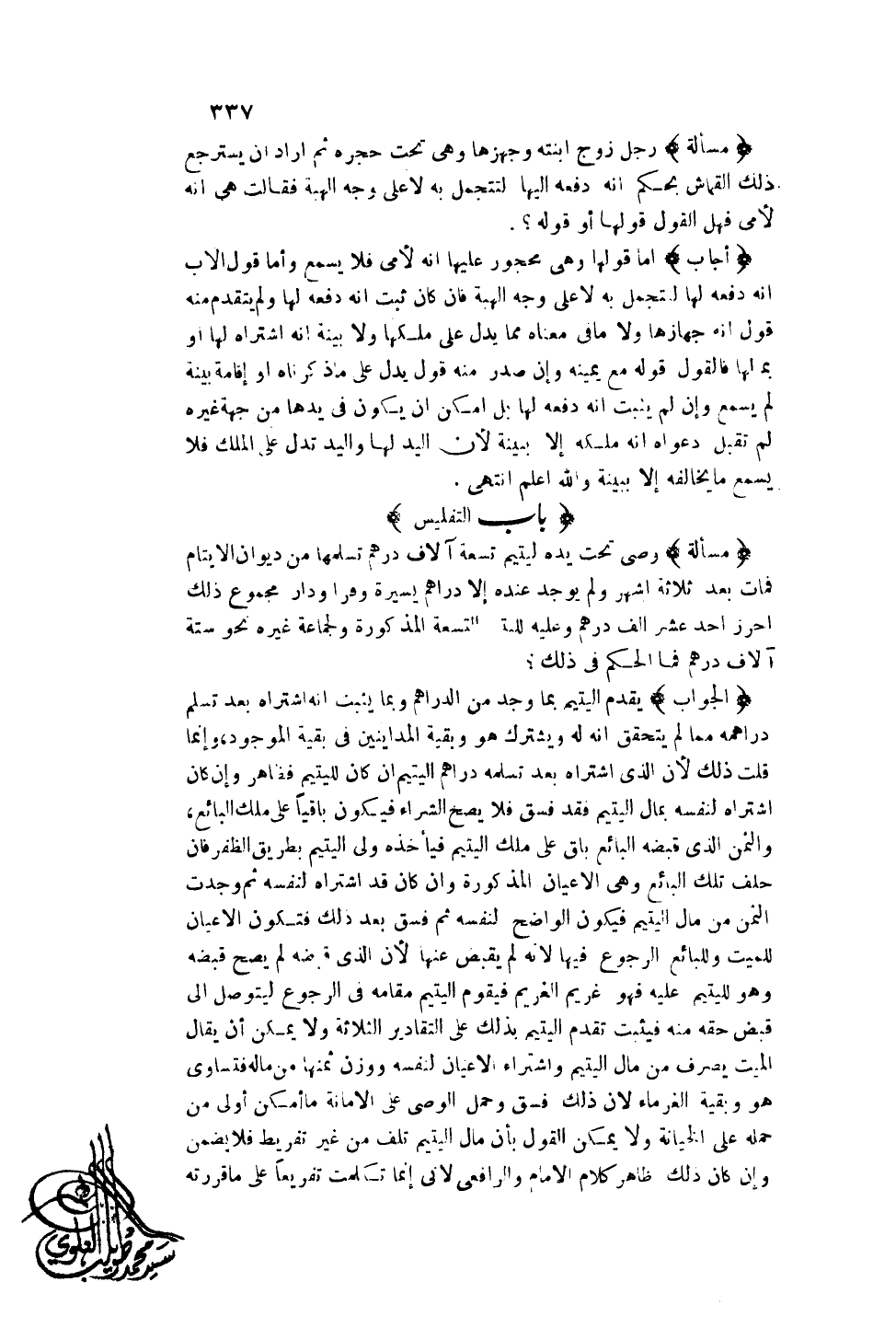(بَابُ التَّفْلِيسِ) (مَسْأَلَةٌ) وَصِيٌّ تَحْتَ يَدِهِ لِيَتِيمٍ تِسْعَةُ آلَافِ دِرْهَمٍ تَسَلَّمَهَا مِنْ دِيوَانِ الْأَيْتَامِ فَمَاتَ بَعْدَ ثَلَاثَةِ أَشْهُرٍ، وَلَمْ يُوجَدْ عِنْدَهُ إلَّا دَرَاهِمُ يَسِيرَةٌ، وَفِرَاءٌ، وَدَارٌ مَجْمُوعُ ذَلِكَ أَحْرَزَ أَحَدَ عَشَرَ أَلْفِ دِرْهَمٍ، وَعَلَيْهِ لِلْيَتِيمِ التِّسْعَةُ الْمَذْكُورَةُ، وَلِجَمَاعَةٍ غَيْرِهِ نَحْوُ سِتَّةِ آلَافِ دِرْهَمٍ فَمَا الْحُكْمُ فِي ذَلِكَ؟
