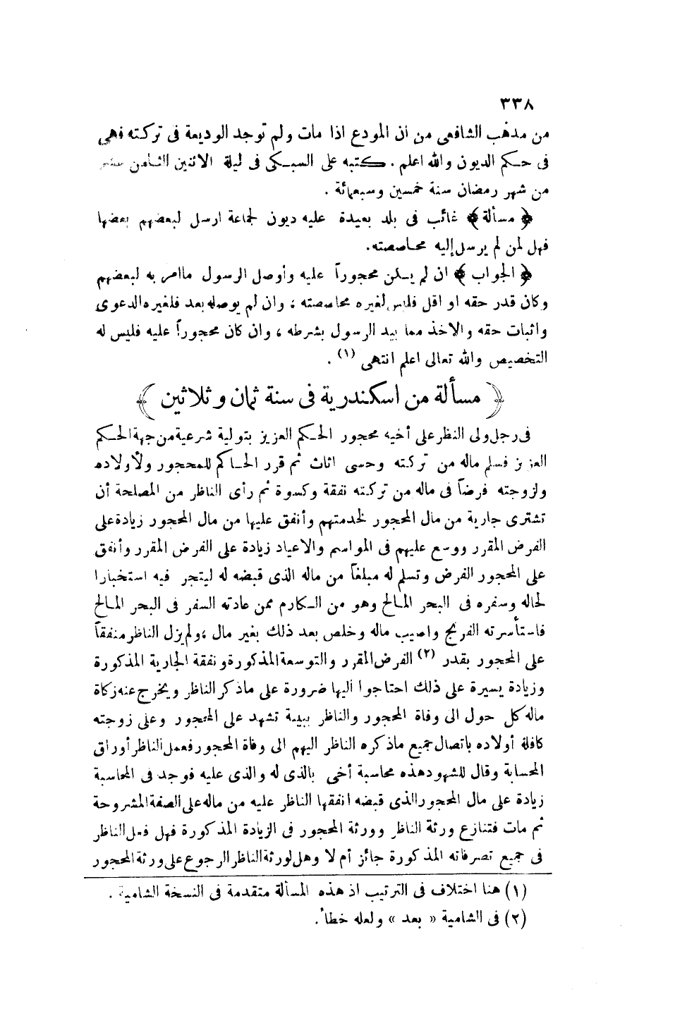 (مَسْأَلَةٌ مِنْ إسْكَنْدَرِيَّةَ فِي سَنَةِ ثَمَانٍ، وَثَلَاثِينَ) فِي رَجُلٍ وُلِّيَ النَّظَرَ عَلَى أَخِيهِ مَحْجُورِ الْحُكْمِ الْعَزِيزِ بِتَوْلِيَةٍ شَرْعِيَّةٍ مِنْ جِهَةِ الْحُكْمِ الْعَزِيزِ فَسَلَّمَ مَالَهُ مِنْ تَرِكَتِهِ، وَحِسِّيِّ أَثَاثٍ ثُمَّ قَرَّرَ الْحَاكِمُ لِلْمَحْجُورِ، وَلِأَوْلَادِهِ، وَلِزَوْجَتِهِ فَرْضًا فِي مَالِهِ مِنْ تَرِكَتِهِ نَفَقَةً، وَكِسْوَةً ثُمَّ رَأَى النَّاظِرُ مِنْ الْمَصْلَحَةِ أَنْ تُشْتَرَى جَارِيَةٌ مِنْ مَالِ الْمَحْجُورِ لِخِدْمَتِهِمْ، وَأَنْفَقَ عَلَيْهَا مِنْ مَالِ الْمَحْجُورِ زِيَادَةً عَلَى الْفَرْضِ الْمُقَرَّرِ، وَوَسَّعَ عَلَيْهِمْ فِي الْمَوَاسِمِ، وَالْأَعْيَادِ زِيَادَةً عَلَى الْفَرْضِ الْمُقَرَّرِ، وَأَنْفَقَ عَلَى الْمَحْجُورِ الْفَرْضَ، وَتَسَلَّمَ لَهُ مَبْلَغًا مِنْ مَالِهِ الَّذِي قَبَضَهُ لَهُ لِيَتَّجِرَ فِيهِ اسْتِخْبَارًا لِحَالِهِ، وَسَفَرِهِ فِي الْبَحْرِ الْمَالِحِ، وَهُوَ مِنْ الْكَارِمِ مِمَّنْ عَادَتُهُ السَّفَرُ فِي الْبَحْرِ الْمَالِحِ فَاسْتَأْسَرَتْهُ الْفِرِنْجُ، وَأُصِيبَ مَالُهُ، وَخُلِّصَ بَعْدَ ذَلِكَ بِغَيْرِ مَالٍ، وَلَمْ يَزَلْ النَّاظِرُ مُنْفِقًا عَلَى الْمَحْجُورِ بِقَدْرِ الْفَرْضِ الْمُقَرَّرِ، وَالتَّوَسُّعَةِ الْمَذْكُورَةِ، وَنَفَقَةِ الْجَارِيَةِ الْمَذْكُورَةِ، وَزِيَادَةٍ يَسِيرَةٍ عَلَى ذَلِكَ احْتَاجُوا إلَيْهَا ضَرُورَةً عَلَى مَا ذَكَرَ النَّاظِرُ، وَيُخْرِجُ عَنْهُ زَكَاةَ مَالِهِ كُلَّ حَوْلٍ إلَى وَفَاةِ الْمَحْجُورِ، وَالنَّاظِرِ بِبَيِّنَةٍ تَشْهَدُ عَلَى الْمَحْجُورِ، وَعَلَى زَوْجَتِهِ كَافِلَةِ أَوْلَادِهِ بِاتِّصَالِ جَمِيعِ مَا ذَكَرَهُ النَّاظِرُ إلَيْهِمْ إلَى وَفَاةِ الْمَحْجُورِ فَعَمِلَ النَّاظِرُ أَوْرَاقَ الْمُحَاسَبَةِ، وَقَالَ لِلشُّهُودِ: هَذِهِ مُحَاسَبَةُ أَخِي بِاَلَّذِي لَهُ، وَاَلَّذِي عَلَيْهِ فَوُجِدَ فِي الْمُحَاسَبَةِ زِيَادَةٌ عَلَى مَالِ الْمَحْجُورِ الَّذِي قَبَضَهُ أَنْفَقَهَا النَّاظِرُ عَلَيْهِ مِنْ مَالِهِ عَلَى الصِّفَةِ الْمَشْرُوحَةِ ثُمَّ مَاتَ فَتَنَازَعَ وَرَثَةُ النَّاظِرِ، وَوَرَثَةُ الْمَحْجُورِ فِي الزِّيَادَةِ الْمَذْكُورَةِ فَهَلْ فِعْلُ النَّاظِرِ فِي جَمِيعِ تَصَرُّفَاتِهِ الْمَذْكُورَةِ جَائِزٌ أَمْ لَا، وَهَلْ لِوَرَثَةِ النَّاظِرِ الرُّجُوعُ عَلَى وَرَثَةِ الْمَحْجُورِ