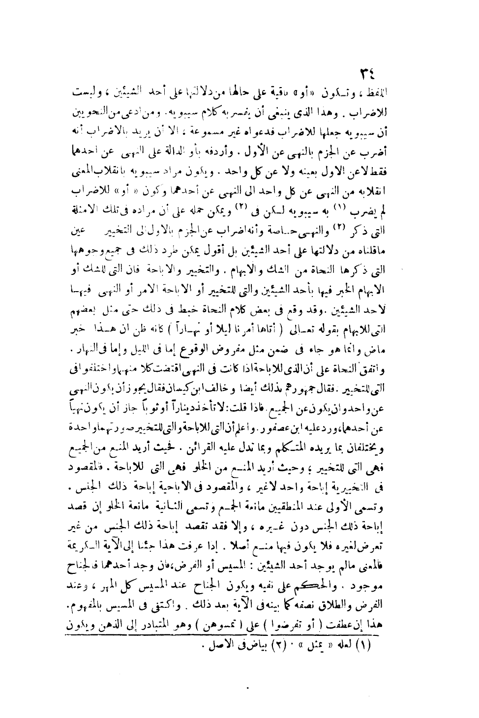 اللَّفْظِ، وَتَكُونُ " أَوْ " بَاقِيَةً عَلَى حَالِهَا مِنْ دَلَالَتِهَا عَلَى أَحَدِ الشَّيْئَيْنِ، وَلَيْسَتْ لِلْإِضْرَابِ. وَهَذَا الَّذِي يَنْبَغِي أَنْ يُفَسَّرَ بِهِ كَلَامُ سِيبَوَيْهِ.