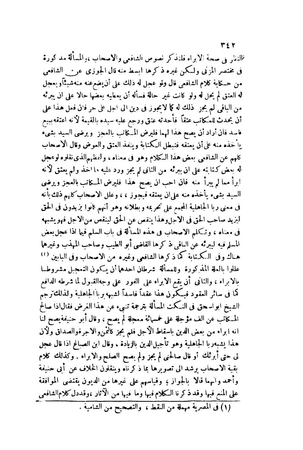 النَّظَرُ فِي صِحَّةِ الْإِبْرَاءِ فَلْنَذْكُرْ نُصُوصَ الشَّافِعِيِّ، وَالْأَصْحَابِ، وَالْمَسْأَلَةُ مَذْكُورَةٌ فِي مُخْتَصَرِ الْمُزَنِيِّ، وَلَكِنَّ غَيْرَهُ ذَكَرَهَا أَبْسَطَ مِنْهُ قَالَ الْجَوْزِيُّ عَنْ الشَّافِعِيِّ مِنْ حِكَايَةِ كَلَامِ الشَّافِعِيِّ قَالَ: وَلَوْ عَجَّلَ لَهُ ذَلِكَ عَلَى أَنْ يَضَعَ عَنْهُ مِنْهُ شَيْئًا، وَيُعَجِّلَ لَهُ الْعِتْقَ لَمْ يَحِلَّ لَهُ، وَلَوْ كَانَتْ غَيْرَ حَالَّةٍ فَسَأَلَهُ أَنْ يُعْطِيَهُ بَعْضَهَا حَالًّا عَلَى أَنْ يُبَرِّئَهُ مِنْ الْبَاقِي لَمْ يَجُزْ ذَلِكَ لَهُ كَمَا لَا يَجُوزُ فِي دَيْنٍ إلَى أَجَلٍ عَلَى حُرٍّ، فَإِنْ فَعَلَ هَذَا عَلَى أَنْ يُحْدِثَ لِلْمُكَاتَبِ عِتْقًا فَأَحْدَثَهُ عَتَقَ، وَرَجَعَ عَلَيْهِ سَيِّدُهُ بِالْقِيمَةِ؛ لِأَنَّهُ أَعْتَقَهُ بِبَيْعٍ فَاسِدٍ.