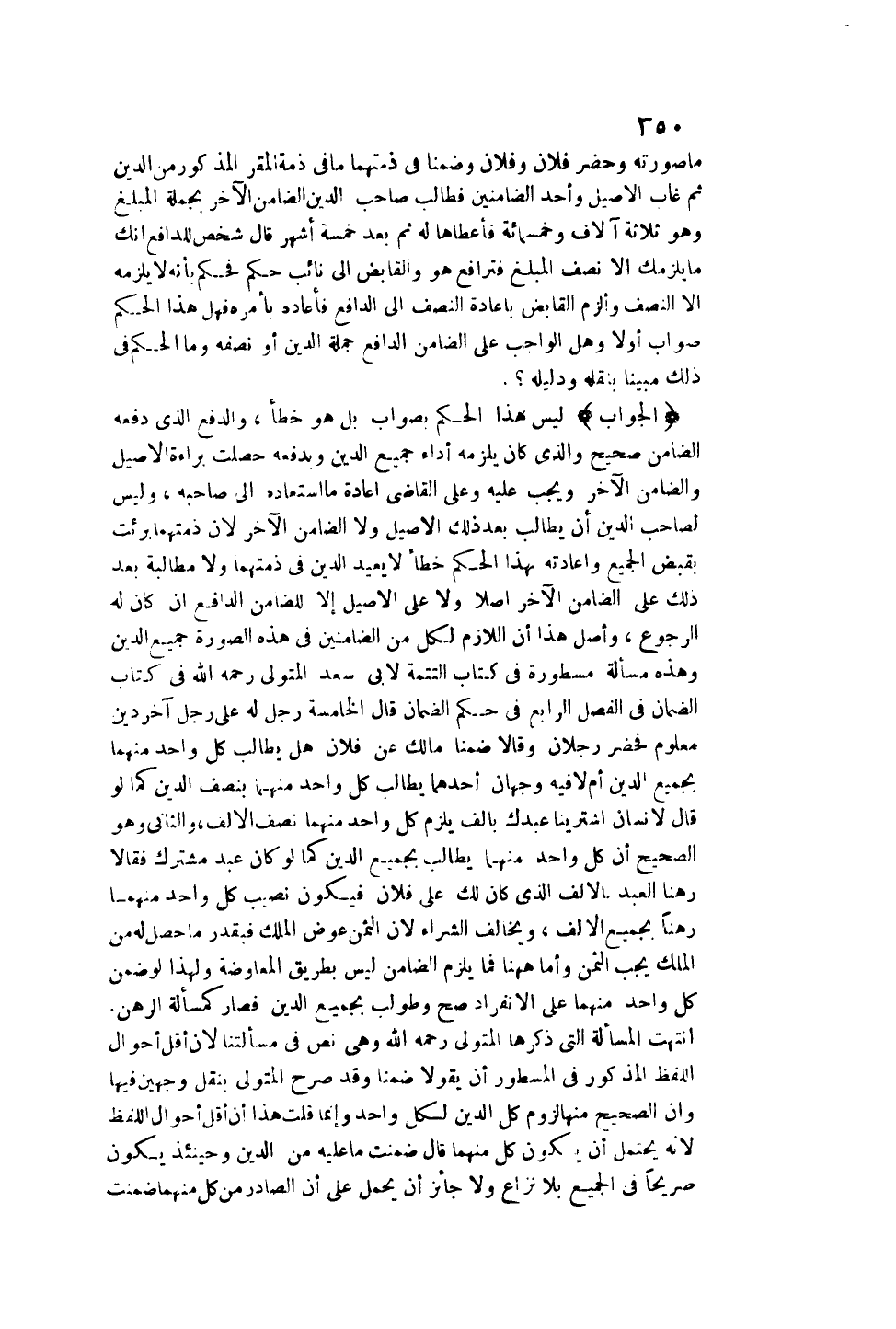 انْتَهَتْ الْمَسْأَلَةُ الَّتِي ذَكَرَهَا الْمُتَوَلِّي - رَحِمَهُ اللَّهُ -، وَهِيَ نَصٌّ فِي مَسْأَلَتِنَا؛ لِأَنَّ أَقَلَّ أَحْوَالِ اللَّفْظِ الْمَذْكُورِ فِي الْمَسْطُورِ أَنْ يَقُولَا: ضَمِنَّا، وَقَدْ صَرَّحَ الْمُتَوَلِّي بِنَقْلِ وَجْهَيْنِ فِيهَا، وَأَنَّ الصَّحِيحَ مِنْهَا لُزُومُ كُلِّ الدَّيْنِ لِكُلِّ وَاحِدٍ، وَإِنَّمَا قُلْت هَذَا أَنَّ أَقَلَّ أَحْوَالِ اللَّفْظِ؛ لِأَنَّهُ يُحْتَمَلُ أَنْ يَكُونَ كُلٌّ مِنْهُمَا قَالَ: ضَمِنْت مَا عَلَيْهِ مِنْ الدَّيْنِ، وَحِينَئِذٍ يَكُونُ صَرِيحًا فِي الْجَمِيعِ بِلَا نِزَاعٍ، وَلَا جَائِزَ أَنْ يُحْمَلَ عَلَى أَنَّ الصَّادِرَ مِنْ كُلٍّ مِنْهُمَا ضَمِنْت