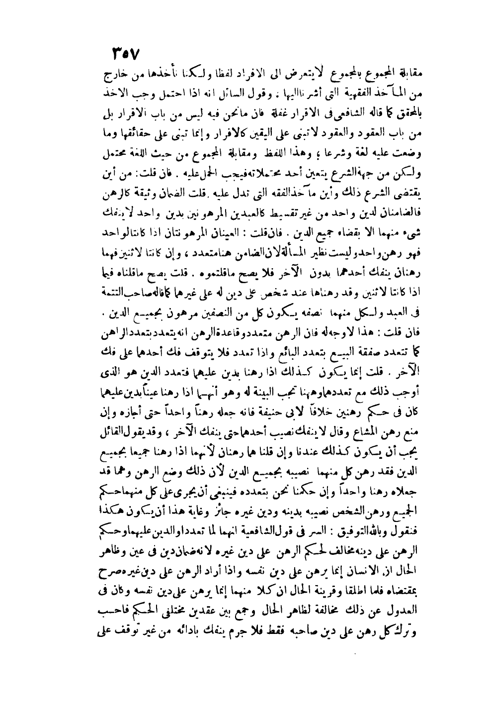 وَرَهْنُ الشَّخْصِ نَصِيبَهُ بِدَيْنِهِ، وَدَيْنِ غَيْرِهِ جَائِزٌ، وَغَايَةُ هَذَا أَنْ يَكُونَ هَكَذَا فَنَقُولُ، وَبِاَللَّهِ التَّوْفِيقُ: السِّرُّ فِي قَوْلِ الشَّافِعِيَّةِ أَنَّهُمَا لَمَّا تَعَدَّدَا، وَالدَّيْنُ عَلَيْهِمَا، وَحُكْمُ الرَّهْنِ عَلَى دَيْنِهِ مُخَالِفٌ لِحُكْمِ الرَّهْنِ عَلَى دَيْنِ غَيْرِهِ؛ لِأَنَّهُ ضَمَانُ دَيْنٍ فِي عَيْنٍ، وَظَاهِرُ الْحَالِ أَنَّ الْإِنْسَانَ إنَّمَا يَرْهَنُ عَلَى دَيْنِ نَفْسِهِ، وَإِذَا أَرَادَ الرَّهْنَ عَلَى دَيْنِ غَيْرِهِ صَرَّحَ بِمُقْتَضَاهُ فَلَمَّا أَطْلَقَا، وَقَرِينَةُ الْحَالِ أَنَّ كُلًّا مِنْهُمَا إنَّمَا يَرْهَنُ عَلَى دَيْنِ نَفْسِهِ، وَكَانَ فِي الْعُدُولِ عَنْ ذَلِكَ مُخَالَفَةً لِظَاهِرِ الْحَالِ، وَجَمَعَ بَيْنَ عَقْدَيْنِ مُخْتَلِفَيْ الْحُكْمِ فَأَحَبَّ، وَتَرَكَ كُلَّ رَهْنٍ عَلَى دَيْنِ صَاحِبِهِ فَقَطْ فَلَا جَرَمَ يَنْفَكُّ بِأَدَائِهِ مِنْ غَيْرِ تَوَقُّفٍ عَلَى