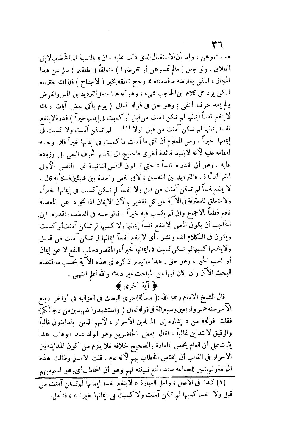 وَلَا مُتَعَلِّقٌ لِلْمُعْتَزِلَةِ فِي الْآيَةِ عَلَى كُلِّ تَقْدِيرٍ؛ لِأَنَّ الْإِيمَانَ إذَا تَجَرَّدَ عَنْ الْمَعْصِيَةِ نَافِعٌ قَطْعًا بِالْإِجْمَاعِ وَإِنْ لَمْ يَكْسِبْ فِيهِ خَيْرًا. فَالْوَجْهُ فِي الْعَطْفِ مَا قَدَّرَهُ ابْنُ الْحَاجِبِ أَنْ يَكُونَ الْمَعْنَى لَا يَنْفَعُ نَفْسًا إيمَانُهَا وَلَا كَسْبُهَا لَمْ تَكُنْ آمَنَتْ أَوْ كَسَبَتْ وَيَكُونُ فِي الْكَلَامِ لَفٌّ وَنَشْرٌ. أَيْ لَا يَنْفَعُ نَفْسًا إيمَانُهَا لَمْ تَكُنْ آمَنَتْ مِنْ قَبْلُ وَلَا يَنْفَعُهَا كَسْبُهَا لَمْ تَكُنْ كَسَبَتْ فِي إيمَانِهَا خَيْرًا، وَالْمَقْصُودُ سَلْبُ النَّفْعِ إلَّا عَنْ إيمَانٍ أَوْ كَسْبِ الْخَيْرِ، وَهُوَ حَقٌّ. هَذَا مَا تَيَسَّرَ ذِكْرُهُ فِي هَذِهِ الْآيَةِ بِحَسَبِ مَا اقْتَضَاهُ الْبَحْثُ الْآنَ وَإِنْ كَانَ فِيهَا مِنْ الْمَبَاحِثِ غَيْرِ ذَلِكَ وَاَللَّهُ أَعْلَمُ انْتَهَى.