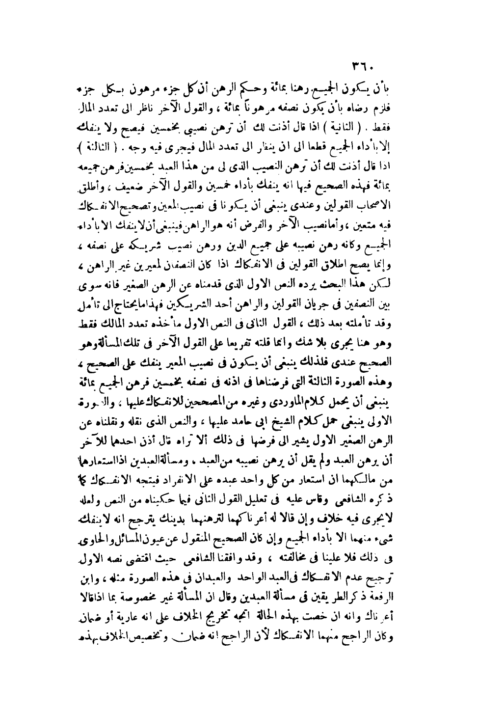 بِأَنْ يَكُونَ الْجَمِيعُ رَهْنًا بِمِائَةٍ، وَحُكْمُ الرَّهْنِ أَنَّ كُلَّ جُزْءٍ مَرْهُونٌ بِكُلِّ جُزْءٍ فَلَزِمَ رِضَاهُ بِأَنْ يَكُونَ نِصْفُهُ مَرْهُونًا بِمِائَةٍ، وَالْقَوْلُ الْآخَرُ نَاظِرٌ إلَى تَعَدُّدِ الْمَالِ فَقَطْ. (الثَّانِيَةُ) : إذَا قَالَ: أَذِنَتْ لَك أَنْ تَرْهَنَ نَصِيبِي بِخَمْسِينَ فَيَصِحُّ، وَلَا يَنْفَكُّ إلَّا بِأَدَاءِ الْجَمِيعِ قَطْعًا إلَى أَنْ يَنْظُرَ إلَى تَعَدُّدِ الْمَالِ فَيَجْرِي فِيهِ وَجْهٌ. (الثَّالِثَةُ) : إذَا قَالَ: أَذِنْت لَك أَنْ تَرْهَنَ النَّصِيبَ الَّذِي لِي مِنْ هَذَا الْعَبْدِ بِخَمْسِينَ فَرَهَنَ جَمِيعَهُ بِمِائَةٍ، فَهَذِهِ الصَّحِيحُ فِيهَا أَنَّهُ يَنْفَكُّ بِأَدَاءِ خَمْسِينَ، وَالْقَوْلُ الْآخَرُ ضَعِيفٌ، وَأَطْلَقَ الْأَصْحَابُ الْقَوْلَيْنِ، وَعِنْدِي يَنْبَغِي أَنْ يَكُونَا فِي نَصِيبِ الْمُعَيِّنِ، وَتَصْحِيحُ الِانْفِكَاكِ فِيهِ مُتَعَيِّنٌ، وَأَمَّا نَصِيبُ الْآخَرِ، وَالْفَرْضُ أَنَّهُ هُوَ الرَّاهِنُ فَيَنْبَغِي أَنْ لَا يَنْفَكَّ إلَّا بِأَدَاءِ الْجَمِيعِ، وَكَأَنَّهُ رَهَنَ نَصِيبَهُ عَلَى جَمِيعِ الدَّيْنِ، وَرَهَنَ نَصِيبَ شَرِيكِهِ عَلَى نِصْفِهِ، وَإِنَّمَا يَصِحُّ إطْلَاقُ الْقَوْلَيْنِ فِي الِانْفِكَاكِ إذَا كَانَ النِّصْفَانِ لِمُعِيرَيْنِ غَيْرَ الرَّاهِنِ، لَكِنَّ هَذَا الْبَحْثَ يَرُدُّهُ النَّصُّ الْأَوَّلُ الَّذِي قَدَّمْنَاهُ عَنْ الرَّهْنِ الصَّغِيرِ فَإِنَّهُ سَوَّى بَيْنَ النِّصْفَيْنِ فِي جَرَيَانِ الْقَوْلَيْنِ، وَالرَّاهِنُ أَحَدُ الشَّرِيكَيْنِ فَهَذَا مَا يَحْتَاجُ إلَى تَأَمُّلٍ، وَقَدْ تَأَمَّلْته بَعْدَ ذَلِكَ، الْقَوْلُ الثَّانِي فِي النَّصِّ الْأَوَّلِ مَأْخَذُهُ تَعَدُّدُ الْمَالِكِ فَقَطْ، وَهُوَ هُنَا يَجْرِي بِلَا شَكٍّ، وَإِنَّمَا قُلْته تَفْرِيعًا عَلَى الْقَوْلِ الْآخَرِ فِي تِلْكَ الْمَسْأَلَةِ، وَهُوَ الصَّحِيحُ عِنْدِي فَلِذَلِكَ يَنْبَغِي أَنْ يَكُونَ فِي نَصِيبِ الْمُعِيرِ يَنْفَكُّ عَلَى الصَّحِيحِ، وَهَذِهِ الصُّورَةُ الثَّالِثَةُ الَّتِي فَرَضْنَاهَا فِي إذْنِهِ فِي نِصْفِهِ بِخَمْسِينَ فَرَهْنُ الْجَمِيعِ بِمِائَةٍ يَنْبَغِي أَنْ يَحْمِلَ كَلَامَ الْمَاوَرْدِيِّ، وَغَيْرِهِ مِنْ الْمُصَحَّحِينَ لِلِانْفِكَاكِ عَلَيْهَا.