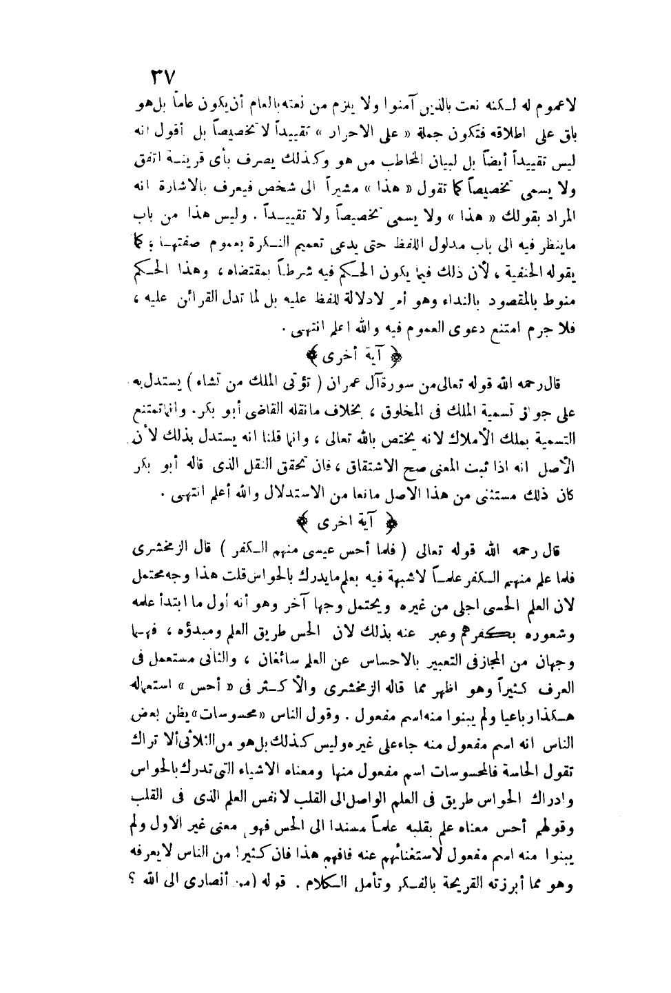 قَالَ - رَحِمَهُ اللَّهُ - قَوْله تَعَالَى مِنْ سُورَةِ آلِ عِمْرَانَ {تُؤْتِي الْمُلْكَ مَنْ تَشَاءُ} [آل عمران: 26] يَسْتَدِلُّ بِهِ عَلَى جَوَازِ تَسْمِيَةِ الْمِلْكِ فِي الْمَخْلُوقِ، بِخِلَافِ مَا نَقَلَهُ الْقَاضِي أَبُو بَكْرٍ. وَإِنَّمَا تَمْتَنِعُ التَّسْمِيَةُ بِمَلِكِ الْأَمْلَاكِ لِأَنَّهُ يَخْتَصُّ بِاَللَّهِ تَعَالَى، وَإِنَّمَا قُلْنَا أَنَّهُ يَسْتَدِلُّ بِذَلِكَ لِأَنَّ الْأَصْلَ أَنَّهُ إذَا ثَبَتَ الْمَعْنَى صَحَّ الِاشْتِقَاقُ، فَإِنَّ تَحَقُّقَ النَّقْلِ الَّذِي قَالَهُ أَبُو بَكْرٍ كَانَ ذَلِكَ مُسْتَثْنًى مِنْ هَذَا الْأَصْلِ مَانِعًا مِنْ الِاسْتِدْلَالِ وَاَللَّهُ أَعْلَمُ انْتَهَى.