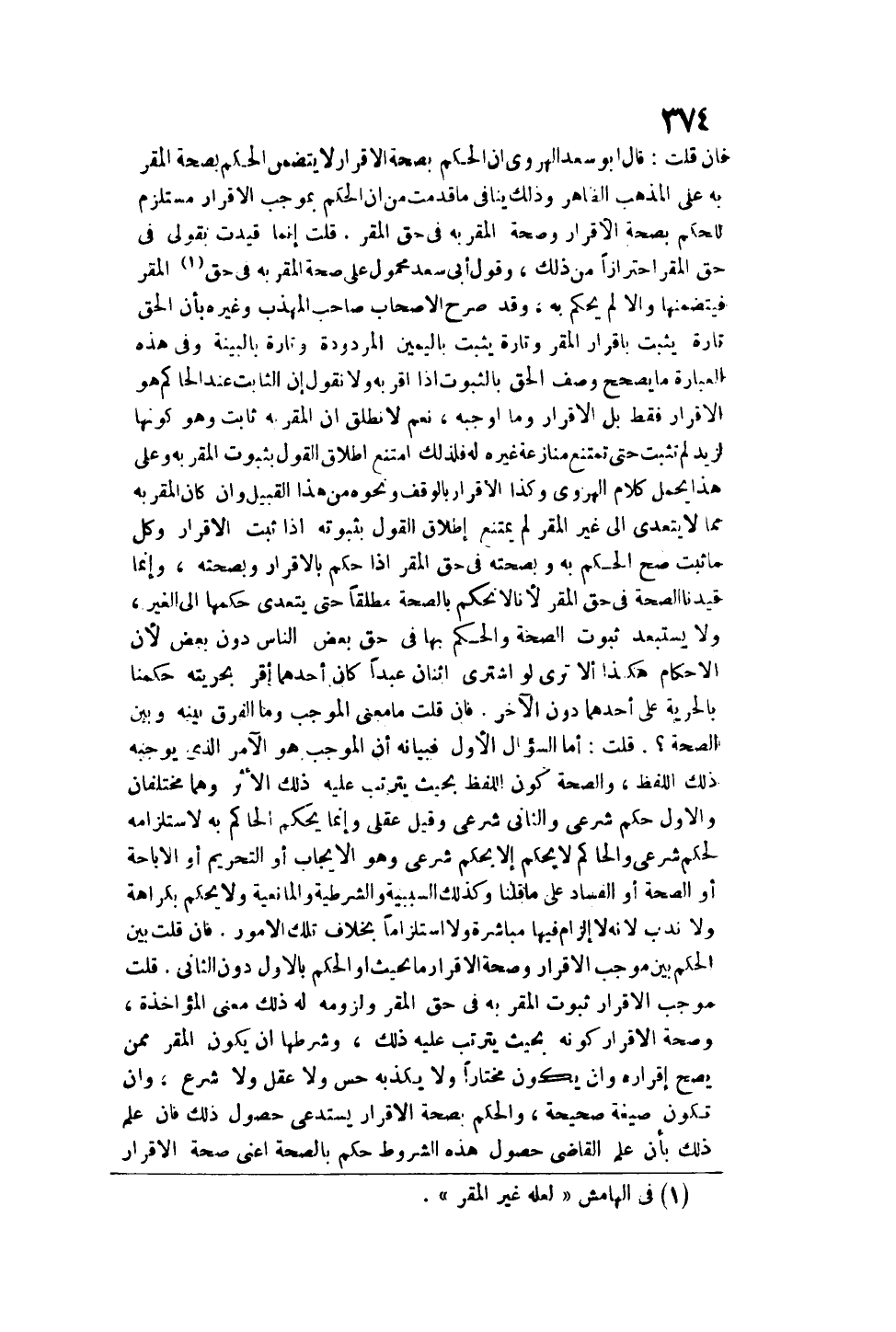 فَإِنْ قُلْت: قَالَ أَبُو سَعْدٍ الْهَرَوِيُّ: إنَّ الْحُكْمَ بِصِحَّةِ الْإِقْرَارِ لَا يَتَضَمَّنُ الْحُكْمَ بِصِحَّةِ الْمُقَرِّ بِهِ عَلَى الْمَذْهَبِ الظَّاهِرِ، وَذَلِكَ يُنَافِي مَا قَدَّمْت مِنْ أَنَّ الْحُكْمَ بِمُوجَبِ الْإِقْرَارِ مُسْتَلْزِمٌ لِلْحُكْمِ بِصِحَّةِ الْإِقْرَارِ، وَصِحَّةِ الْمُقَرِّ بِهِ فِي حَقِّ الْمُقِرِّ. قُلْت: إنَّمَا قَيَّدْت بِقَوْلِي فِي حَقِّ الْمُقِرِّ احْتِرَازًا مِنْ ذَلِكَ، وَقَوْلُ أَبِي سَعْدٍ مَحْمُولٌ عَلَى صِحَّةِ الْمُقَرِّ بِهِ فِي حَقِّ الْمُقِرِّ فَيَتَضَمَّنُهَا، وَإِلَّا لَمْ يَحْكُمْ بِهِ، وَقَدْ صَرَّحَ الْأَصْحَابُ صَاحِبُ الْمُهَذَّبِ، وَغَيْرُهُ بِأَنَّ الْحَقَّ تَارَةً يَثْبُتُ بِإِقْرَارِ الْمُقِرِّ، وَتَارَةً يَثْبُتُ بِالْيَمِينِ الْمَرْدُودَةِ، وَتَارَةً بِالْبَيِّنَةِ، وَفِي هَذِهِ الْعِبَارَةِ مَا يُصَحِّحُ وَصْفَ الْحَقِّ بِالثُّبُوتِ إذَا أُقِرَّ بِهِ، وَلَا نَقُولُ: إنَّ الثَّابِتَ عِنْدَ الْحَاكِمِ هُوَ الْإِقْرَارُ فَقَطْ بَلْ الْإِقْرَارُ وَمَا أَوْجَبَهُ، نَعَمْ لَا نُطْلِقُ أَنَّ الْمُقَرَّ بِهِ ثَابِتٌ، وَهُوَ كَوْنُهَا لِزَيْدٍ لَمْ تَثْبُتْ حَتَّى تَمْتَنِعَ مُنَازَعَةُ غَيْرِهِ لَهُ فَلِذَلِكَ امْتَنَعَ إطْلَاقُ الْقَوْلِ بِثُبُوتِ الْمُقَرِّ بِهِ، وَعَلَى هَذَا يُحْمَلُ كَلَامُ الْهَرَوِيِّ وَكَذَا الْإِقْرَارُ بِالْوَقْفِ وَنَحْوِهِ مِنْ هَذَا الْقَبِيلِ، وَإِنْ كَانَ الْمُقَرُّ بِهِ مِمَّا لَا يَتَعَدَّى إلَى غَيْرِ الْمُقِرِّ لَمْ يَمْتَنِعْ إطْلَاقُ الْقَوْلِ بِثُبُوتِهِ إذَا ثَبَتَ الْإِقْرَارُ، وَكُلُّ مَا ثَبَتَ صَحَّ الْحُكْمُ بِهِ وَبِصِحَّتِهِ فِي حَقِّ الْمُقِرِّ إذَا حَكَمَ بِالْإِقْرَارِ وَبِصِحَّتِهِ، وَإِنَّمَا قَيَّدْنَا الصِّحَّةَ فِي حَقِّ الْمُقِرِّ؛ لِأَنَّا لَا نَحْكُمُ بِالصِّحَّةِ مُطْلَقًا حَتَّى يَتَعَدَّى حُكْمُهَا إلَى الْغَيْرِ، وَلَا يُسْتَبْعَدُ ثُبُوتُ الصِّحَّةِ وَالْحُكْمُ بِهَا فِي حَقِّ بَعْضِ النَّاسِ دُونَ بَعْضٍ؛ لِأَنَّ الْأَحْكَامَ هَكَذَا أَلَا تَرَى لَوْ اشْتَرَى اثْنَانِ عَبْدًا كَانَ أَحَدُهُمَا أَقَرَّ بِحُرِّيَّتِهِ حَكَمْنَا بِالْحُرِّيَّةِ عَلَى أَحَدِهِمَا دُونَ الْآخَرِ.