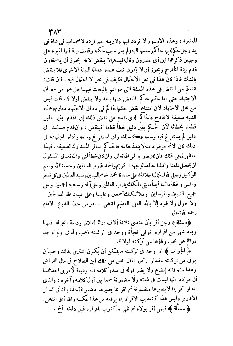 فَهَذَا مَا ظَهَرَ لِي فِي ذَلِكَ، فَإِنْ كَانَ صَوَابًا فَمِنْ اللَّهِ تَعَالَى، وَإِنْ كَانَ خَطَأً فَمِنِّي وَاَللَّهُ تَعَالَى الْمَسْئُولُ أَنْ يَجْعَلَ عِلْمَنَا وَعَمَلَنَا خَالِصًا لِوَجْهِهِ الْكَرِيمِ، وَالْحَمْدُ لِلَّهِ رَبِّ الْعَالَمِينَ وَحَسْبُنَا اللَّهُ وَنِعْمَ الْوَكِيلُ وَصَلَّى اللَّهُ لِكَمَالِ إجْلَالِك عَلَى سَيِّدِنَا مُحَمَّدٍ خَاتَمِ النَّبِيِّينَ وَسَيِّدِ الْعَالَمِينَ فِي كُلِّ نَسِيمٍ وَنَفَسٍ وَلَحْظَةٍ دَائِمًا أَبَدًا مَا بَقِيَ مُلْكُك يَا رَبَّ الْعَالَمِينَ وَعَلَى آلِهِ وَصَحْبِهِ أَجْمَعِينَ وَعَلَى جَمِيعِ النَّبِيِّينَ، وَالْمُرْسَلِينَ وَمَلَائِكَتِك أَجْمَعِينَ وَعَلَيْنَا وَعَلَى عِبَادِ اللَّهِ الصَّالِحِينَ وَلَا حَوْلَ وَلَا قُوَّةَ إلَّا بِاَللَّهِ الْعَلِيِّ الْعَظِيمِ انْتَهَى. نُقِلَ مِنْ خَطِّ الشَّيْخِ الْإِمَامِ - رَحِمَهُ اللَّهُ تَعَالَى -.