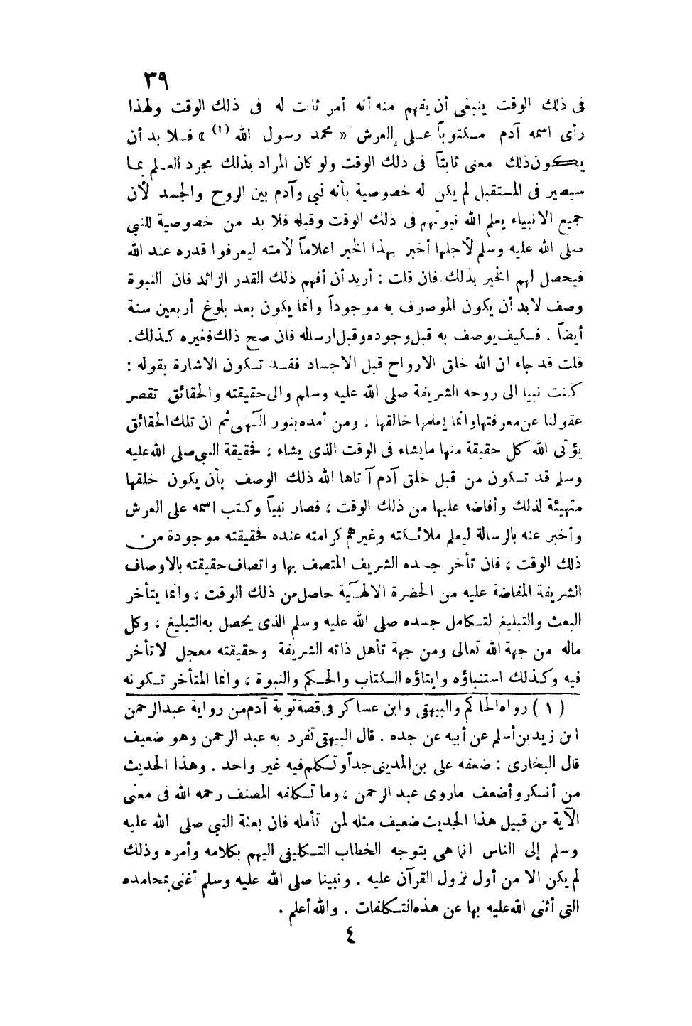 فِي ذَلِكَ الْوَقْتِ يَنْبَغِي أَنْ يُفْهَمَ مِنْهُ أَنَّهُ أَمْرٌ ثَابِتٌ لَهُ فِي ذَلِكَ الْوَقْتِ وَلِهَذَا «رَأَى اسْمَهُ آدَم مَكْتُوبًا عَلَى الْعَرْشِ مُحَمَّدٌ رَسُولُ اللَّهِ» فَلَا بُدَّ أَنْ يَكُونَ ذَلِكَ مَعْنًى ثَابِتًا فِي ذَلِكَ الْوَقْتِ وَلَوْ كَانَ الْمُرَادُ بِذَلِكَ مُجَرَّدَ الْعِلْمِ بِمَا سَيَصِيرُ فِي الْمُسْتَقْبَلِ لَمْ يَكُنْ لَهُ خُصُوصِيَّةٌ بِأَنَّهُ نَبِيٌّ وَآدَمُ بَيْنَ الرُّوحِ وَالْجَسَدِ لِأَنَّ جَمِيعَ الْأَنْبِيَاءِ يَعْلَمُ اللَّهُ نُبُوَّتَهُمْ فِي ذَلِكَ الْوَقْتِ وَقَبْلَهُ فَلَا بُدَّ مِنْ خُصُوصِيَّةٍ لِلنَّبِيِّ - صَلَّى اللَّهُ عَلَيْهِ وَسَلَّمَ - لِأَجْلِهَا أَخْبَرَ بِهَذَا الْخَبَرِ إعْلَامًا لِأُمَّتِهِ لِيَعْرِفُوا قَدْرَهُ عِنْدَ اللَّهِ فَيَحْصُلُ لَهُمْ الْخَيْرُ بِذَلِكَ. فَإِنْ قُلْتَ: أُرِيدُ أَنْ أَفْهَمَ ذَلِكَ الْقَدْرَ الزَّائِدَ فَإِنَّ النُّبُوَّةَ وَصْفٌ لَا بُدَّ أَنْ يَكُونَ الْمَوْصُوفُ بِهِ مَوْجُودًا وَإِنَّمَا يَكُونُ بَعْدَ بُلُوغِ أَرْبَعِينَ سَنَةً أَيْضًا. فَكَيْفَ يُوصَفُ بِهِ قَبْلَ وُجُودِهِ وَقَبْلَ إرْسَالِهِ فَإِنْ صَحَّ ذَلِكَ فَغَيْرُهُ كَذَلِكَ.
