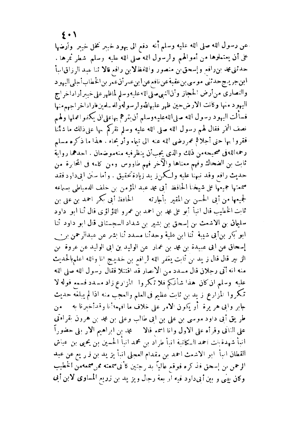 وَحَدَّثَنَا مُسَدَّدٌ ثنا بِشْرٌ عَنْ عَبْدِ الرَّحْمَنِ بْنِ إِسْحَاقَ عَنْ أَبِي عُبَيْدَةَ بْنِ مُحَمَّدِ بْنِ عَمَّارٍ عَنْ الْوَلِيدِ بْنِ أَبِي الْوَلِيدِ عَنْ عُرْوَةَ بْنِ الزُّبَيْرِ قَالَ: «قَالَ زَيْدُ بْنُ ثَابِتٍ يَغْفِرُ اللَّهُ لِرَافِعِ بْنِ خَدِيجٍ أَنَا وَاَللَّهُ أَعْلَمُ بِالْحَدِيثِ مِنْهُ أَنَّهُ أَتَى رَجُلَانِ قَالَ مُسَدَّدٌ مِنْ الْأَنْصَارِ قَدْ اقْتَتَلَا فَقَالَ رَسُولُ اللَّهِ - صَلَّى اللَّهُ عَلَيْهِ وَسَلَّمَ -: إنْ كَانَ هَذَا شَأْنَكُمْ فَلَا تُكْرُوا الْمَزَارِعَ» زَادَ مُسَدَّدٌ فَسَمِعَ قَوْلَهُ: لَا تُكْرُوا الْمَزَارِعَ زَيْدُ بْنُ ثَابِتٍ عَظِيمٌ فِي الْعِلْمِ، وَالْعَجَبُ مِنْهُ إذَا لَمْ يَبْلُغْهُ حَدِيثُ جَابِرٍ وَأَبِي هُرَيْرَةَ، أَوْ يَكُونُ الْأَمْرُ عَلَى خِلَافِ مَا أَفْهَمُهُ أَنَا، وَقَدْ أَخْبَرَنَا بِهِ مِنْ طَرِيقِ أَبِي دَاوُد مُوسَى بْنِ عَلِيِّ بْنِ أَبِي طَالِبٍ وَعَلِيِّ بْنِ مُحَمَّدِ بْنِ هَارُونَ بِقِرَاءَتِي عَلَى الثَّانِي وَقَرَأَهُ عَلَى الْأَوَّلِ وَأَنَا أَسْمَعُ قَالَا مُحَمَّدُ بْنُ إبْرَاهِيمَ الْإِرْبِلِيُّ حُضُورًا أَنْبَأَ شُهْدَةُ بِنْتُ أَحْمَدَ الْكَاتِبَةُ أَنْبَأَ طِرَادُ بْنُ مُحَمَّدٍ أَنْبَأَ الْحُسَيْنُ بْنُ يَحْيَى بْنِ عَيَّاشٍ الْقَطَّانُ أَنْبَأَ أَبُو الْأَشْعَثِ أَحْمَدُ بْنُ مِقْدَامٍ الْعِجْلِيُّ أَنْبَأَ يَزِيدُ بْنُ زُرَيْعٍ عَنْ عَبْدِ الرَّحْمَنِ بْنِ إِسْحَاقَ فَذَكَرَهُ فَوَقَعَ عَالِيًا بِدَرَجَتَيْنِ كَأَنِّي سَمِعْته مِمَّنْ سَمِعَهُ مِنْ الْخَطِيبِ وَكَانَ بَيْنِي وَبَيْنَ أَبِي دَاوُد فِيهِ أَرْبَعَةُ رِجَالٍ وَيَزِيدُ بْنُ زُرَيْعٍ الْمُسَاوِي لِابْنِ أَبِي شَيْبَةَ