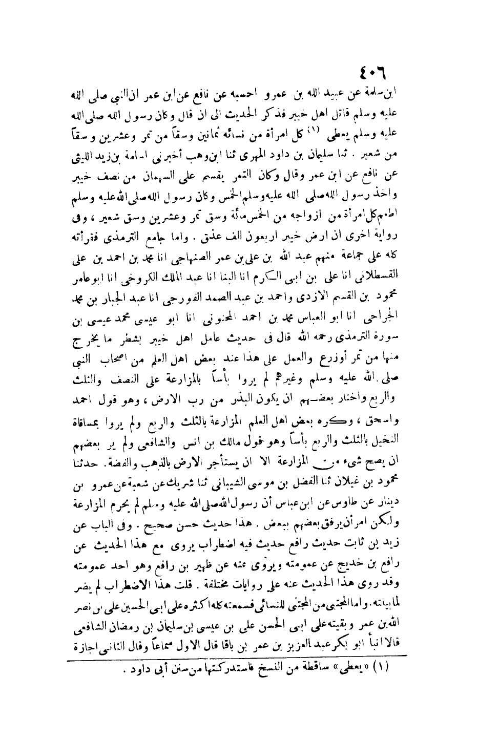 وَفِي رِوَايَةٍ أُخْرَى أَنَّ أَرْضَ خَيْبَرَ أَرْبَعُونَ أَلْفَ عِذْقٍ، أَمَّا جَامِعُ التِّرْمِذِيِّ فَقَرَأْته كُلَّهُ عَلَى جَمَاعَةٍ مِنْهُمْ عَبْدُ اللَّهِ بْنُ عَلِيِّ بْنِ عُمَرَ الصَّنْهَاجِيُّ أَنَا مُحَمَّدُ بْنُ أَحْمَدَ بْنِ عَلِيٍّ الْقَسْطَلَّانِيُّ أَنَا عَلِيُّ بْنُ أَبِي الْكَرَمِ أَنَا الْبَنَّا أَنَا عَبْدُ الْمَلِكِ الْكَرُوخِيُّ أَنَا أَبُو عَامِرٍ مَحْمُودُ بْنُ الْقَاسِمِ الْأَزْدِيُّ وَأَحْمَدُ بْنُ عَبْدِ الصَّمَدِ الْفُورَّجِيُّ أَنَا عَبْدُ الْجَبَّارِ بْنُ مُحَمَّدٍ الْجَرَّاحِيُّ أَنَا أَبُو الْعَبَّاسِ مُحَمَّدُ بْنُ أَحْمَدَ الْمَحْنُونِيُّ أَنَا أَبُو عِيسَى مُحَمَّدٌ عِيسَى بْنُ سُورَةَ التِّرْمِذِيُّ - رَحِمَهُ اللَّهُ - قَالَ فِي حَدِيثٍ «عَامَلَ أَهْلَ خَيْبَرَ بِشَطْرِ مَا يَخْرُجُ مِنْهَا مِنْ تَمْرٍ، أَوْ زَرْعٍ» ، وَالْعَمَلُ عَلَى هَذَا عِنْدَ بَعْضِ أَهْلِ الْعِلْمِ مِنْ أَصْحَابِ النَّبِيِّ - صَلَّى اللَّهُ عَلَيْهِ وَسَلَّمَ - وَغَيْرِهِمْ لَمْ يَرَوْا بَأْسًا بِالْمُزَارَعَةِ عَلَى النِّصْفِ، وَالثُّلُثِ، وَالرُّبْعِ وَاخْتَارَ بَعْضُهُمْ أَنْ يَكُونَ الْبَذْرُ مِنْ رَبِّ الْأَرْضِ، وَهُوَ قَوْلُ أَحْمَدَ وَإِسْحَاقَ، وَكَرِهَ بَعْضُ أَهْلِ الْعِلْمِ الْمُزَارَعَةَ بِالثُّلُثِ، وَالرُّبْعِ وَلَمْ يَرَوْا بِمُسَاقَاةِ النَّخِيلِ بِالثُّلُثِ، وَالرُّبْعِ بَأْسًا، وَهُوَ قَوْلُ مَالِكِ بْنِ أَنَسٍ وَالشَّافِعِيِّ وَلَمْ يَرَ بَعْضُهُمْ أَنْ يَصِحَّ شَيْءٌ مِنْ الْمُزَارَعَةِ إلَّا أَنْ يَسْتَأْجِرَ الْأَرْضَ بِالذَّهَبِ، وَالْفِضَّةِ.