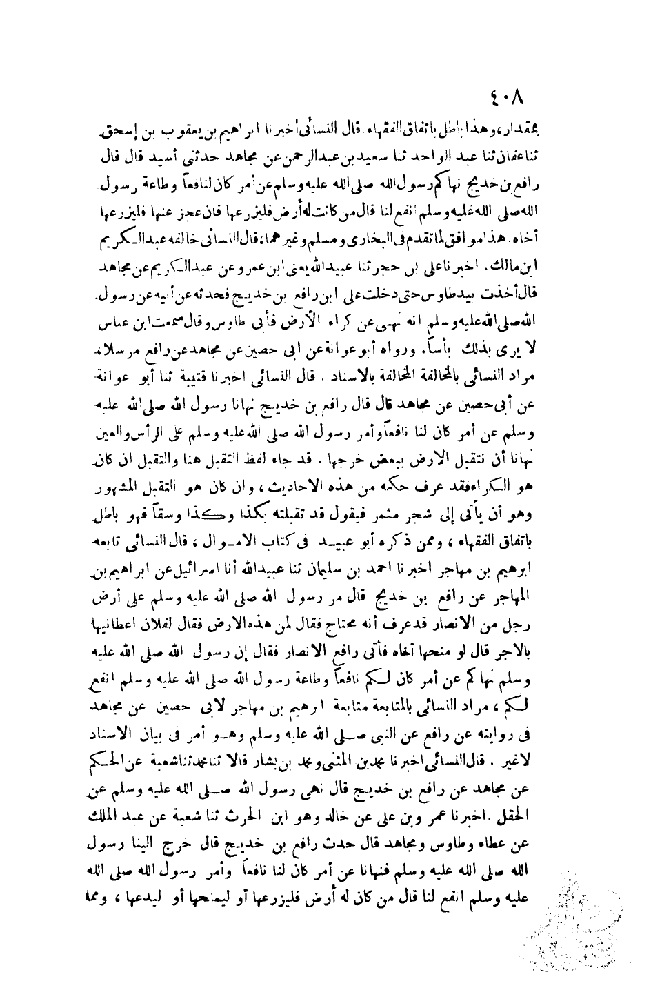 هَذَا مُوَافِقٌ لِمَا تَقَدَّمَ فِي الْبُخَارِيِّ وَمُسْلِمٍ وَغَيْرِهِمَا، قَالَ النَّسَائِيُّ خَالَفَهُ عَبْدُ الْكَرِيمِ بْنُ مَالِكٍ. أَخْبَرَنَا عَلِيُّ بْنُ حُجْرٍ ثنا عُبَيْدُ اللَّهِ يَعْنِي ابْنَ عَمْرٍو عَنْ عَبْدِ الْكَرِيمِ «عَنْ مُجَاهِدٍ قَالَ: أَخَذْت بِيَدِ طَاوُسٍ حَتَّى دَخَلْت عَلَى ابْنِ رَافِعِ بْنِ خَدِيجٍ فَحَدَّثَهُ عَنْ أَبِيهِ عَنْ رَسُولِ اللَّهِ - صَلَّى اللَّهُ عَلَيْهِ وَسَلَّمَ - أَنَّهُ نَهَى عَنْ كِرَاءِ الْأَرْضِ فَأَبَى طَاوُسٌ، وَقَالَ: سَمِعْت ابْنَ عَبَّاسٍ لَا يَرَى بِذَلِكَ بَأْسًا» . وَرَوَاهُ أَبُو عَوَانَةَ عَنْ أَبِي حُصَيْنٍ عَنْ مُجَاهِدٍ عَنْ رَافِعٍ مُرْسَلًا، مُرَادُ النَّسَائِيّ بِالْمُخَالَفَةِ الْمُخَالَفَةُ بِالْإِسْنَادِ. قَالَ النَّسَائِيُّ: أَخْبَرَنَا قُتَيْبَةُ ثنا أَبُو عَوَانَةَ عَنْ أَبِي حُصَيْنٍ عَنْ مُجَاهِدٍ قَالَ: قَالَ رَافِعُ بْنُ خَدِيجٍ «نَهَانَا رَسُولُ اللَّهِ - صَلَّى اللَّهُ عَلَيْهِ وَسَلَّمَ - عَنْ أَمْرٍ كَانَ لَكُمْ نَافِعًا: وَأَمْرُ رَسُولِ اللَّهِ - صَلَّى اللَّهُ عَلَيْهِ وَسَلَّمَ - عَلَى الرَّأْسِ، وَالْعَيْنِ نَهَانَا أَنْ نَتَقَبَّلَ الْأَرْضَ بِبَعْضِ خَرْجِهَا» .