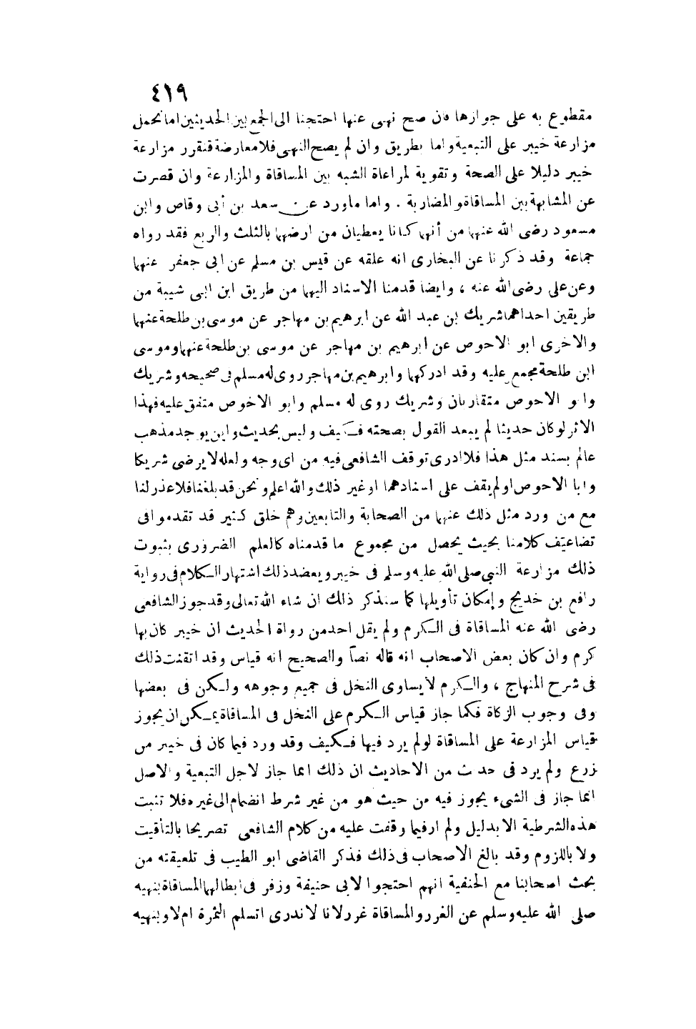 فَهَذَا الْأَثَرُ لَوْ كَانَ حَدِيثًا لَمْ يَبْعُدْ الْقَوْلُ بِصِحَّتِهِ فَكَيْفَ وَلَيْسَ بِحَدِيثٍ وَأَيْنَ يُوجَدُ مَذْهَبُ عَالِمٍ بِسَنَدٍ مِثْلِ هَذَا فَلَا أَدْرِي تَوَقَّفَ الشَّافِعِيُّ فِيهِ مِنْ أَيِّ وَجْهٍ وَلَعَلَّهُ لَا يَرْضَى شَرِيكًا وَأَبَا الْأَحْوَصِ، أَوْ لَمْ يَقِفْ عَلَى إسْنَادِهِمَا، أَوْ غَيْرَ ذَلِكَ وَاَللَّهُ أَعْلَمُ وَنَحْنُ قَدْ بَلَغَنَا فَلَا عُذْرَ لَنَا مَعَ مَنْ وَرَدَ مِثْلُ ذَلِكَ عَنْهُمَا مِنْ الصَّحَابَةِ، وَالتَّابِعِينَ وَهُمْ خَلْقٌ كَثِيرٌ قَدْ تَقَدَّمُوا فِي تَضَاعِيفِ كَلَامِنَا بِحَيْثُ يَحْصُلُ مِنْ مَجْمُوعِ مَا قَدَّمْنَاهُ كَالْعِلْمِ الضَّرُورِيِّ بِثُبُوتِ ذَلِكَ مُزَارَعَةُ النَّبِيِّ - صَلَّى اللَّهُ عَلَيْهِ وَسَلَّمَ - فِي خَيْبَرَ وَيَعْضُدُ ذَلِكَ اشْتِهَارُ الْكَلَامِ فِي رِوَايَةِ رَافِعِ بْنِ خَدِيجٍ وَإِمْكَانُ تَأْوِيلِهَا كَمَا سَنَذْكُرُ ذَلِكَ إنْ شَاءَ اللَّهُ تَعَالَى.