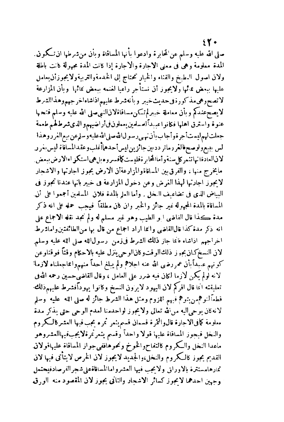 - صَلَّى اللَّهُ عَلَيْهِ وَسَلَّمَ - عَنْ الْمُخَابَرَةِ وَادَّعَوْا بِأَنَّهَا الْمُسَاقَاةُ وَبِأَنَّ مِنْ شَرْطِهَا أَنْ تَكُونَ الْمُدَّةُ مَعْلُومَةً، وَهِيَ فِي مَعْنَى الْإِجَارَةِ، وَالْإِجَارَةُ إذَا كَانَتْ الْمُدَّةُ مَجْهُولَةً كَانَتْ بَاطِلَةً وَلِأَنَّ أُصُولَ الْبِطِّيخِ، وَالْقِثَّاءِ، وَالْخِيَارِ تَحْتَاجُ إلَى الْخِدْمَةِ، وَالتَّرْبِيَةِ وَلَا يَجُوزُ أَنْ يُعَامَلَ عَلَيْهَا بِبَعْضِ نَمَائِهَا وَلَا يَجُوزُ أَنْ نَسْتَأْجِرَ رَاعِيًا لِغَنَمِهِ بِبَعْضِ نَمَائِهَا وَبِأَنَّ الْمُزَارَعَةَ لَا تَصِحُّ، وَهِيَ مَذْكُورَةٌ فِي حَدِيثِ خَيْبَرَ وَبِأَنَّهُ شَرَطَ عَلَيْهِمْ إذَا شَاءَ أَخْرَجَهُمْ.