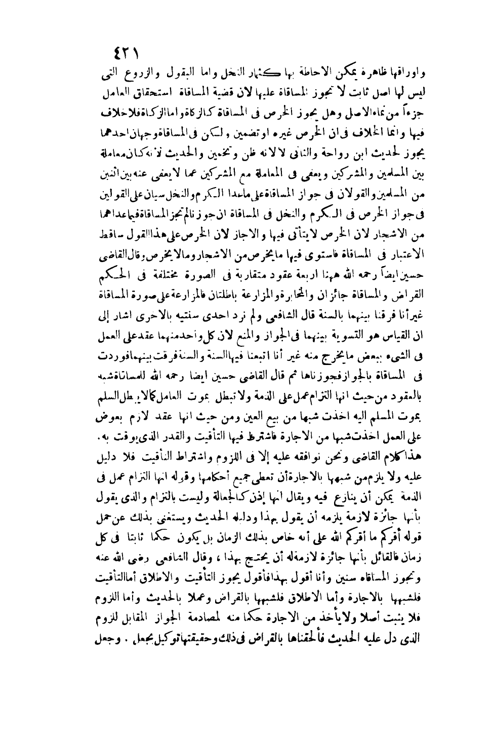 هَذَا كَلَامُ الْقَاضِي وَنَحْنُ نُوَافِقُهُ عَلَيْهِ إلَّا فِي اللُّزُومِ وَاشْتِرَاطِ التَّأْقِيتِ فَلَا دَلِيلَ عَلَيْهِ وَلَا يَلْزَمُ مِنْ شَبَهِهَا بِالْإِجَارَةِ أَنْ تُعْطَى جَمِيعَ أَحْكَامِهَا، وَقَوْلُهُ: إنَّهَا الْتِزَامُ عَمَلٍ فِي الذِّمَّةِ يُمْكِنُ أَنْ يُنَازَعَ فِيهِ وَيُقَالُ: إنَّهَا إذْنٌ كَالْجَعَالَةِ وَلَيْسَتْ بِالْتِزَامٍ وَاَلَّذِي يَقُولُ بِأَنَّهَا جَائِزَةٌ لَازِمَةٌ يَلْزَمُهُ أَنْ يَقُولَ بِهَذَا وَدَلِيلُهُ الْحَدِيثُ وَيُسْتَغْنَى بِذَلِكَ عَنْ حَمْلِ قَوْلِهِ: «أُقِرُّكُمْ مَا أَقَرَّكُمْ اللَّهُ» عَلَى أَنَّهُ خَاصٌّ بِذَلِكَ الزَّمَانِ بَلْ يَكُونُ حُكْمًا ثَابِتًا فِي كُلِّ زَمَانٍ فَالْقَائِلُ بِأَنَّهَا لَازِمَةٌ لَهُ أَنْ يَحْتَجَّ بِهَذَا.
