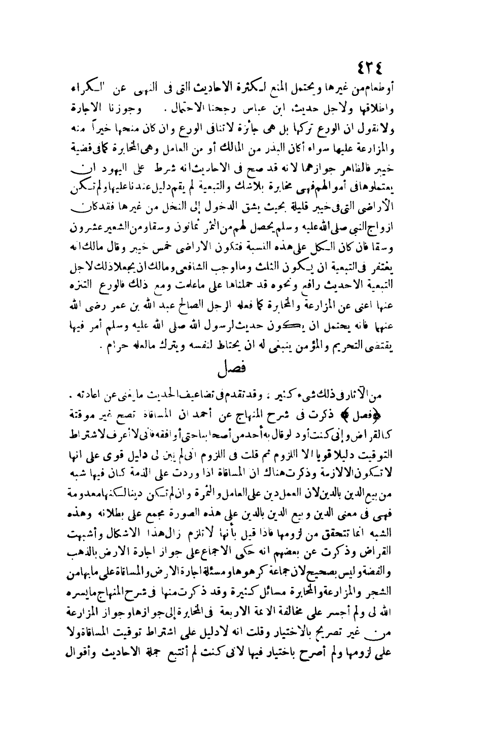 (فَصْلٌ) ذَكَرْتُ فِي شَرْحِ الْمِنْهَاجِ عَنْ أَحْمَدَ أَنَّ الْمُسَاقَاةَ تَصِحُّ غَيْرَ مُوَقَّتَةٍ كَالْقِرَاضِ وَإِنِّي كُنْتُ أَوَدُّ لَوْ قَالَ بِهِ أَحَدٌ مِنْ أَصْحَابِنَا حَتَّى أُوَافِقَهُ فَإِنِّي لَا أَعْرِفُ لِاشْتِرَاطِ التَّوْقِيتِ دَلِيلًا قَوِيًّا إلَّا اللُّزُومَ ثُمَّ قُلْتُ فِي اللُّزُومِ: إنِّي لَمْ يَبِنْ لِي دَلِيلٌ قَوِيٌّ عَلَى أَنَّهَا لَا تَكُونُ إلَّا لَازِمَةً وَذَكَرْتُ هُنَاكَ أَنَّ الْمُسَاقَاةَ إذَا وَرَدَتْ عَلَى الذِّمَّةِ كَانَ فِيهَا شَبَهٌ مِنْ بَيْعِ الدَّيْنِ بِالدَّيْنِ؛ لِأَنَّ الْعَمَلَ دَيْنٌ عَلَى الْعَامِلِ، وَالثَّمَرَةُ، وَإِنْ لَمْ تَكُنْ دَيْنًا لَكِنَّهَا مَعْدُومَةٌ فَهِيَ فِي مَعْنَى الدَّيْنِ وَبَيْعُ الدَّيْنِ بِالدَّيْنِ عَلَى هَذِهِ الصُّورَةِ مُجْمَعٌ عَلَى بُطْلَانِهِ وَهَذِهِ الشُّبَهُ إنَّمَا تَتَحَقَّقُ مِنْ لُزُومِهَا، فَإِذَا قِيلَ بِأَنَّهَا لَا تَلْزَمُ زَالَ هَذَا الْإِشْكَالُ وَأَشْبَهَتْ الْقِرَاضَ وَذَكَرْت عَنْ بَعْضِهِمْ أَنَّهُ حَكَى الْإِجْمَاعَ عَلَى جَوَازِ إجَارَةِ الْأَرْضِ بِالذَّهَبِ، وَالْفِضَّةِ وَلَيْسَ بِصَحِيحٍ؛ لِأَنَّ جَمَاعَةً كَرِهُوهَا، وَمَسْأَلَةُ إجَارَةِ الْأَرْضِ، وَالْمُسَاقَاةِ عَلَى مَا بِهَا مِنْ الشَّجَرِ، وَالْمُزَارَعَةِ، وَالْمُخَابَرَةِ مَسَائِلُ كَثِيرَةٌ.