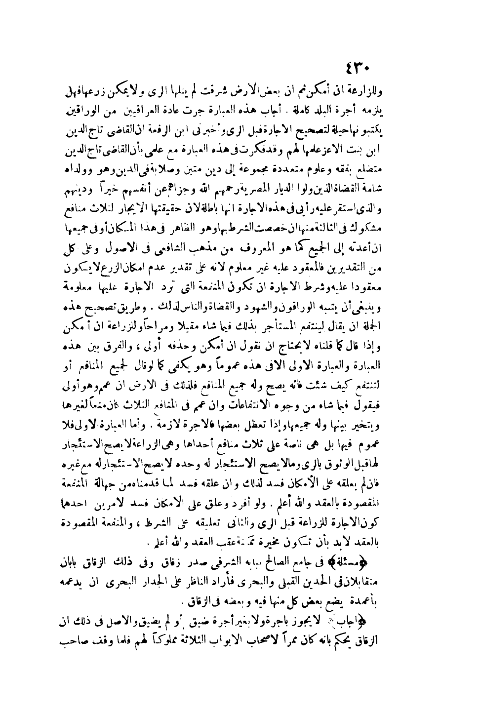 أَجَابَ هَذِهِ الْعِبَارَةُ جَرَتْ عَادَةُ الْعِرَاقِيِّينَ مِنْ الْوَرَّاقِينَ يَكْتُبُونَهَا حِيلَةً لِتَصْحِيحِ الْإِجَارَةِ قَبْلَ الرَّيِّ وَأَخْبَرَنِي ابْنُ الرِّفْعَةِ أَنَّ الْقَاضِيَ تَاجَ الدِّينِ بْنَ بِنْتِ الْأَعَزِّ عَلَّمَهَا لَهُمْ، وَقَدْ فَكَّرْت فِي هَذِهِ الْعِبَارَةِ مَعَ عِلْمِي بِأَنَّ الْقَاضِيَ تَاجَ الدِّينِ مُتَضَلِّعٌ بِفِقْهٍ وَعُلُومٍ مُتَعَدِّدَةٍ مَجْمُوعَةٍ إلَى دِينٍ مَتِينٍ وَصَلَابَةٍ فِي الدِّينِ، وَهُوَ وَوَلَدَاهُ شَامَةُ الْقُضَاةِ الَّذِينَ وُلُّوا الدِّيَارَ الْمِصْرِيَّةَ - رَحِمَهُمُ اللَّهُ - وَجَزَاهُمْ عَنْ أَنْفُسِهِمْ خَيْرًا وَدِينِهِمْ