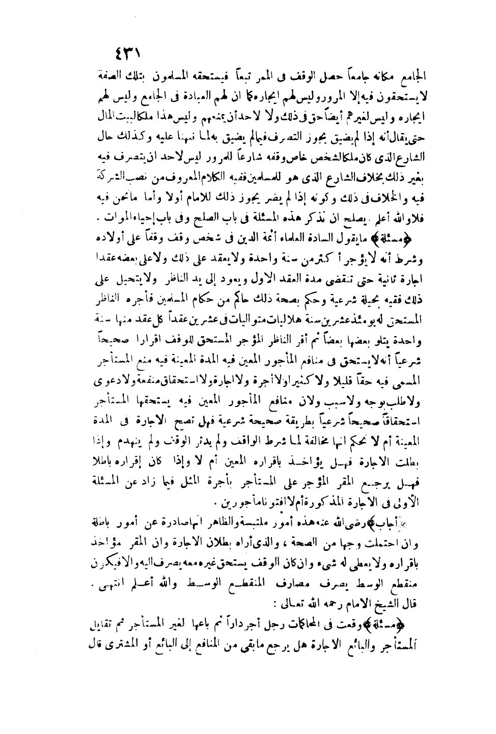 الْجَامِعِ مَكَانَهُ جَامِعًا حَصَلَ الْوَقْفُ فِي الْمَمَرِّ تَبَعًا فَيَسْتَحِقُّهُ الْمُسْلِمُونَ بِتِلْكَ الصِّفَةِ لَا يَسْتَحِقُّونَ فِيهِ إلَّا الْمُرُورَ وَلَيْسَ لَهُمْ إيجَارُهُ كَمَا أَنَّ لَهُمْ الْعِبَادَةَ فِي الْجَامِعِ وَلَيْسَ لَهُمْ إيجَارُهُ وَلَيْسَ لِغَيْرِهِمْ أَيْضًا حَقٌّ فِي ذَلِكَ وَلَا لِأَحَدٍ أَنْ يَمْنَعَهُمْ، وَلَيْسَ هَذَا مِلْكًا لِبَيْتِ الْمَالِ حَتَّى يُقَالَ: إنَّهُ إذَا لَمْ يُضَيِّقْ يَجُوزُ التَّصَرُّفُ فِيمَا لَمْ يُضَيِّقْ بِهِ لِمَا نَبَّهْنَا عَلَيْهِ وَكَذَلِكَ حَالُ الشَّارِعِ الَّذِي كَانَ مِلْكًا لِشَخْصٍ خَاصٍّ وَقَفَهُ شَارِعًا لِلْمُرُورِ لَيْسَ لِأَحَدٍ أَنْ يَتَصَرَّفَ فِيهِ بِغَيْرِ ذَلِكَ بِخِلَافِ الشَّارِعِ الَّذِي هُوَ لِلْمُسْلِمِينَ فَفِيهِ الْكَلَامُ الْمَعْرُوفُ مِنْ نَصْبِ الشَّرِكَةِ فِيهِ، وَالْخِلَافُ فِي ذَلِكَ وَكَوْنُهُ إذَا لَمْ يَضُرَّ يَجُوزُ ذَلِكَ لِلْإِمَامِ أَوَّلًا، وَأَمَّا مَا نَحْنُ فِيهِ فَلَا وَاَللَّهُ أَعْلَمُ، يَصْلُحُ أَنْ نَذْكُرَ هَذِهِ الْمَسْأَلَةَ فِي بَابِ الصُّلْحِ وَفِي بَابِ إحْيَاءِ الْمَوَاتِ.