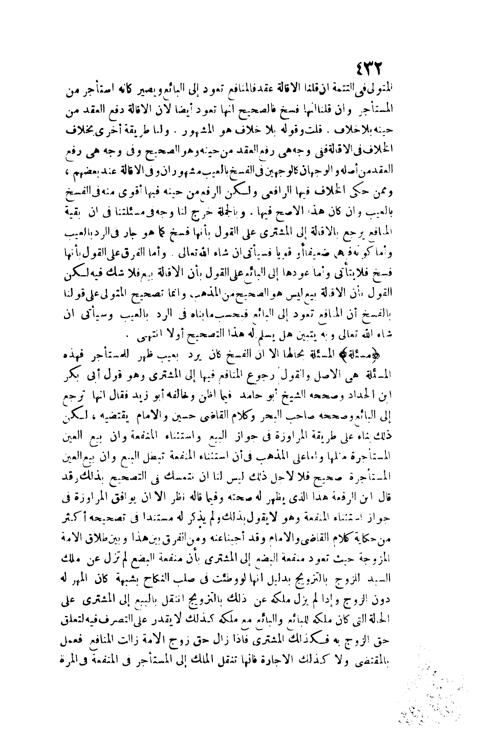 الْمُتَوَلِّي فِي التَّتِمَّةِ إنْ قُلْنَا: الْإِقَالَةُ عَقْدٌ فَالْمَنَافِعُ تَعُودُ إلَى الْبَائِعِ وَيَصِيرُ كَأَنَّهُ اسْتَأْجَرَ مِنْ الْمُسْتَأْجِرِ، وَإِنْ قُلْنَا: إنَّهَا فَسْخٌ فَالصَّحِيحُ أَنَّهَا تَعُودُ أَيْضًا؛ لِأَنَّ الْإِقَالَةَ دَفْعُ الْعَقْدِ مِنْ حِينِهِ بِلَا خِلَافٍ.