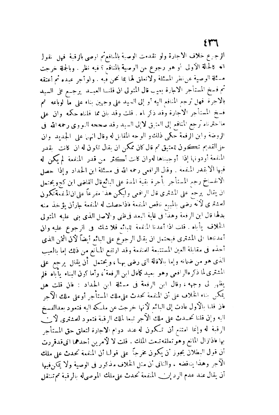 وَقَالَ الرَّافِعِيُّ - رَحِمَهُ اللَّهُ - فِي مَسْأَلَةِ ابْنِ الْحَدَّادِ: وَإِذَا حَصَلَ الِانْفِسَاخُ رَجَعَ الْمُسْتَأْجِرُ بِأُجْرَةِ بَقِيَّةِ الْمُدَّةِ عَلَى الْبَائِعِ قَالَ الْقَاضِي ابْنُ كَجٍّ: وَيُحْتَمَلُ أَنْ يُقَالَ يَرْجِعُ عَلَى الْمُشْتَرِي قَالَ الرَّافِعِيُّ: وَلْيَكُنْ هَذَا مُفَرَّعًا عَلَى أَنَّ الْمَنْفَعَةَ تَكُونُ لِلْمُشْتَرِي؛ لِأَنَّهُ رَضِيَ بِالْمَبِيعِ نَاقِصَ الْمَنْفَعَةِ، فَإِذَا حَصَلَتْ لَهُ الْمَنْفَعَةُ جَازَ أَنْ يُؤْخَذَ مِنْهُ بَدَلُهَا قَالَ ابْنُ الرِّفْعَةِ وَهَذَا فِي غَايَةِ الْبُعْدِ فِي ظَنِّي، وَالْأَصْلُ الَّذِي بَنَى عَلَيْهِ الْمُتَوَلِّي الْخِلَافُ يَأْبَاهُ.