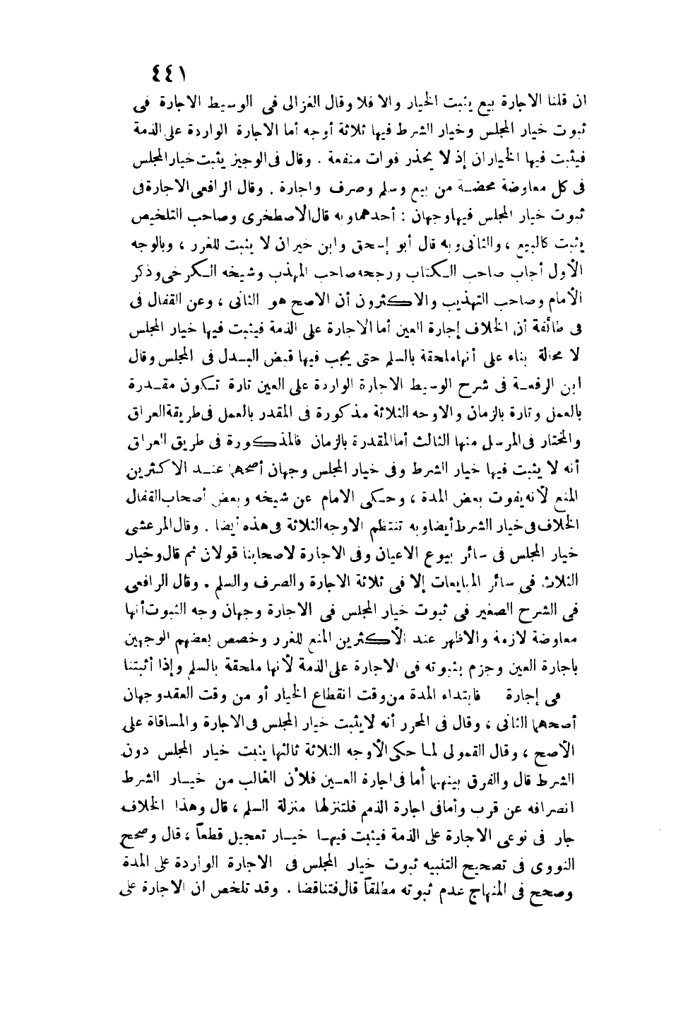 وَقَالَ الرَّافِعِيُّ فِي الشَّرْحِ الصَّغِيرِ فِي ثُبُوتِ خِيَارِ الْمَجْلِسِ فِي الْإِجَارَةِ وَجْهَانِ وَجْهُ الثُّبُوتِ أَنَّهَا مُعَاوَضَةٌ لَازِمَةٌ، وَالْأَظْهَرُ عِنْدَ الْأَكْثَرِينَ الْمَنْعُ لِلْغَرَرِ وَخَصَّصَ بَعْضُهُمْ الْوَجْهَيْنِ بِإِجَارَةِ الْعَيْنِ وَجَزَمَ بِثُبُوتِهِ فِي الْإِجَارَةِ عَلَى الذِّمَّةِ؛ لِأَنَّهَا مُلْحَقَةٌ بِالسَّلَمِ.