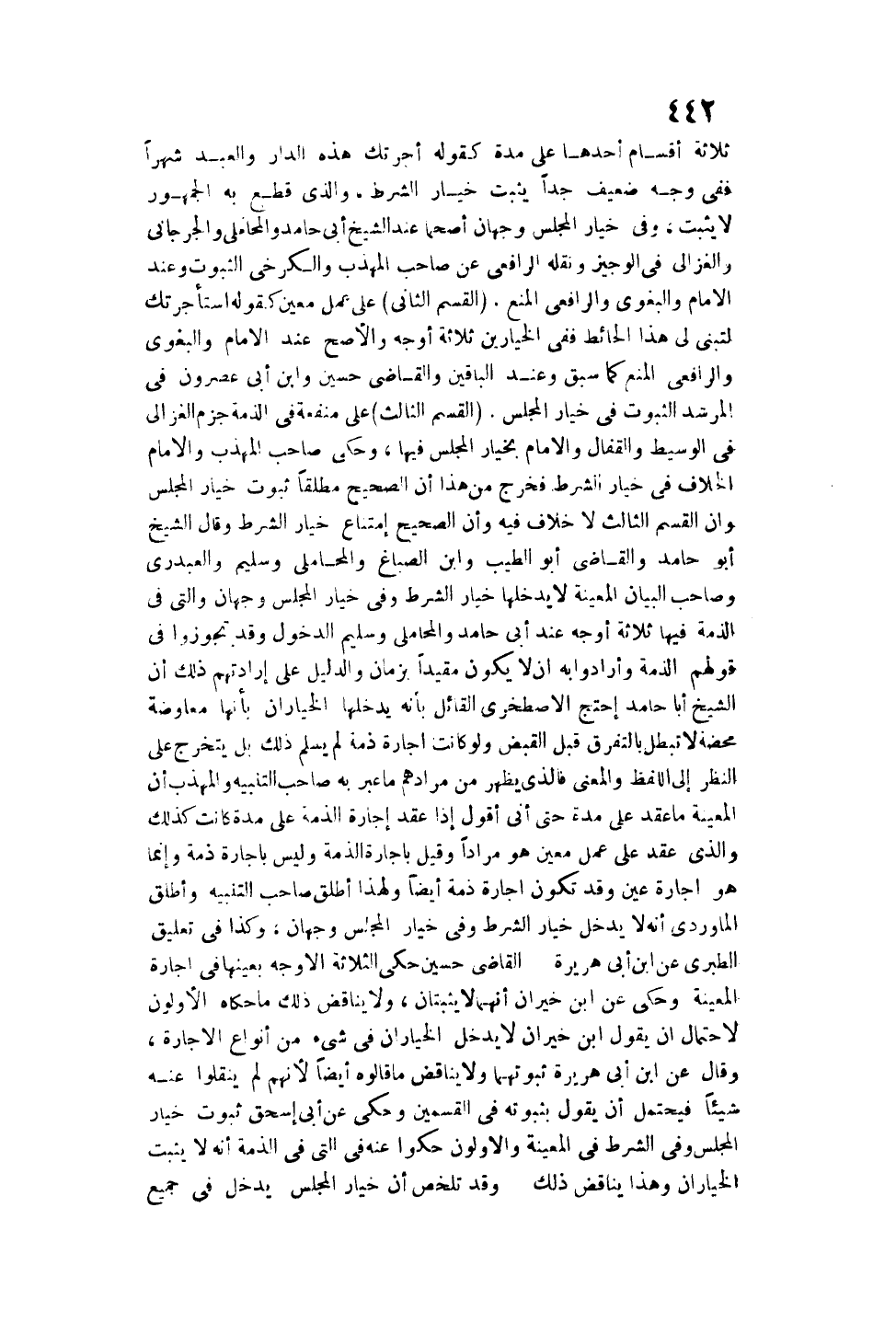 ثَلَاثَةِ أَقْسَامٍ أَحَدُهُمَا عَلَى مُدَّةٍ كَقَوْلِهِ: أَجَّرْتُك هَذِهِ الدَّارَ، وَالْعَبْدَ شَهْرًا، فَفِي وَجْهٍ ضَعِيفٍ جِدًّا يَثْبُتُ خِيَارُ الشَّرْطِ. وَاَلَّذِي قَطَعَ بِهِ الْجُمْهُورُ لَا يَثْبُتُ، وَفِي خِيَارِ الْمَجْلِسِ وَجْهَانِ أَصَحُّهُمَا عِنْدَ الشَّيْخِ أَبِي حَامِدٍ وَالْمَحَامِلِيِّ وَالْجُرْجَانِيِّ وَالْغَزَالِيِّ فِي الْوَجِيزِ وَنَقَلَهُ الرَّافِعِيُّ عَنْ صَاحِبِ الْمُهَذَّبِ وَالْكَرْخِيِّ الثُّبُوتُ وَعِنْدَ الْإِمَامِ الْبَغَوِيِّ وَالرَّافِعِيِّ الْمَنْعُ.