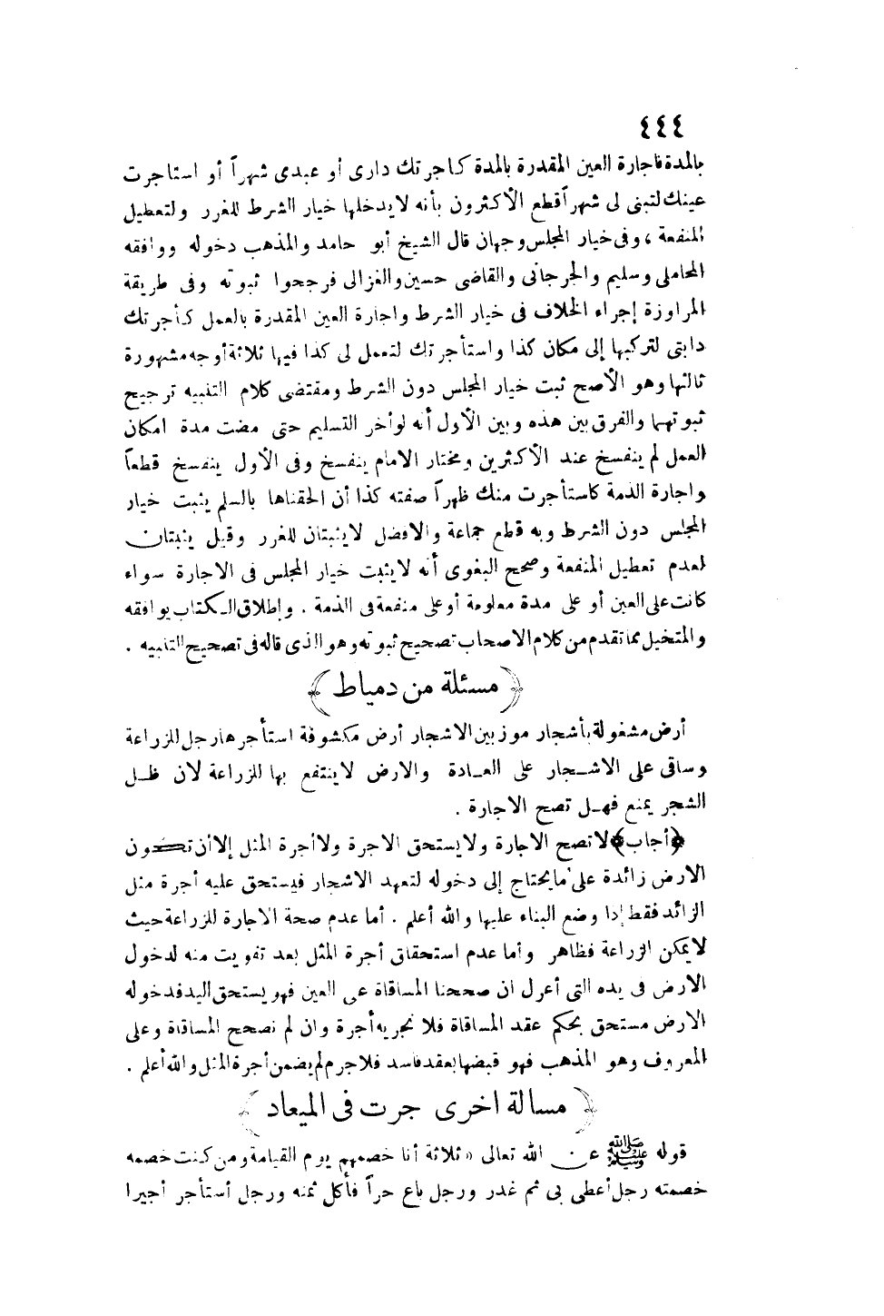 (مَسَائِلُ أُخْرَى جَرَتْ فِي الْمِيعَادِ) قَوْلُهُ - صَلَّى اللَّهُ عَلَيْهِ وَسَلَّمَ - عَنْ اللَّهِ تَعَالَى «ثَلَاثَةٌ أَنَا خَصْمُهُمْ يَوْمَ الْقِيَامَةِ، وَمَنْ كُنْتُ خَصْمَهُ خَصَمْتُهُ: رَجُلٌ أَعْطَى بِي ثُمَّ غَدَرَ وَرَجُلٌ بَاعَ حُرًّا فَأَكَلَ ثَمَنَهُ وَرَجُلٌ اسْتَأْجَرَ أَجِيرًا