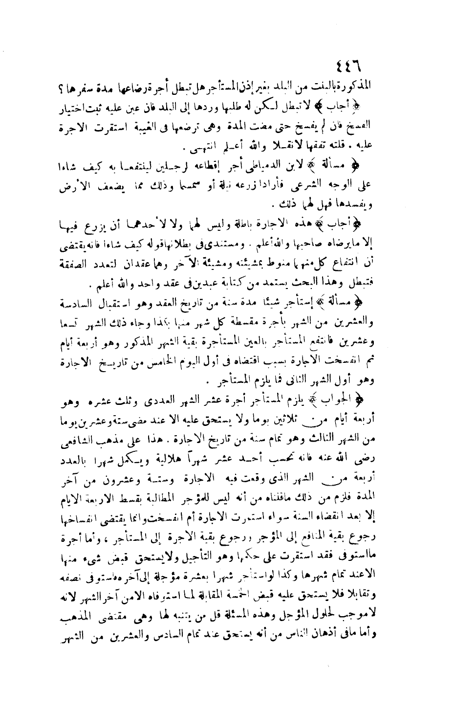 (الْجَوَابُ) يَلْزَمُ الْمُسْتَأْجِرَ أُجْرَةُ عُشْرِ الشَّهْرِ الْعَدَدِيِّ وَثُلُثُ عُشْرِهِ، وَهُوَ أَرْبَعَةُ أَيَّامٍ مِنْ ثَلَاثِينَ يَوْمًا وَلَا يَسْتَحِقُّ عَلَيْهِ إلَّا عِنْدَ مُضِيِّ سِتَّةٍ وَعِشْرِينَ يَوْمًا مِنْ الشَّهْرِ الثَّالِثِ، وَهُوَ تَمَامُ سَنَةٍ مِنْ تَارِيخِ الْإِجَارَةِ. هَذَا عَلَى مَذْهَبِ الشَّافِعِيِّ - رَضِيَ اللَّهُ عَنْهُ - فَإِنَّهُ تُحْسَبُ أَحَدَ عَشَرَ شَهْرًا هِلَالِيَّةً وَيُكْمِلُ شَهْرًا بِالْعَدَدِ أَرْبَعَةٌ مِنْ الشَّهْرِ الَّذِي وَقَعَتْ فِيهِ الْإِجَارَةُ وَسِتَّةٌ وَعِشْرُونَ مِنْ آخِرِ الْمُدَّةِ فَلَزِمَ مِنْ ذَلِكَ مَا قُلْنَاهُ مِنْ أَنَّهُ لَيْسَ لِلْمُؤَجِّرِ الْمُطَالَبَةُ بِقِسْطِ الْأَرْبَعَةِ الْأَيَّامِ إلَّا بَعْدَ انْقِضَاءِ السَّنَةِ سَوَاءٌ اسْتَمَرَّتْ الْإِجَارَةُ أَمْ انْفَسَخَتْ، وَإِنَّمَا يَقْتَضِي انْفِسَاخُهَا رُجُوعَ بَقِيَّةِ الْمَنَافِعِ إلَى الْمُؤَجِّرِ وَرُجُوعَ بَقِيَّةِ الْأُجْرَةِ إلَى الْمُسْتَأْجِرِ، أَمَّا أُجْرَةُ مَا اسْتَوْفَى فَقَدْ اسْتَقَرَّتْ عَلَى حُكْمِهَا، وَهُوَ التَّأْجِيلُ وَلَا يَسْتَحِقُّ قَبْضَ شَيْءٍ مِنْهَا إلَّا عِنْدَ تَمَامِ شَهْرِهَا، وَكَذَا لَوْ اسْتَأْجَرَ شَهْرًا بِعَشَرَةٍ مُؤَجَّلَةٍ إلَى آخِرِهِ فَاسْتَوْفَى فِي نِصْفِهِ وَتَقَايَلَا فَلَا يَسْتَحِقُّ عَلَيْهِ قَبْضَ الْخَمْسَةِ الْمُقَابِلَةِ لِمَا اسْتَوْفَاهُ إلَّا مِنْ آخِرِ الشَّهْرِ؛ لِأَنَّهُ لَا مُوجِبَ لِحُلُولِ الْمُؤَجَّلِ وَهَذِهِ الْمَسْأَلَةُ قَلَّ مَنْ يَتَنَبَّهُ لَهَا، وَهِيَ مُقْتَضَى الْمَذْهَبِ، وَأَمَّا مَا فِي أَذْهَانِ النَّاسِ مِنْ أَنَّهُ يَسْتَحِقُّ عِنْدَ تَمَامِ السَّادِسِ، وَالْعِشْرِينَ مِنْ الشَّهْرِ