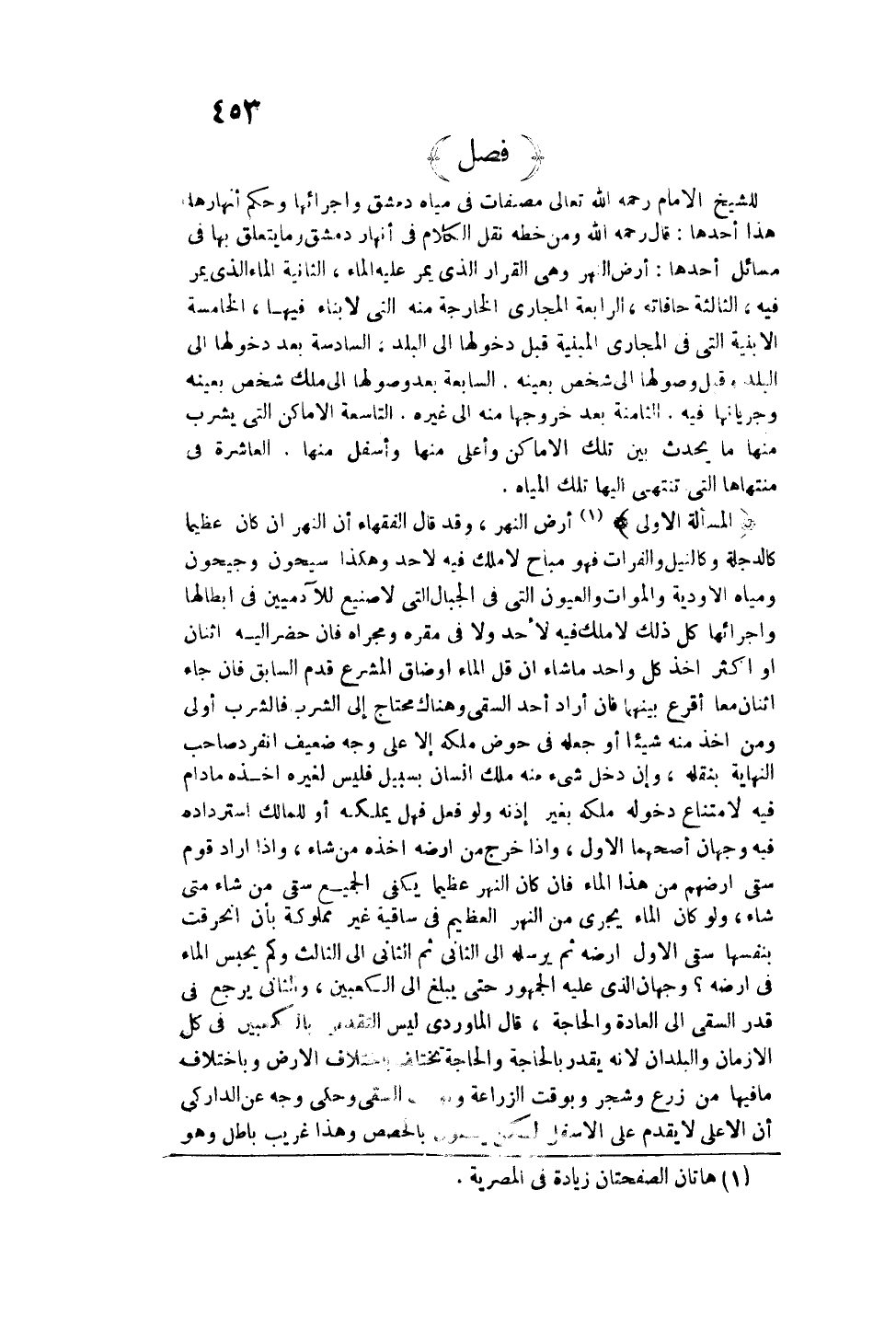 فَصْلٌ) لِلشَّيْخِ الْإِمَامِ - رَحِمَهُ اللَّهُ تَعَالَى - مُصَنَّفَاتٌ فِي مِيَاهِ دِمَشْقَ وَإِجْرَائِهَا وَحُكْمِ أَنْهَارِهَا هَذَا أَحَدُهَا: قَالَ - رَحِمَهُ اللَّهُ - وَمِنْ خَطِّهِ نَقْلُ الْكَلَامِ فِي أَنْهَارِ دِمَشْقَ وَمَا يَتَعَلَّقُ بِهَا فِي مَسَائِلَ:
