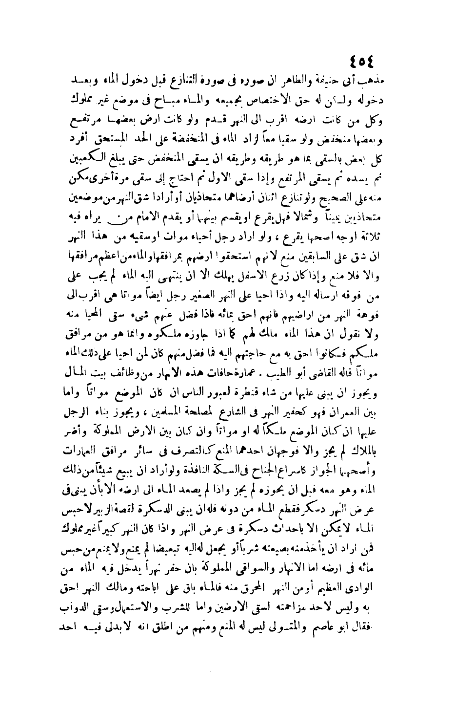 مَذْهَبُ أَبِي حَنِيفَةَ، وَالظَّاهِرُ أَنَّ صُوَرَهُ فِي صُورَةِ التَّنَازُعِ قَبْلَ دُخُولِ الْمَاءِ وَبَعْدَ دُخُولِهِ وَلَكِنْ لَهُ حَقُّ الِاخْتِصَاصِ بِجَمِيعِهِ وَالْمَاءُ مُبَاحٌ فِي مَوْضِعٍ غَيْرِ مَمْلُوكٍ وَكُلُّ مَنْ كَانَتْ أَرْضُهُ أَقْرَبَ إلَى النَّهْرِ قُدِّمَ وَلَوْ كَانَتْ أَرْضٌ بَعْضُهَا مُرْتَفِعٌ وَبَعْضُهَا مُنْخَفِضٌ وَلَوْ سَقَيَا مَعًا لَزَادَ الْمَاءُ فِي الْمُنْخَفِضَةِ عَلَى الْحَدِّ الْمُسْتَحَقِّ أُفْرِدَ كُلُّ بَعْضٍ بِالسَّقْيِ بِمَا هُوَ طَرِيقُهُ وَطَرِيقُهُ أَنْ يَسْقِيَ الْمُنْخَفِضَ حَتَّى يَبْلُغَ الْكَعْبَيْنِ ثُمَّ يَسُدَّهُ ثُمَّ يَسْقِيَ الْمُرْتَفِعَ، وَإِذَا سَقَى الْأَوَّلَ ثُمَّ احْتَاجَ إلَى سَقْيٍ مَرَّةً أُخْرَى مُكِّنَ مِنْهُ عَلَى الصَّحِيحِ وَلَوْ تَنَازَعَ اثْنَانِ أَرْضَاهُمَا مُتَحَاذِيَانِ أَوْ أَرَادَا شَقَّ النَّهْرِ مِنْ مَوْضِعَيْنِ مُتَحَاذِيَيْنِ يَمِينًا وَشِمَالًا فَهَلْ يُقْرَعُ أَوْ يُقَسَّمُ بَيْنَهُمَا أَوْ يُقَدِّمُ الْإِمَامُ مَنْ يَرَاهُ فِيهِ ثَلَاثَةٌ أَوْجُهٍ: