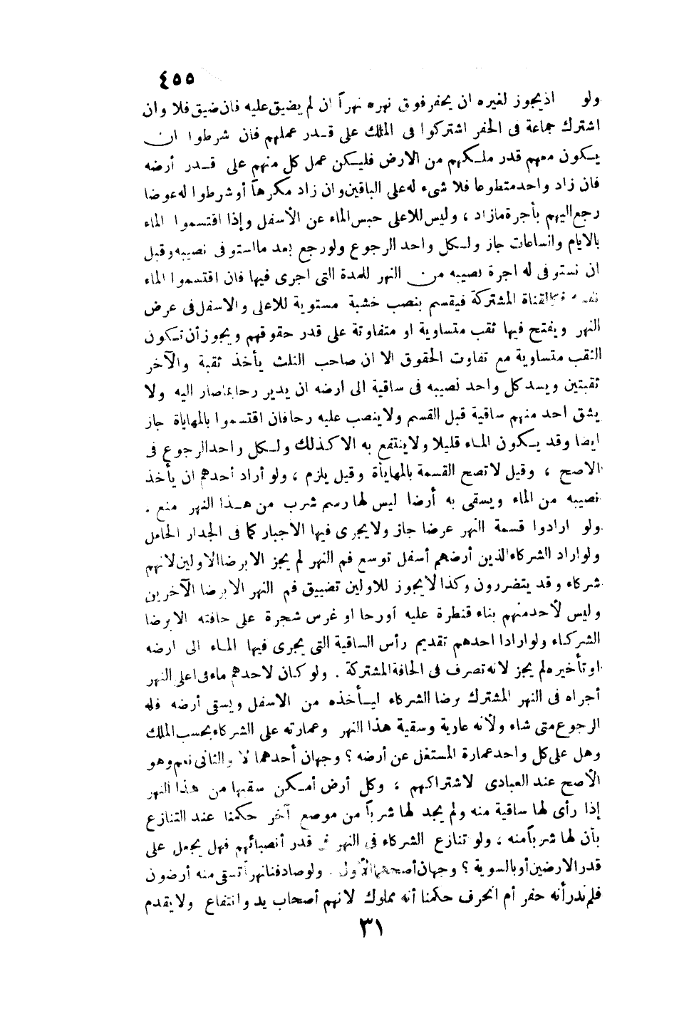 فَإِنْ زَادَ وَاحِدٌ مُتَطَوِّعًا فَلَا شَيْءَ لَهُ عَلَى الْبَاقِينَ وَإِنْ زَادَ مُكْرَهًا أَوْ شَرَطُوا لَهُ عِوَضًا رَجَعَ إلَيْهِمْ بِأُجْرَةِ مَا زَادَ، وَلَيْسَ لِلْأَعْلَى حَبْسُ الْمَاءِ عَنْ الْأَسْفَلِ، وَإِذَا اقْتَسَمُوا الْمَاءَ بِالْأَيَّامِ وَالسَّاعَاتِ جَازَ وَلِكُلِّ وَاحِدٍ الرُّجُوعُ وَلَوْ رَجَعَ بَعْدَ مَا اسْتَوْفَى نَصِيبَهُ وَقَبْلَ أَنْ تُسْتَوْفَى لَهُ أُجْرَةُ نَصِيبِهِ مِنْ النَّهْرِ لِلْمُدَّةِ الَّتِي أَجْرَى فِيهَا، فَإِنْ اقْتَسَمُوا الْمَاءَ نَفْسَهُ فَكَالْقَنَاةِ الْمُشْتَرَكَةِ فَيُقْسَمُ بِنَصْبِ خَشَبَةٍ مُسْتَوِيَةٍ لِلْأَعْلَى وَالْأَسْفَلِ فِي عَرْضِ النَّهْرِ وَيُفْتَحُ فِيهَا ثُقُبٌ مُتَسَاوِيَةٌ أَوْ مُتَفَاوِتَةٌ عَلَى قَدْرِ حُقُوقِهِمْ، وَيَجُوزُ أَنْ تَكُونَ الثُّقُبُ مُتَسَاوِيَةً مَعَ تَفَاوُتِ الْحُقُوقِ إلَّا أَنَّ صَاحِبَ الثُّلُثِ يَأْخُذُ ثُقْبَةً وَالْآخَرُ ثُقْبَتَيْنِ وَيَسُدُّ كُلُّ وَاحِدٍ نَصِيبَهُ فِي سَاقِيَةٍ إلَى أَرْضِهِ أَنْ يُدِيرَ رَحًا بِمَا صَارَ إلَيْهِ وَلَا يَشُقُّ أَحَدٌ مِنْهُمْ سَاقِيَةً قَبْلَ الْقَسْمِ وَلَا يَنْصِبُ عَلَيْهِ رَحَا.