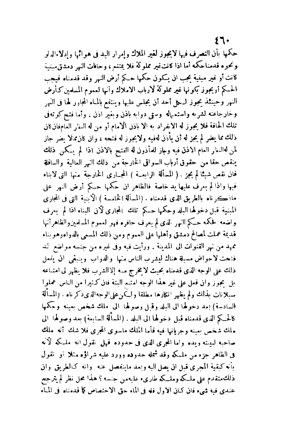 (الْمَسْأَلَةُ الْخَامِسَةُ) الْأَبْنِيَةُ الَّتِي فِيهَا الْمَجَارِي الْمَبْنِيَّةُ قَبْلَ دُخُولِهَا الْبَلَدَ وَحُكْمُهَا حُكْمُ تِلْكَ الْمَجَارِي؛ لِأَنَّ الْبِنَاءَ إذَا لَمْ يُعْرَفْ وَاضِعُهُ فَحُكْمُهُ حُكْمُ النَّهْرِ الَّذِي لَمْ يُعْرَفْ حَافِرُهُ فَهُوَ لِعُمُومِ الْمُسْلِمِينَ وَالظَّاهِرُ أَنَّهَا قَدِيمَةٌ عُمِلَتْ لِمَصَالِحِ دِمَشْقَ وَأَهْلِهَا عَلَى الْعُمُومِ وَمِنْ ذَلِكَ الْمُسَمَّى بِالدَّوَاةِ وَهُوَ بِنَاءٌ مُمَهَّدٌ مِنْ نَهْرِ الْقَنَوَاتِ إلَى الْمَدِينَةِ. وَرَأَيْت فِيهِ وَفِي غَيْرِهِ مِنْ جِنْسِهِ مَوَاضِعَ قَدْ فُتِحَتْ لِأَحْوَاضٍ مُسْبَلَةٍ هُنَاكَ لِيَشْرَبَ النَّاسُ مِنْهَا وَالدَّوَابُّ وَيَنْبَغِي أَنْ يُفْعَلَ ذَلِكَ عَلَى الْوَجْهِ الَّذِي قَدَّمْنَاهُ بِحَيْثُ لَا يَخْرُجُ مِنْهُ إلَّا الشُّرْبُ فَلَا يَظْهَرُ لِي امْتِنَاعُهُ بَلْ يَجُوزُ وَإِنْ فَعَلَ عَلَى غَيْرِ هَذَا الْوَجْهِ امْتَنَعَ أَلْبَتَّةَ فَإِنَّ كَثِيرًا مِنْ النَّاسِ عَمِلُوا سَبَلَانَاتٍ بِذَلِكَ وَلَمْ يَظْهَرْ إنْكَارُهَا مُطْلَقًا وَلَكِنْ عَلَى الْوَجْهِ الَّذِي ذَكَرْنَاهُ.