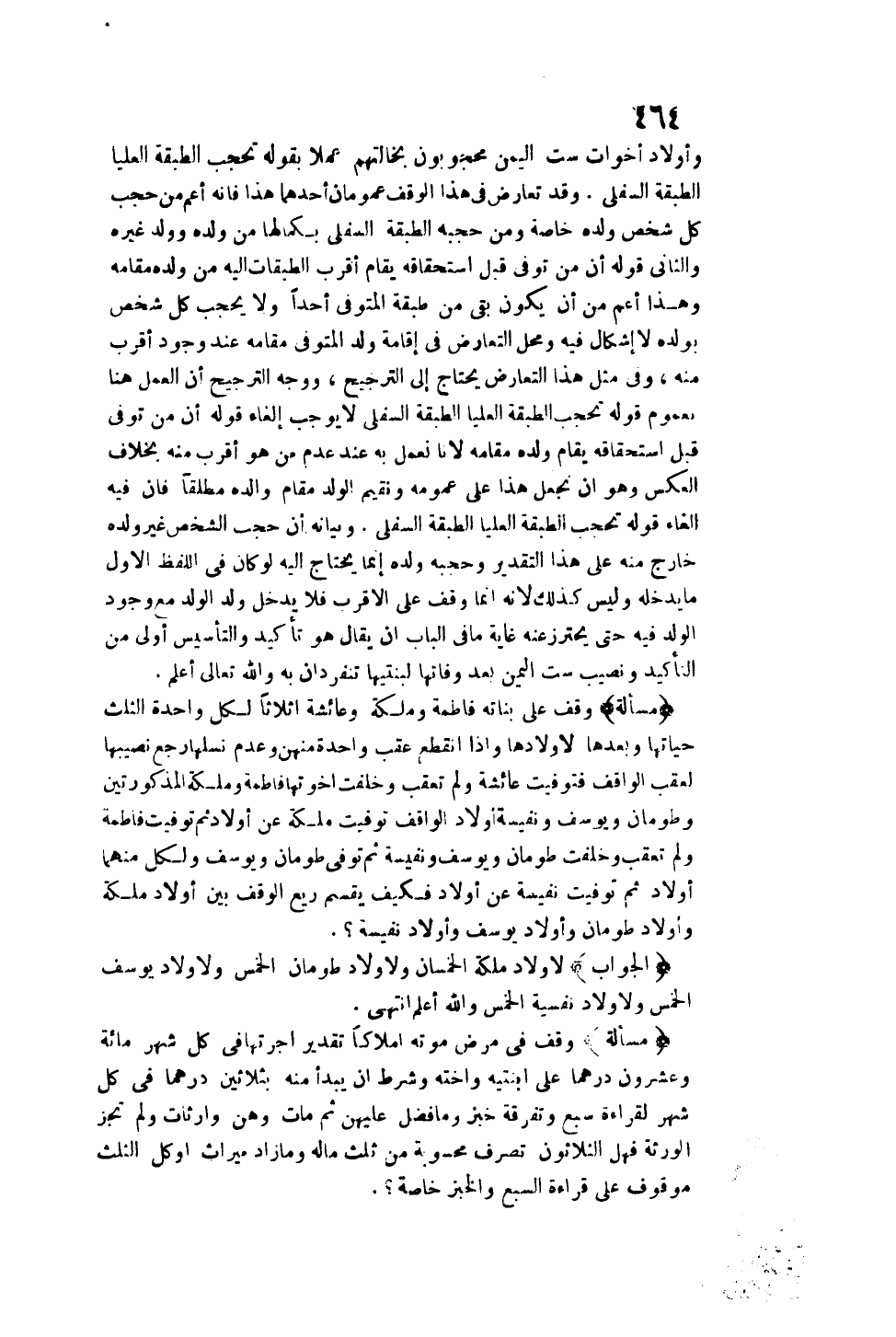 وَأَوْلَادُ أَخَوَاتِ سِتِّ الْيُمْنِ مَحْجُوبُونَ بِخَالَتِهِمْ عَمَلًا بِقَوْلِهِ تَحْجُبُ الطَّبَقَةُ الْعُلْيَا الطَّبَقَةَ السُّفْلَى. وَقَدْ تَعَارَضَ فِي هَذَا الْوَقْفِ عُمُومَانِ: أَحَدُهُمَا هَذَا فَإِنَّهُ أَعَمُّ مِنْ حَجْبِ كُلِّ شَخْصٍ وَلَدَهُ خَاصَّةً وَمِنْ حَجْبِهِ الطَّبَقَةَ السُّفْلَى بِكَمَالِهَا مِنْ وَلَدِهِ وَوَلَدِ غَيْرِهِ وَالثَّانِي قَوْلُهُ أَنَّ مَنْ تُوُفِّيَ قَبْلَ اسْتِحْقَاقِهِ يُقَامُ أَقْرَبُ الطَّبَقَاتِ إلَيْهِ مِنْ وَلَدِهِ مَقَامَهُ وَهَذَا أَعَمُّ مِنْ أَنْ يَكُونَ بَقِيَ مِنْ طَبَقَةِ الْمُتَوَفَّى أَحَدًا وَلَا يُحْجَبُ كُلُّ شَخْصٍ بِوَلَدِهِ لَا إشْكَالَ فِيهِ وَمَحَلُّ التَّعَارُضِ فِي إقَامَةِ وَلَدِ الْمُتَوَفَّى مَقَامَهُ عِنْدَ وُجُودِ أَقْرَبَ مِنْهُ، وَفِي مِثْلِ هَذَا التَّعَارُضِ يَحْتَاجُ إلَى التَّرْجِيحِ، وَوَجْهُ التَّرْجِيحِ أَنَّ الْعَمَلَ هُنَا لِعُمُومِ قَوْلِهِ تَحْجُبُ الطَّبَقَةُ الْعُلْيَا الطَّبَقَةَ السُّفْلَى لَا يُوجِبُ إلْغَاءَ قَوْلِهِ أَنَّ مَنْ تُوُفِّيَ قَبْلَ اسْتِحْقَاقِهِ يُقَامُ وَلَدُهُ مَقَامَهُ؛ لِأَنَّا نَعْمَلُ بِهِ عِنْدَ عَدَمِ مَنْ هُوَ أَقْرَبُ مِنْهُ بِخِلَافِ الْعَكْسِ وَهُوَ أَنْ نَجْعَلَ هَذَا عَلَى عُمُومِهِ وَنُقِيمَ الْوَلَدَ مَقَامَ وَالِدِهِ مُطْلَقًا فَإِنَّ فِيهِ إلْغَاءَ قَوْلِهِ تَحْجُبُ الطَّبَقَةُ الْعُلْيَا الطَّبَقَةَ السُّفْلَى. وَبَيَانُهُ أَنَّ حَجْبَ الشَّخْصِ غَيْرَ وَلَدِهِ خَارِجٌ مِنْهُ عَلَى هَذَا التَّقْدِيرِ وَحَجْبَهُ وَلَدَهُ إنَّمَا يَحْتَاجُ إلَيْهِ لَوْ كَانَ فِي اللَّفْظِ الْأَوَّلِ مَا يُدْخِلُهُ وَلَيْسَ كَذَلِكَ؛ لِأَنَّهُ إنَّمَا وَقَفَ عَلَى الْأَقْرَبِ فَلَا يَدْخُلُ وَلَدُ الْوَلَدِ مَعَ وُجُودِ الْوَلَدِ فِيهِ حَتَّى يَحْتَرِزَ عَنْهُ غَايَةَ مَا فِي الْبَابِ أَنْ يُقَالَ هُوَ تَأْكِيدٌ وَالتَّأْسِيسُ أَوْلَى مِنْ التَّأْكِيدِ وَنَصِيبُ سِتِّ الْيُمْنِ بَعْدَ وَفَاتِهَا لَبِنْتَيْهَا تَنْفَرِدَانِ بِهِ وَاَللَّهُ تَعَالَى أَعْلَمُ.