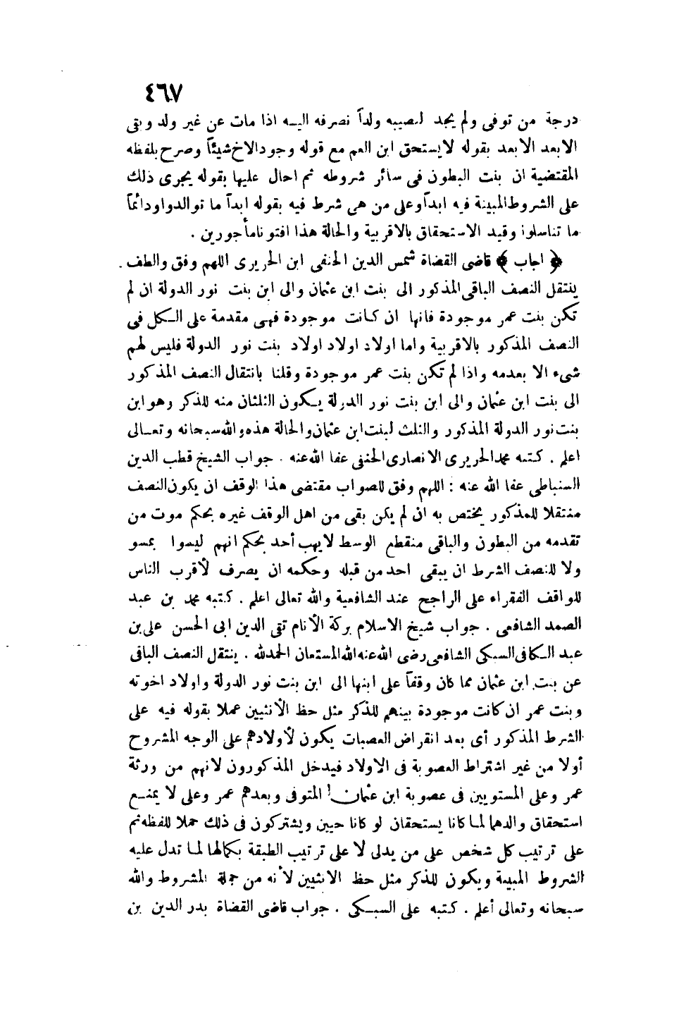 (أَجَابَ) قَاضِي الْقُضَاةِ شَمْسُ الدِّينِ الْحَنَفِيُّ ابْنُ الْحَرِيرِيِّ اللَّهُمَّ وَفِّقْ وَالْطُفْ يَنْتَقِلُ النِّصْفُ الْبَاقِي الْمَذْكُورُ إلَى بِنْتِ ابْنِ عُثْمَانَ وَإِلَى ابْنِ بِنْتِ نُورِ الدَّوْلَةِ إنْ لَمْ تَكُنْ بِنْتُ عُمَرَ مَوْجُودَةً فَإِنَّهَا إنْ كَانَتْ مَوْجُودَةً فَهِيَ مُقَدَّمَةٌ عَلَى الْكُلِّ فِي النِّصْفِ الْمَذْكُورِ بِالْأَقْرَبِيَّةِ، وَأَمَّا أَوْلَادُ أَوْلَادِ أَوْلَادِ بِنْتِ نُورِ الدَّوْلَةِ فَلَيْسَ لَهُمْ شَيْءٌ إلَّا بِعَدَمِهِ، وَإِذَا لَمْ تَكُنْ بِنْتُ عُمَرَ مَوْجُودَةً وَقُلْنَا بِانْتِقَالِ النِّصْفِ الْمَذْكُورِ إلَى بِنْتِ ابْنِ عُثْمَانَ وَإِلَى ابْنِ بِنْتِ نُورِ الدَّوْلَةِ يَكُونُ الثُّلُثَانِ مِنْهُ لِلذَّكَرِ وَهُوَ ابْنُ بِنْتِ نُورِ الدَّوْلَةِ الْمَذْكُورُ وَالثُّلُثُ لِبِنْتِ ابْنِ عُثْمَانَ وَالْحَالَةُ هَذِهِ وَاَللَّهُ سُبْحَانَهُ وَتَعَالَى أَعْلَمُ. كَتَبَهُ مُحَمَّدٌ الْحَرِيرِيُّ الْأَنْصَارِيُّ الْحَنَفِيُّ عَفَا اللَّهُ عَنْهُ.