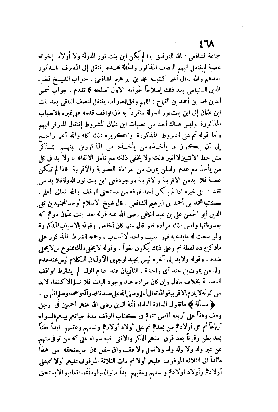 بِاَللَّهِ التَّوْفِيقُ إذَا لَمْ يَكُنْ ابْنُ بِنْتِ نُورِ الدَّوْلَةِ وَلَا أَوْلَادُ إخْوَتِهِ عَصَبَةً لَمْ يَنْتَقِلْ إلَيْهِمْ النِّصْفُ الْمَذْكُورُ وَالْحَالَةُ هَذِهِ يَنْتَقِلُ إلَى الْمَصْرِفِ الْمَذْكُورِ بَعْدَهُمْ وَاَللَّهُ تَعَالَى أَعْلَمُ كَتَبَهُ مُحَمَّدُ بْنُ إبْرَاهِيمَ الشَّافِعِيُّ.