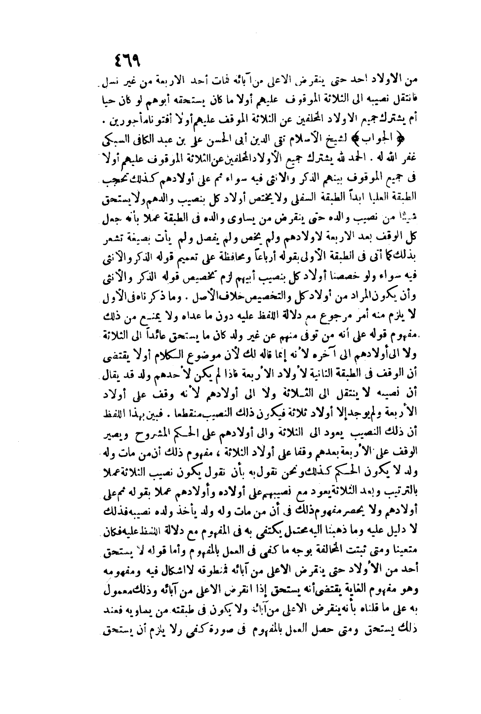 (الْجَوَابُ) لِشَيْخِ الْإِسْلَامِ تَقِيِّ الدِّينِ أَبِي الْحَسَنِ عَلِيِّ بْنِ عَبْدِ الْكَافِي السُّبْكِيّ غَفَرَ اللَّهُ لَهُ الْحَمْدُ لِلَّهِ يَشْتَرِكُ جَمِيعُ الْأَوْلَادِ الْمُخَلَّفِينَ عَنْ الثَّلَاثَةِ الْمَوْقُوفِ عَلَيْهِمْ أَوَّلًا فِي جَمِيعِ الْمَوْقُوفِ بَيْنَهُمْ الذَّكَرُ وَالْأُنْثَى فِيهِ سَوَاءٌ ثُمَّ عَلَى أَوْلَادِهِمْ كَذَلِكَ تَحْجُبُ الطَّبَقَةُ الْعُلْيَا أَبَدًا الطَّبَقَةَ السُّفْلَى وَلَا يَخْتَصُّ أَوْلَادُ كُلٍّ بِنَصِيبِ وَالِدِهِمْ وَلَا يَسْتَحِقُّ شَيْئًا مِنْ نَصِيبِ وَالِدِهِ حَتَّى يَنْقَرِضَ مَنْ يُسَاوِي وَالِدَهُ فِي الطَّبَقَةِ عَمَلًا بِأَنَّهُ جَعَلَ كُلَّ الْوَقْفِ بَعْدَ الْأَرْبَعَةِ لِأَوْلَادِهِمْ وَلَمْ يَخْتَصَّ وَلَمْ يَفْصِلْ وَلَمْ يَأْتِ بِصِيغَةٍ تُشْعِرُ بِذَلِكَ كَمَا أَتَى فِي الطَّبَقَةِ الْأُولَى بِقَوْلِهِ أَرْبَاعًا وَمُحَافَظَةً عَلَى تَعْمِيمِ قَوْلِهِ الذَّكَرُ وَالْأُنْثَى فِيهِ سَوَاءٌ، وَلَوْ خَصَّصْنَا أَوْلَادَ كُلٍّ بِنَصِيبِ أَبِيهِمْ لَزِمَ تَخْصِيصُ قَوْلِهِ الذَّكَرُ وَالْأُنْثَى وَأَنْ يَكُونَ الْمُرَادُ مِنْ أَوْلَادِ كُلٍّ وَالتَّخْصِيصُ خِلَافُ الْأَصْلِ. وَمَا ذَكَرْنَاهُ فِي الْأَوَّلِ لَا يَلْزَمُ مِنْهُ أَمْرٌ مَرْجُوعٌ مَعَ دَلَالَةِ اللَّفْظِ عَلَيْهِ دُونَ مَا عَدَاهُ وَلَا يَمْنَعُ مِنْ ذَلِكَ مَفْهُومُ قَوْلِهِ عَلَى أَنَّهُ مَنْ تُوُفِّيَ مِنْهُمْ عَنْ غَيْرِ وَلَدٍ كَانَ مَا يَسْتَحِقُّ عَائِدًا إلَى الثَّلَاثَةِ وَلَا إلَى أَوْلَادِهِمْ إلَى آخِرِهِ؛ لِأَنَّهُ إنَّمَا قَالَهُ لَك؛ لِأَنَّ مَوْضُوعَ الْكَلَامِ أَوَّلًا يَقْتَضِي أَنَّ الْوَقْفَ فِي الطَّبَقَةِ الثَّانِيَةِ لِأَوْلَادِ الْأَرْبَعَةِ فَإِذَا لَمْ يَكُنْ لِأَحَدِهِمْ وَلَدٌ قَدْ يُقَالُ إنَّ نَصِيبَهُ لَا يَنْتَقِلُ إلَى الثَّلَاثَةِ وَلَا إلَى أَوْلَادِهِمْ؛ لِأَنَّهُ وَقْفٌ عَلَى أَوْلَادِ الْأَرْبَعَةِ وَلَمْ يُوجَدْ إلَّا أَوْلَادُ ثَلَاثَةٍ فَيَكُونُ ذَلِكَ النَّصِيبُ مُنْقَطِعًا. فَبَيَّنَ بِهَذَا اللَّفْظِ أَنَّ ذَلِكَ النَّصِيبَ يَعُودُ إلَى الثَّلَاثَةِ وَإِلَى أَوْلَادِهِمْ عَلَى الْحُكْمِ الْمَشْرُوحِ وَيَصِيرُ الْوَقْفُ عَلَى الْأَرْبَعَةِ بَعْدَهُمْ وَقْفًا عَلَى أَوْلَادِ الثَّلَاثَةِ، مَفْهُومُ ذَلِكَ أَنَّ مَنْ مَاتَ وَلَهُ وَلَدٌ لَا يَكُونُ الْحُكْمُ كَذَلِكَ وَنَحْنُ نَقُولُ بِهِ بِأَنْ نَقُولَ يَكُونُ نَصِيبُ الثَّلَاثَةِ عَمَلًا بِالتَّرْتِيبِ وَبَعْدَ الثَّلَاثَةِ يَعُودُ مَعَ نَصِيبِهِمْ عَلَى أَوْلَادِهِ وَأَوْلَادِهِمْ عَمَلًا بِقَوْلِهِ ثُمَّ عَلَى أَوْلَادِهِمْ وَلَا يُحْصَرُ مَفْهُومُ ذَلِكَ فِي أَنَّ مَنْ مَاتَ وَلَهُ وَلَدٌ يَأْخُذُ وَلَدُهُ نَصِيبَهُ فَذَلِكَ لَا دَلِيلَ عَلَيْهِ وَمَا ذَهَبْنَا إلَيْهِ مُحْتَمَلٌ يُكْتَفَى بِهِ فِي الْمَفْهُومِ مَعَ دَلَالَةِ اللَّفْظِ عَلَيْهِ فَكَانَ مُتَعَيَّنًا وَمَتَى ثَبَتَتْ الْمُخَالَفَةُ بِوَجْهٍ مَا كَفَى فِي الْعَمَلِ بِالْمَفْهُومِ، وَأَمَّا قَوْلُهُ لَا يَسْتَحِقُّ أَحَدٌ مِنْ الْأَوْلَادِ حَتَّى يَنْقَرِضَ الْأَعْلَى مِنْ آبَائِهِ فَمَنْطُوقُهُ لَا إشْكَالَ فِيهِ وَمَفْهُومُهُ وَهُوَ مَفْهُومُ الْغَايَةِ يَقْتَضِي أَنَّهُ يَسْتَحِقُّ إذَا انْقَرَضَ الْأَعْلَى مِنْ آبَائِهِ وَذَلِكَ مَعْمُولٌ بِهِ عَلَى مَا قُلْنَاهُ بِأَنَّهُ يَنْقَرِضُ الْأَعْلَى مِنْ آبَائِهِ وَلَا يَكُونُ فِي طَبَقَتِهِ مَنْ يُسَاوِيه فَعِنْدَ ذَلِكَ يَسْتَحِقُّ وَمَتَى حَصَلَ الْعَمَلُ بِالْمَفْهُومِ فِي صُورَةٍ كَفَى وَلَا يَلْزَمُ أَنْ يَسْتَحِقَّ