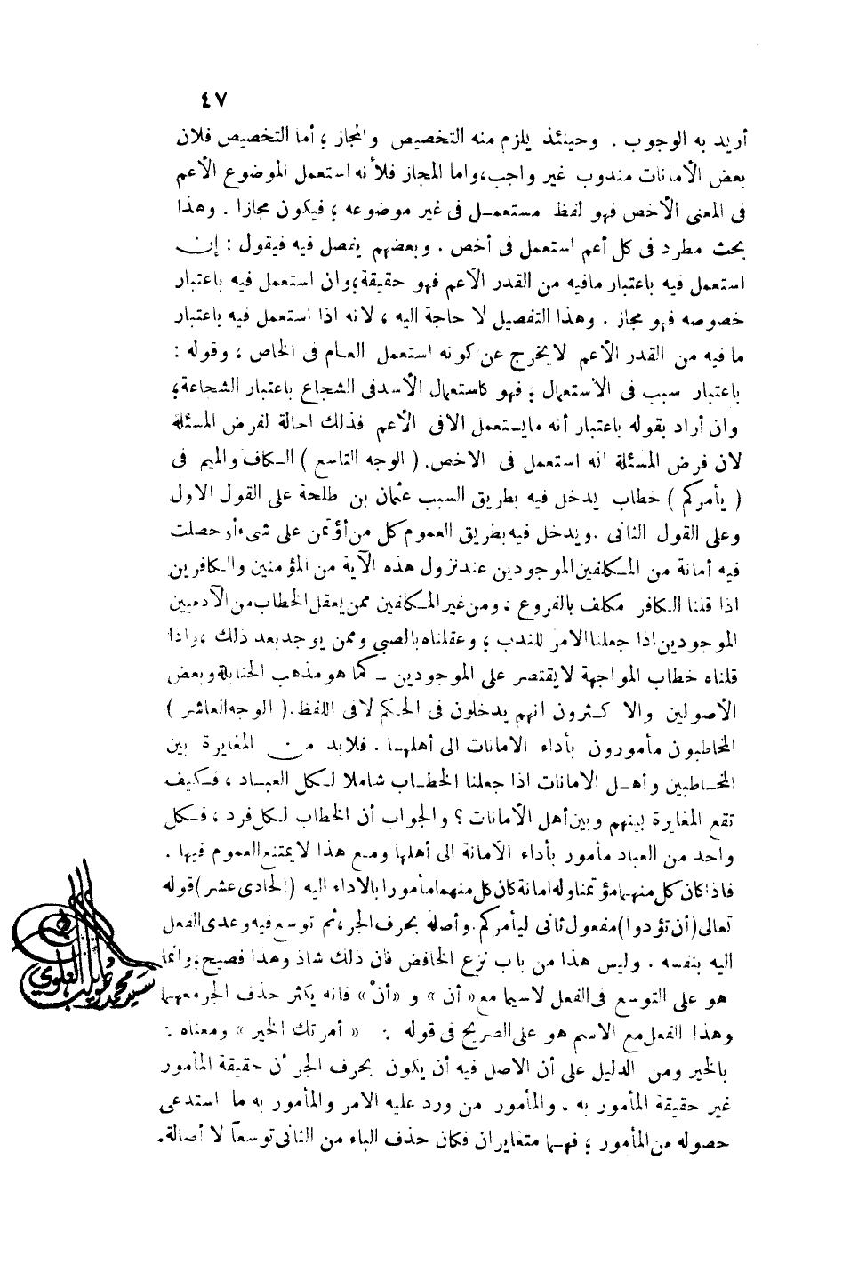 أُرِيدَ بِهِ الْوُجُوبُ. وَحِينَئِذٍ يَلْزَمُ مِنْهُ التَّخْصِيصُ وَالْمَجَازُ؛ أَمَّا التَّخْصِيصُ فَلِأَنَّ بَعْضَ الْأَمَانَاتِ مَنْدُوبٌ غَيْرُ وَاجِبٍ، وَأَمَّا الْمَجَازُ فَلِأَنَّهُ اسْتَعْمَلَ الْمَوْضُوعَ الْأَعَمَّ فِي الْمَعْنَى الْأَخَصِّ فَهُوَ لَفْظٌ مُسْتَعْمَلٌ فِي غَيْرِ مَوْضُوعِهِ؛ فَيَكُونُ مَجَازًا. وَهَذَا بَحْثٌ مُطَّرَدٌ فِي كُلِّ أَعَمَّ اُسْتُعْمِلَ فِي أَخَصَّ. وَبَعْضُهُمْ يُفَصِّلُ فِيهِ فَيَقُولُ: إنْ اُسْتُعْمِلَ فِيهِ بِاعْتِبَارِ مَا فِيهِ مِنْ الْقَدْرِ الْأَعَمِّ فَهُوَ حَقِيقَةٌ؛ وَإِنْ اُسْتُعْمِلَ فِيهِ بِاعْتِبَارِ خُصُوصِهِ فَهُوَ مَجَازٌ. وَهَذَا التَّفْصِيلُ لَا حَاجَةَ إلَيْهِ لِأَنَّهُ إذَا اُسْتُعْمِلَ فِيهِ بِاعْتِبَارِ مَا فِيهِ مِنْ الْقَدْرِ الْأَعَمِّ لَا يَخْرُجُ عَنْ كَوْنِهِ اسْتَعْمَلَ الْعَامَّ فِي الْخَاصِّ، وَقَوْلُهُ: بِاعْتِبَارِ سَبَبٍ فِي الِاسْتِعْمَالِ؛ فَهُوَ كَاسْتِعْمَالِ الْأَسَدِ فِي الشُّجَاعِ بِاعْتِبَارِ الشَّجَاعَةِ؛ وَإِنْ أَرَادَ بِقَوْلِهِ بِاعْتِبَارِ أَنَّهُ مَا يُسْتَعْمَلُ إلَّا فِي الْأَعَمِّ فَذَلِكَ إحَالَةٌ لِفَرْضِ الْمَسْأَلَةِ لِأَنَّ فَرْضَ الْمَسْأَلَةِ أَنَّهُ اُسْتُعْمِلَ فِي الْأَخَصِّ.