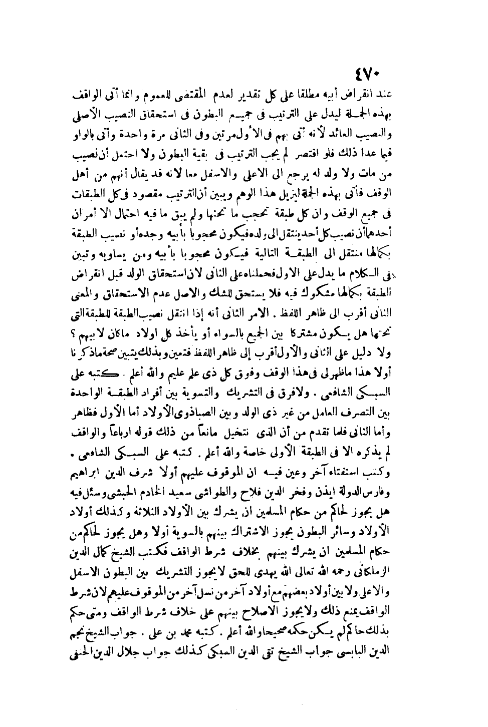 وَكَتَبَ اسْتِفْتَاءً آخَرَ وَعَيَّنَ فِيهِ أَنَّ الْمَوْقُوفَ عَلَيْهِمْ أَوَّلًا شَرَفُ الدِّينِ إبْرَاهِيمُ وَفَارِسُ الدَّوْلَةِ ايذَنْ وَفَخْرُ الدِّينِ فَلَّاحٌ وَالطَّوَاشِيُّ سَعِيدٌ الْخَادِمُ الْحَبَشِيُّ وَسَأَلَ فِيهِ هَلْ يَجُوزُ لِحَاكِمٍ مِنْ حُكَّامِ الْمُسْلِمِينَ أَنْ يُشْرِكَ بَيْنَ الْأَوْلَادِ الثَّلَاثَةِ وَكَذَلِكَ أَوْلَادُ الْأَوْلَادِ وَسَائِرُ الْبُطُونِ يَجُوزُ الِاشْتِرَاكُ بَيْنَهُمْ بِالسَّوِيَّةِ أَوْ لَا وَهَلْ يَجُوزُ لِحَاكِمٍ مِنْ حُكَّامِ الْمُسْلِمِينَ أَنْ يُشْرِكَ بَيْنَهُمْ بِخِلَافِ شَرْطِ الْوَاقِفِ؟ فَكَتَبَ الشَّيْخُ كَمَالُ الدِّينِ الزَّمْلَكَانِيُّ - رَحِمَهُ اللَّهُ تَعَالَى - اللَّهُ يَهْدِي لِلْحَقِّ لَا يَجُوزُ التَّشْرِيكُ بَيْنَ الْبُطُونِ الْأَسْفَلِ وَالْأَعْلَى وَلَا بَيْنَ أَوْلَادِ بَعْضِهِمْ مَعَ أَوْلَادِ آخَرَ مِنْ نَسْلٍ آخَرَ مِنْ الْمَوْقُوفِ عَلَيْهِمْ؛ لِأَنَّ شَرْطَ الْوَاقِفِ يَمْنَعُ ذَلِكَ وَلَا يَجُوزُ الْإِصْلَاحُ بَيْنَهُمْ عَلَى خِلَافِ شَرْطِ الْوَقْفِ وَمَتَى حَكَمَ بِذَلِكَ حَاكِمٌ لَمْ يَكُنْ حُكْمُهُ صَحِيحًا وَاَللَّهُ أَعْلَمُ. كَتَبَهُ مُحَمَّدُ بْنُ عَلِيٍّ. جَوَابُ الشَّيْخِ نَجْمِ الدِّينِ الْبَابَسِيِّ جَوَابُ الشَّيْخِ تَقِيِّ الدِّينِ السُّبْكِيّ كَذَلِكَ جَوَابُ جَلَالِ الدِّينِ الْحَنَفِيِّ