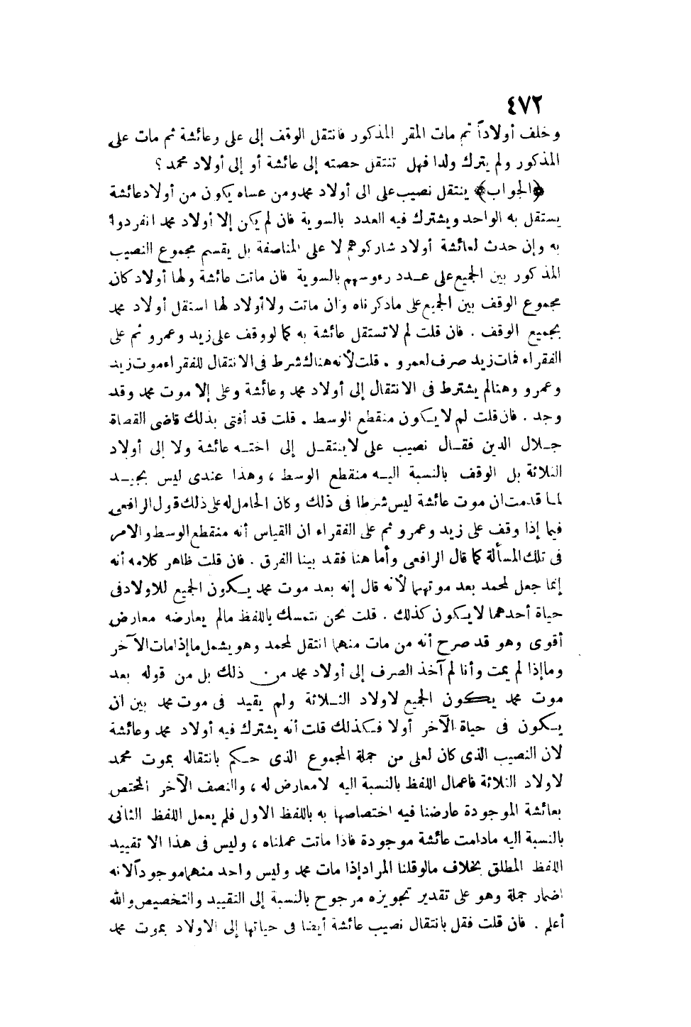 (الْجَوَابُ) يَنْتَقِلُ نَصِيبُ عَلِيٍّ إلَى أَوْلَادِ مُحَمَّدٍ وَمَنْ عَسَاهُ يَكُونُ مِنْ أَوْلَادِ عَائِشَةَ يَسْتَقِلُّ بِهِ الْوَاحِدُ وَيَشْتَرِك فِيهِ الْعَدَدُ بِالسَّوِيَّةِ، فَإِنْ لَمْ يَكُنْ إلَّا أَوْلَادُ مُحَمَّدٍ انْفَرَدُوا بِهِ وَإِنْ حَدَثَ لِعَائِشَةَ أَوْلَادٌ شَارَكُوهُمْ لَا عَلَى الْمُنَاصَفَةِ بَلْ يُقَسَّمُ مَجْمُوعُ النَّصِيبِ الْمَذْكُورِ بَيْنَ الْجَمِيعِ عَلَى عَدَدِ رُءُوسِهِمْ بِالسَّوِيَّةِ، فَإِنْ مَاتَتْ عَائِشَةُ وَلَهَا أَوْلَادٌ كَانَ مَجْمُوعُ الْوَقْفِ بَيْنَ الْجَمِيعِ عَلَى مَا ذَكَرْنَاهُ وَإِنْ مَاتَتْ وَلَا أَوْلَادَ لَهَا اسْتَقَلَّ أَوْلَادُ مُحَمَّدٍ بِجَمِيعِ الْوَقْفِ، فَإِنْ قُلْت: لِمَ لَا تَسْتَقِلُّ عَائِشَةُ بِهِ كَمَا لَوْ وَقَفَ عَلَى زَيْدٍ وَعَمْرٍو ثُمَّ عَلَى الْفُقَرَاءِ فَمَاتَ زَيْدٌ صَرَفَ لِعَمْرٍو، قُلْت؛ لِأَنَّهُ هُنَاكَ شَرْطٌ فِي الِانْتِقَالِ لِلْفُقَرَاءِ مَوْتُ زَيْدٍ وَعَمْرٍو وَهُنَا لَمْ يَشْتَرِطْ فِي الِانْتِقَالِ إلَى أَوْلَادِ مُحَمَّدٍ وَعَائِشَةَ وَعَلِيٍّ إلَّا مَوْتَ مُحَمَّدٍ وَقَدْ وُجِدَ، فَإِنْ قُلْت لِمَ لَا يَكُونُ مُنْقَطِعَ الْوَسَطِ. قُلْت: قَدْ أَفْتَى بِذَلِكَ قَاضِي الْقُضَاةِ جَلَالُ الدِّينِ فَقَالَ: نَصِيبُ عَلِيٍّ لَا يَنْتَقِلُ إلَى أُخْتِهِ عَائِشَةَ وَلَا إلَى أَوْلَادِ الثَّلَاثَةِ بَلْ الْوَقْفُ بِالنِّسْبَةِ إلَيْهِ مُنْقَطِعُ الْوَسَطِ، وَهَذَا عِنْدِي لَيْسَ بِجَيِّدٍ لِمَا قَدَّمْت أَنَّ مَوْتَ عَائِشَةَ لَيْسَ شَرْطًا فِي ذَلِكَ وَكَانَ الْحَامِلُ لَهُ عَلَى ذَلِكَ قَوْلُ الرَّافِعِيِّ فِيمَا إذَا وَقَفَ عَلَى زَيْدٍ وَعَمْرٍو ثُمَّ عَلَى الْفُقَرَاءِ أَنَّ الْقِيَاسَ أَنَّهُ مُنْقَطِعُ الْوَسَطِ وَالْأَمْرُ فِي تِلْكَ الْمَسْأَلَةِ كَمَا قَالَ الرَّافِعِيُّ، وَأَمَّا هُنَا فَقَدْ بَيَّنَّا الْفَرْقَ، فَإِنْ قُلْت: ظَاهِرُ كَلَامِهِ أَنَّهُ إنَّمَا جَعَلَ لِمُحَمَّدٍ بَعْدَ مَوْتِهِمَا؛ لِأَنَّهُ قَالَ: إنَّهُ بَعْدَ مَوْتِ مُحَمَّدٍ يَكُونُ الْجَمِيعُ لِلْأَوْلَادِ فِي حَيَاةِ أَحَدِهِمَا لَا يَكُونُ كَذَلِكَ. قُلْت: نَحْنُ نَتَمَسَّكُ بِاللَّفْظِ مَا لَمْ يُعَارِضْهُ مُعَارِضٌ أَقْوَى وَهُوَ قَدْ صَرَّحَ أَنَّهُ مَنْ مَاتَ مِنْهُمَا انْتَقَلَ لِمُحَمَّدٍ وَهُوَ يَشْمَلُ مَا إذَا مَاتَ الْآخَرُ وَمَا إذَا لَمْ يَمُتْ وَأَنَا لَمْ آخُذْ الصَّرْفَ إلَى أَوْلَادِ مُحَمَّدٍ مِنْ ذَلِكَ بَلْ مِنْ قَوْلِهِ بَعْدَ مَوْتِ مُحَمَّدٍ يَكُونُ الْجَمِيعُ لِأَوْلَادِ الثَّلَاثَةِ وَلَمْ يُقَيِّدْ فِي مَوْتِ مُحَمَّدٍ بَيْنَ أَنْ يَكُونَ فِي حَيَاةِ الْآخَرِ أَوْ لَا فَكَذَلِكَ قُلْت: إنَّهُ لَمْ يَشْتَرِكْ فِيهِ أَوْلَادُ مُحَمَّدٍ وَعَائِشَةَ؛ لِأَنَّ النَّصِيبَ الَّذِي كَانَ لِعَلِيٍّ مِنْ جُمْلَةِ الْمَجْمُوعِ الَّذِي حَكَمَ بِانْتِقَالِهِ بِمَوْتِ مُحَمَّدٍ لِأَوْلَادِ الثَّلَاثَةِ فَإِعْمَالُ اللَّفْظِ بِالنِّسْبَةِ إلَيْهِ لَا مُعَارِضَ لَهُ، وَالنِّصْفُ الْآخَرُ الْمُخْتَصُّ بِعَائِشَةَ الْمَوْجُودَةِ عَارَضْنَا فِيهِ اخْتِصَاصَهَا بِهِ بِاللَّفْظِ الْأَوَّلِ فَلَمْ يَعْمَلْ اللَّفْظُ الثَّانِي بِالنِّسْبَةِ إلَيْهِ مَا دَامَتْ عَائِشَةُ مَوْجُودَةً فَإِذَا مَاتَتْ عَمِلْنَاهُ، وَلَيْسَ فِي هَذَا إلَّا تَقْيِيدُ اللَّفْظِ الْمُطْلَقِ بِخِلَافِ مَا لَوْ قُلْنَا الْمُرَادُ إذَا مَاتَ مُحَمَّدٌ وَلَيْسَ وَاحِدٌ مِنْهُمَا مَوْجُودًا؛ لِأَنَّهُ إضْمَارُ جُمْلَةٍ وَهُوَ عَلَى تَقْدِيرِ تَجْوِيزِهِ مَرْجُوحٌ بِالنِّسْبَةِ إلَى التَّقْيِيدِ وَالتَّخْصِيصِ وَاَللَّهُ أَعْلَمُ.، فَإِنْ قُلْت: فَقُلْ بِانْتِقَالِ نَصِيبِ عَائِشَةَ أَيْضًا فِ