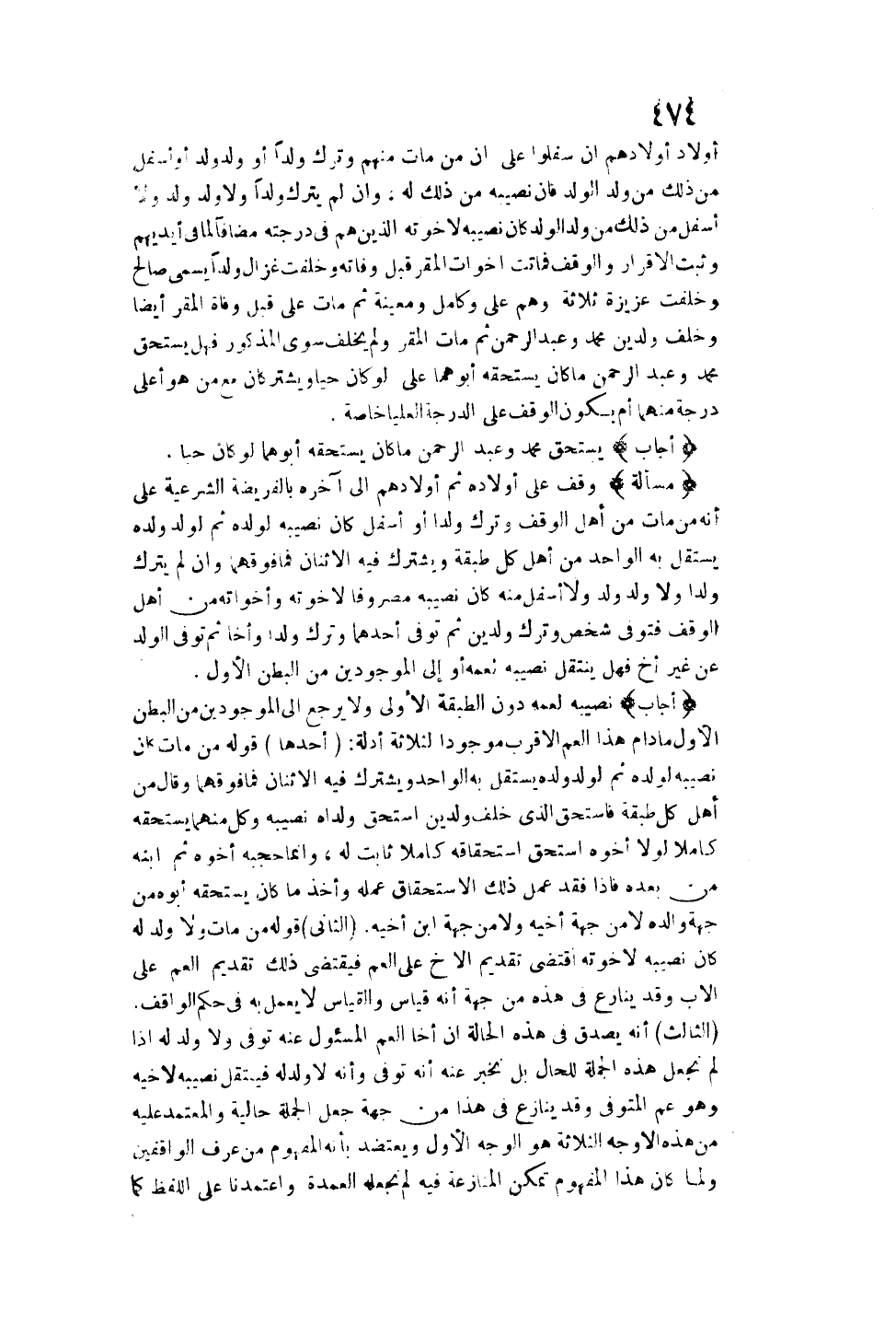 أَوْلَادِ أَوْلَادِهِمْ إنْ سَفَلُوا عَلَى أَنَّ مَنْ مَاتَ مِنْهُمْ وَتَرَكَ وَلَدًا أَوْ وَلَدَ وَلَدٍ أَوْ أَسْفَلَ مِنْ ذَلِكَ مِنْ وَلَدِ الْوَلَدِ فَإِنَّ نَصِيبَهُ مِنْ ذَلِكَ لَهُ، وَإِنْ لَمْ يَتْرُكْ وَلَدًا وَلَا وَلَدَ وَلَدٍ وَلَا أَسْفَلَ مِنْ ذَلِكَ مِنْ وَلَدِ الْوَلَدِ كَانَ نَصِيبُهُ لِإِخْوَتِهِ الَّذِينَ هُمْ فِي دَرَجَتِهِ مُضَافًا لِمَا فِي أَيْدِيهِمْ وَثَبَتَ الْإِقْرَارُ وَالْوَقْفُ فَمَاتَتْ أَخَوَاتُ الْمُقِرِّ قَبْلَ وَفَاتِهِ وَخَلَفَتْ غَزَالَ وَلَدًا يُسَمَّى صَالِحًا وَخَلَفَتْ عَزِيزَةُ ثَلَاثَةً وَهُمْ عَلِيٌّ وَكَامِلٌ وَمُعِينَةٌ ثُمَّ مَاتَ عَلِيٌّ قَبْلَ وَفَاةِ الْمُقِرِّ أَيْضًا وَخَلَفَ وَلَدَيْنِ مُحَمَّدًا وَعَبْدَ الرَّحْمَنِ ثُمَّ مَاتَ الْمُقِرُّ وَلَمْ يُخَلِّفْ سِوَى الْمَذْكُورِ فَهَلْ يَسْتَحِقُّ مُحَمَّدٌ وَعَبْدُ الرَّحْمَنِ مَا كَانَ يَسْتَحِقُّهُ أَبُوهُمَا عَلَى لَوْ كَانَ حَيًّا وَيَشْتَرِكَانِ مَعَ مَنْ هُوَ أَعْلَى دَرَجَةً مِنْهُمَا أَمْ يَكُونُ الْوَقْفُ عَلَى الدَّرَجَةِ الْعُلْيَا خَاصَّةً؟