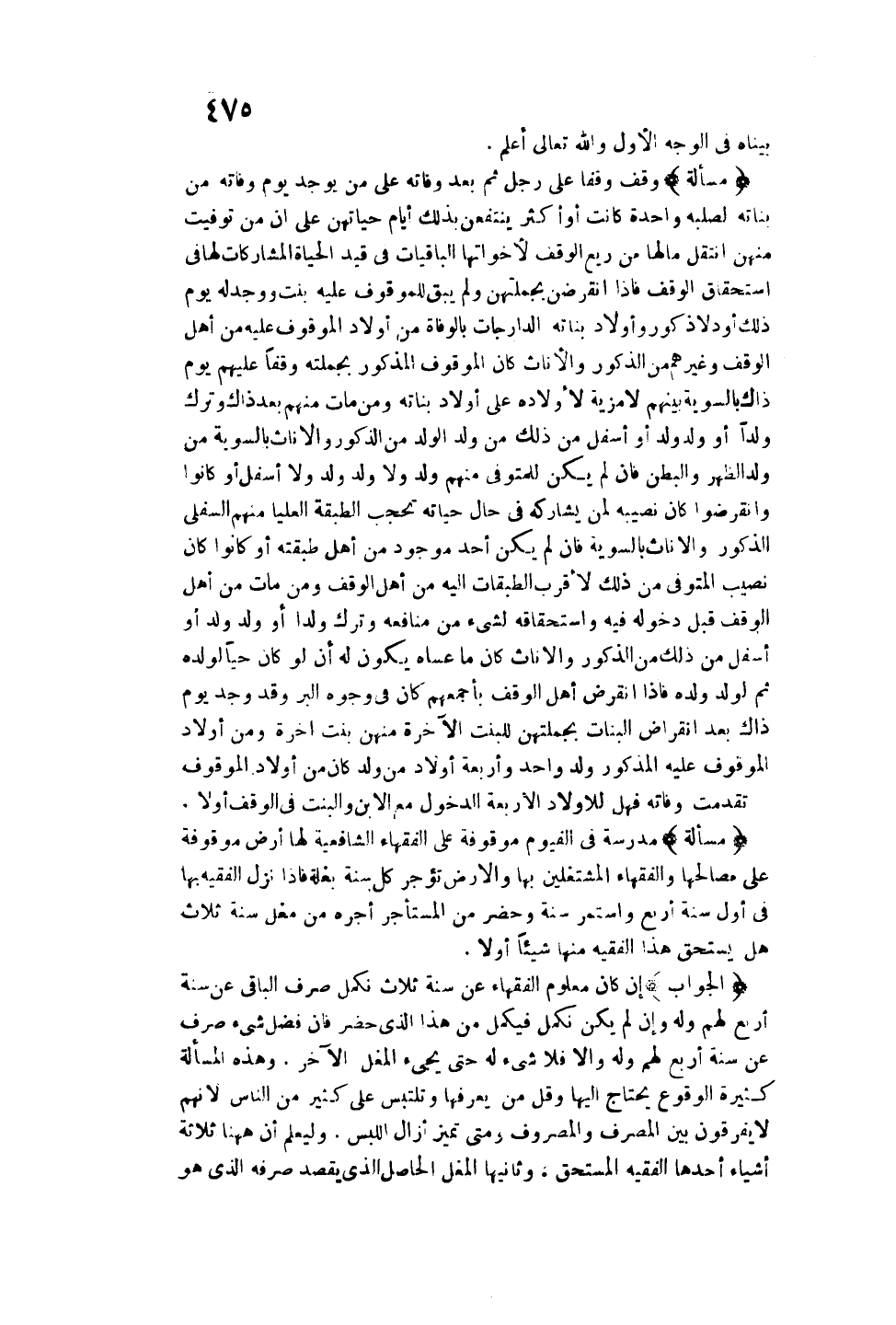 (مَسْأَلَةٌ) وَقَفَ وَقْفًا عَلَى رَجُلٍ ثُمَّ بَعْدَ وَفَاتِهِ عَلَى مَنْ يُوجَدُ يَوْمَ وَفَاتِهِ مِنْ بَنَاتِهِ لِصُلْبِهِ وَاحِدَةً كَانَتْ أَوْ أَكْثَرَ يَنْتَفِعْنَ بِذَلِكَ أَيَّامَ حَيَاتِهِنَّ عَلَى أَنَّ مَنْ تُوُفِّيَتْ مِنْهُنَّ انْتَقَلَ مَالُهَا مِنْ رِيعِ الْوَقْفِ لِأَخَوَاتِهَا الْبَاقِيَاتِ فِي قَيْدِ الْحَيَاةِ الْمُشَارِكَاتِ لَهَا فِي اسْتِحْقَاقِ الْوَقْفِ فَإِذَا انْقَرَضْنَ بِجُمْلَتِهِنَّ وَلَمْ يَبْقَ لِلْمَوْقُوفِ عَلَيْهِ بِنْتٌ وَوُجِدَ لَهُ يَوْمَ ذَلِكَ أَوْلَادٌ ذُكُورٌ وَأَوْلَادُ بَنَاتِهِ الدَّارِجَاتِ بِالْوَفَاةِ مِنْ أَوْلَادِ الْمَوْقُوفِ عَلَيْهِ مِنْ أَهْلِ الْوَقْفِ وَغَيْرِهِمْ مِنْ الذُّكُورِ وَالْإِنَاثِ كَانَ الْمَوْقُوفُ الْمَذْكُورُ بِجُمْلَتِهِ وَقْفًا عَلَيْهِمْ يَوْمَ ذَاكَ بِالسَّوِيَّةِ بَيْنَهُمْ لَا مَزِيَّةَ لِأَوْلَادِهِ عَلَى أَوْلَادِ بَنَاتِهِ وَمَنْ مَاتَ مِنْهُمْ بَعْدَ ذَاكَ وَتَرَكَ وَلَدًا أَوْ وَلَدَ وَلَدٍ أَوْ أَسْفَلَ مِنْ ذَلِكَ مِنْ وَلَدِ الْوَلَدِ مِنْ الذُّكُورِ وَالْإِنَاثِ بِالسَّوِيَّةِ مِنْ وَلَدِ الظَّهْرِ وَالْبَطْنِ، فَإِنْ لَمْ يَكُنْ لِلْمُتَوَفَّى مِنْهُمْ وَلَدٌ وَلَا وَلَدُ وَلَدٍ وَلَا أَسْفَلُ أَوْ كَانُوا وَانْقَرَضُوا كَانَ نَصِيبُهُ لِمَنْ يُشَارِكُهُ فِي حَالِ حَيَاتِهِ تَحْجُبُ الطَّبَقَةُ الْعُلْيَا مِنْهُمْ السُّفْلَى الذُّكُورُ وَالْإِنَاثُ بِالسَّوِيَّةِ، فَإِنْ لَمْ يَكُنْ أَحَدٌ مَوْجُودٌ مِنْ أَهْلِ طَبَقَتِهِ أَوْ كَانُوا كَانَ نَصِيبُ الْمُتَوَفَّى مِنْ ذَلِكَ لِأَقْرَبِ الطَّبَقَاتِ إلَيْهِ مِنْ أَهْلِ الْوَقْفِ وَمَنْ مَاتَ مِنْ أَهْلِ الْوَقْفِ قَبْلَ دُخُولِهِ فِيهِ وَاسْتِحْقَاقِهِ لِشَيْءٍ مِنْ مَنَافِعِهِ وَتَرَكَ وَلَدًا أَوْ وَلَدَ وَلَدٍ أَوْ أَسْفَلَ مِنْ ذَلِكَ مِنْ الذُّكُورِ وَالْإِنَاثِ كَانَ مَا عَسَاهُ يَكُونُ لَهُ أَنْ لَوْ كَانَ حَيًّا لِوَلَدِهِ ثُمَّ لِوَلَدِ وَلَدِهِ فَإِذَا انْقَرَضَ أَهْلُ الْوَقْفِ بِأَجْمَعِهِمْ كَانَ فِي وُجُوهِ الْبِرِّ وَقَدْ وُجِدَ يَوْمَ ذَاكَ بَعْدَ انْقِرَاضِ الْبَنَاتِ بِجُمْلَتِهِنَّ لِلْبِنْتِ الْآخِرَةِ مِنْهُنَّ بِنْتٌ آخِرَةُ وَمِنْ أَوْلَادِ الْمَوْقُوفِ عَلَيْهِ الْمَذْكُورِ وَلَدٌ وَاحِدٌ وَأَرْبَعَةُ أَوْلَادٍ مِنْ وَلَدٍ كَانَ مِنْ أَوْلَادِ الْمَوْقُوفِ تَقَدَّمَتْ وَفَاتُهُ، فَهَلْ لِلْأَوْلَادِ الْأَرْبَعَةِ الدُّخُولُ مَعَ الِابْنِ وَالْبِنْتِ فِي الْوَقْفِ أَوْ لَا.