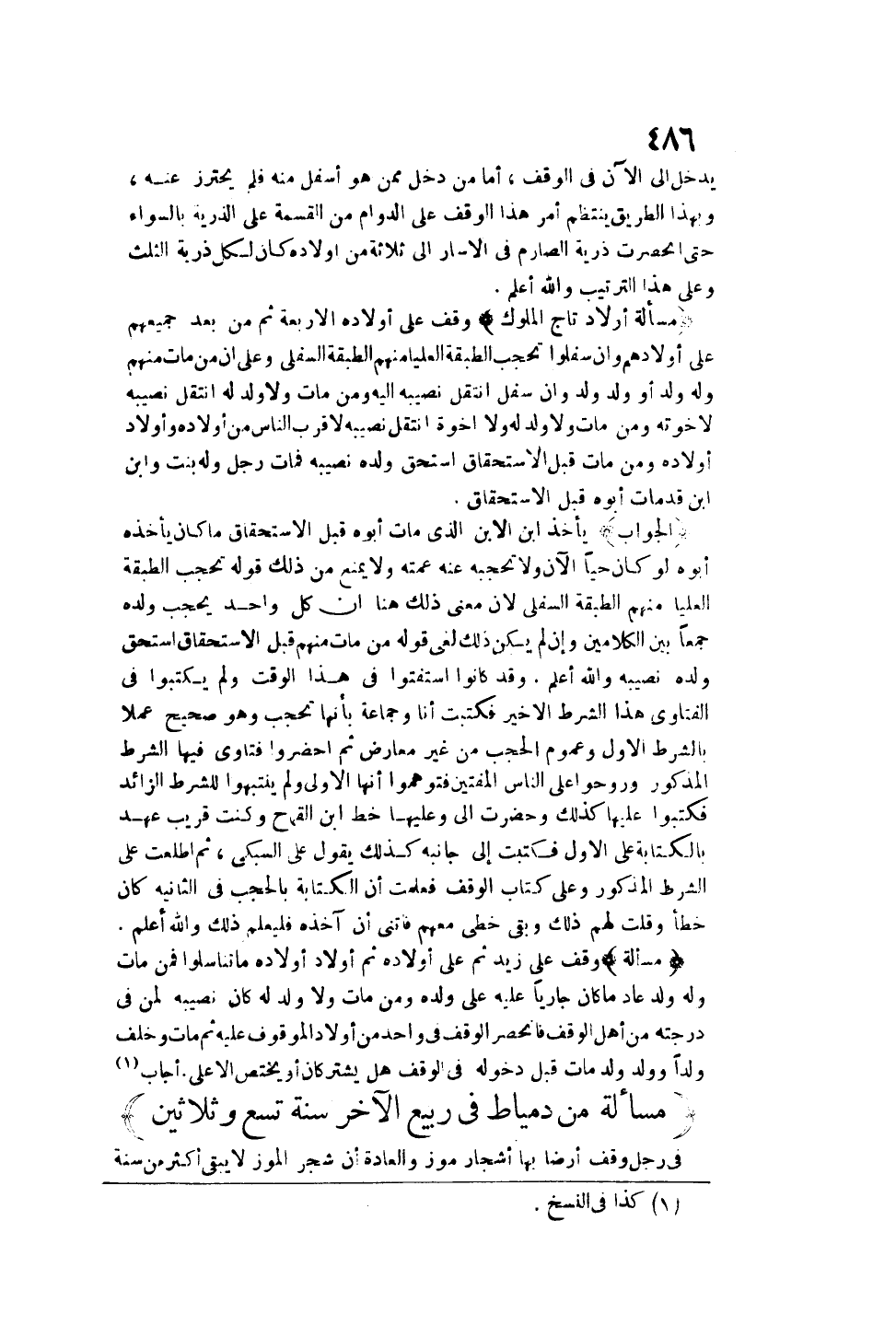 (الْجَوَابُ) يَأْخُذُ ابْنُ الِابْنِ الَّذِي مَاتَ أَبُوهُ قَبْلَ الِاسْتِحْقَاقِ مَا كَانَ يَأْخُذُهُ أَبُوهُ لَوْ كَانَ حَيًّا الْآنَ وَلَا تَحْجُبُهُ عَنْهُ عَمَّتُهُ وَلَا يَمْنَعُ مِنْ ذَلِكَ قَوْلُهُ تَحْجُبُ الطَّبَقَةُ الْعُلْيَا مِنْهُمْ الطَّبَقَةَ السُّفْلَى؛ لِأَنَّ مَعْنَى ذَلِكَ هُنَا أَنَّ كُلَّ وَاحِدٍ يَحْجُبُ وَلَدَهُ جَمْعًا بَيْنَ الْكَلَامَيْنِ وَإِنْ لَمْ يَكُنْ ذَلِكَ لَغَا قَوْلَهُ مَنْ مَاتَ مِنْهُمْ قَبْلَ الِاسْتِحْقَاقِ اسْتَحَقَّ وَلَدُهُ نَصِيبَهُ وَاَللَّهُ أَعْلَمُ. وَقَدْ كَانُوا اسْتَفْتُوا فِي هَذَا الْوَقْتِ وَلَمْ يَكْتُبُوا فِي الْفَتَاوَى هَذَا الشَّرْطَ الْأَخِيرَ فَكَتَبْت أَنَا وَجَمَاعَةٌ بِأَنَّهَا تَحْجُبُ وَهُوَ صَحِيحٌ عَمَلًا بِالشَّرْطِ الْأَوَّلِ وَعُمُومِ الْحَجْبِ مِنْ غَيْرِ مُعَارِضٍ ثُمَّ أَحْضَرُوا فَتَاوَى فِيهَا الشَّرْطُ الْمَذْكُورُ وَرَوَّحُوا عَلَى النَّاسِ الْمُفْتِينَ فَتَوَهَّمُوا أَنَّهَا الْأَوْلَى وَلَمْ يَنْتَهُوا لِلشَّرْطِ الزَّائِدِ فَكَتَبُوا عَلَيْهَا كَذَلِكَ وَحَضَرَتْ إلَيَّ وَعَلَيْهَا خَطُّ ابْنِ الْقَمَّاحِ وَكُنْت قَرِيبَ عَهْدٍ بِالْكِتَابَةِ عَلَى الْأَوَّلِ فَكَتَبْت إلَى جَانِبِهِ كَذَلِكَ يَقُولُ عَلِيٌّ السُّبْكِيُّ، ثُمَّ اطَّلَعْت عَلَى الشَّرْطِ الْمَذْكُورِ وَعَلَى كِتَابِ الْوَقْفِ فَعَلِمْت أَنَّ الْكِتَابَةَ بِالْحَجْبِ فِي الثَّانِيَةِ كَانَ خَطَأً وَقُلْت لَهُمْ ذَلِكَ وَبَقِيَ خَطِّي مَعَهُمْ فَاتَنِي أَنْ آخُذَهُ فَلْيَعْلَمْ ذَلِكَ وَاَللَّهُ أَعْلَمُ.
