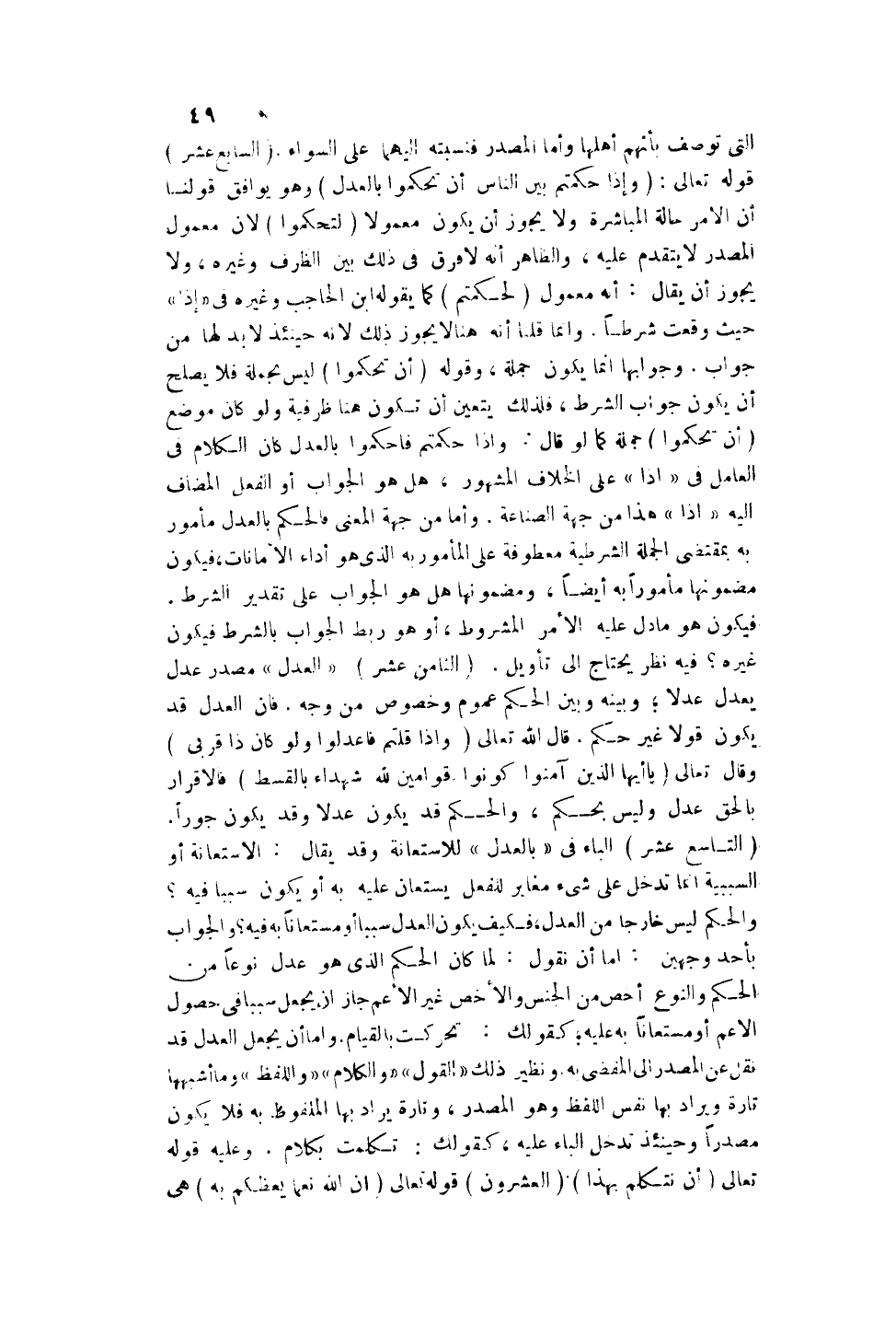 (الثَّامِنَ عَشَرَ) : " الْعَدْلُ " مَصْدَرُ عَدَلَ يَعْدِلُ عَدْلًا؛ وَبَيْنَهُ وَبَيْنَ الْحُكْمِ عُمُومٌ وَخُصُوصٌ مِنْ وَجْهٍ. فَإِنَّ الْعَدْلَ قَدْ يَكُونُ قَوْلًا غَيْرَ حُكْمٍ. قَالَ اللَّهُ تَعَالَى {وَإِذَا قُلْتُمْ فَاعْدِلُوا وَلَوْ كَانَ ذَا قُرْبَى} [الأنعام: 152] وَقَالَ تَعَالَى {يَا أَيُّهَا الَّذِينَ آمَنُوا كُونُوا قَوَّامِينَ لِلَّهِ شُهَدَاءَ بِالْقِسْطِ} [المائدة: 8] فَالْإِقْرَارُ بِالْحَقِّ عَدْلٌ وَلَيْسَ بِحُكْمٍ، وَالْحُكْمُ قَدْ يَكُونُ عَدْلًا وَقَدْ يَكُونُ جَوْرًا. (التَّاسِعَ عَشَرَ) الْبَاءُ فِي " بِالْعَدْلِ " لِلِاسْتِعَانَةِ وَقَدْ يُقَالُ: الِاسْتِعَانَةُ أَوْ السَّبَبِيَّةُ إنَّمَا تَدْخُلُ عَلَى شَيْءٍ مُغَايِرٍ لِلْفِعْلِ يُسْتَعَانُ عَلَيْهِ بِهِ أَوْ يَكُونُ سَبَبًا فِيهِ؟ وَالْحُكْمُ لَيْسَ خَارِجًا مِنْ الْعَدْلِ، فَكَيْفَ يَكُونُ الْعَدْلُ سَبَبًا أَوْ مُسْتَعَانًا بِهِ فِيهِ؟ وَالْجَوَابُ بِأَحَدِ وَجْهَيْنِ: إمَّا أَنْ نَقُولَ: لَمَّا كَانَ الْحُكْمُ الَّذِي هُوَ عَدْلٌ نَوْعًا مِنْ الْحُكْمِ وَالنَّوْعُ أَخُصُّ مِنْ الْجِنْسِ وَالْأَخَصُّ غَيْرُ الْأَعَمِّ جَازَ أَنْ يُجْعَلَ سَبَبًا فِي حُصُولِ الْأَعَمِّ أَوْ مُسْتَعَانًا بِهِ عَلَيْهِ؛ كَقَوْلِك: تَحَرَّكْت بِالْقِيَامِ. وَإِمَّا أَنْ يُجْعَلَ الْعَدْلُ قَدْ نُقِلَ عَنْ الْمَصْدَرِ إلَى الْمُفْضِي بِهِ. وَنَظِيرُ ذَلِكَ " الْقَوْلُ " " وَالْكَلَامُ " " وَاللَّفْظُ " وَمَا أَشْبَهَهَا تَارَةً وَيُرَادُ بِهَا نَفْسُ اللَّفْظِ وَهُوَ الْمَصْدَرُ، وَتَارَةً يُرَادُ بِهَا الْمَلْفُوظُ بِهِ فَلَا يَكُونُ مَصْدَرًا وَحِينَئِذٍ تَدْخُلُ الْبَاءُ عَلَيْهِ، كَقَوْلِك: تَكَلَّمْت بِكَلَامٍ. وَعَلَيْهِ قَوْله تَعَالَى {أَنْ نَتَكَلَّمَ بِهَذَا} [النور: 16] .