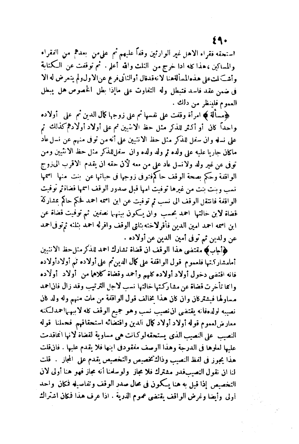 (أَجَابَ) مُقْتَضَى هَذَا الْوَقْفِ أَنَّ قُضَاةَ تُشَارِكُ أَحْمَدَ لِلذَّكَرِ مِثْلُ حَظِّ الْأُنْثَيَيْنِ أَمَّا مُشَارَكَتُهَا فَلِعُمُومِ قَوْلِ الْوَاقِفَةِ عَلَى كَمَالِ الدِّينِ ثُمَّ عَلَى أَوْلَادِهِ ثُمَّ أَوْلَادِ أَوْلَادِهِ فَإِنَّهُ اقْتَضَى دُخُولَ أَوْلَادِ أَوْلَادِهِ كُلِّهِمْ وَأَحْمَدُ وَقُضَاةُ كِلَاهُمَا مِنْ أَوْلَادِ أَوْلَادِهِ وَإِنَّمَا تَأَخَّرَتْ قُضَاةُ عَنْ مُشَارَكَتِهَا خَالَتَهَا نَسَبَ لِأَجْلِ التَّرْتِيبِ وَقَدْ زَالَ فَإِنَّ أَحْمَدَ مُسَاوٍ لَهَا فَيَشْتَرِكَانِ وَإِنْ كَانَ هَذَا يُخَالِفُ قَوْلَ الْوَاقِفَةِ مَنْ مَاتَ مِنْهُمْ وَلَهُ وَلَدٌ كَانَ نَصِيبُهُ لِوَلَدِهِ فَإِنَّهُ يَقْتَضِي أَنَّ نَصِيبَ نَسَبَ وَهُوَ جَمِيعُ الْوَقْفِ كُلُّهُ لِأَبِيهِمَا أَحْمَدَ لَكِنَّهُ مُعَارِضٌ لِعُمُومِ قَوْلِهِ أَوْلَادِ أَوْلَادِ كَمَالِ الدِّينِ وَاقْتِضَائِهِ اسْتِحْقَاقَهُمْ فَحَمَلْنَا قَوْلَهُ النَّصِيبُ عَلَى النَّصِيبِ الَّذِي يَسْتَحِقُّهُ لَوْ كَانَتْ هِيَ مُسَاوِيَةً لِقُضَاةَ؛ لِأَنَّهَا إنَّمَا قُدِّمَتْ عَلَيْهَا لِعُلُوِّهَا فِي الدَّرَجَةِ وَهَذَا الْوَصْفُ مَفْقُودٌ فِي ابْنِهَا فَلَا يُقَدَّمُ عَلَيْهَا.