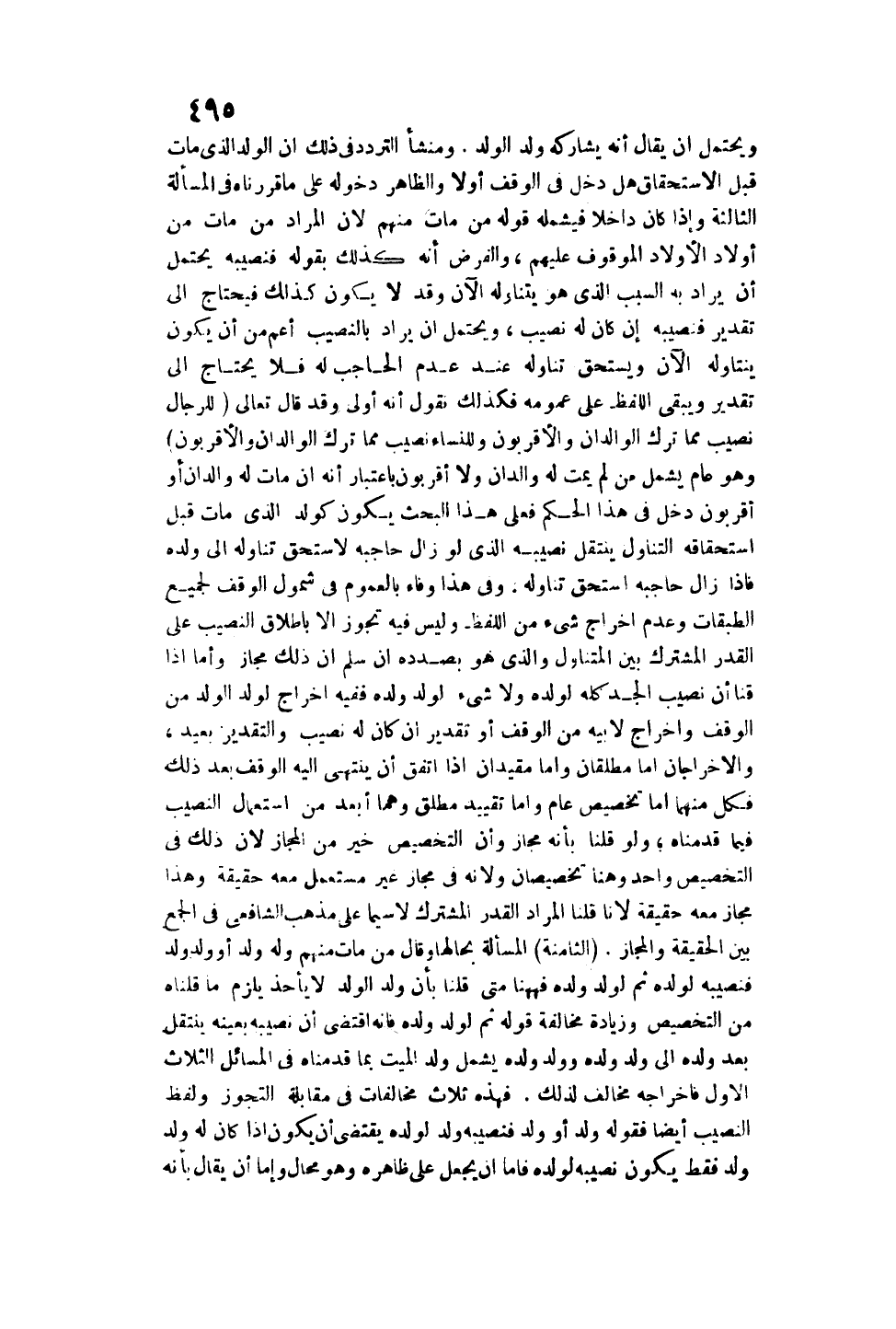 وَيُحْتَمَلُ أَنْ يُقَالَ: إنَّهُ يُشَارِكُهُ وَلَدُ الْوَلَدِ. وَمَنْشَأُ التَّرَدُّدِ فِي ذَلِكَ أَنَّ الْوَلَدَ الَّذِي مَاتَ قَبْلَ الِاسْتِحْقَاقِ هَلْ دَخَلَ فِي الْوَقْفِ أَوْ لَا وَالظَّاهِرُ دُخُولُهُ عَلَى مَا قَرَّرْنَاهُ فِي الْمَسْأَلَةِ الثَّالِثَةِ، وَإِذَا كَانَ دَاخِلًا فَيَشْمَلُهُ قَوْلُهُ مَنْ مَاتَ مِنْهُمْ؛ لِأَنَّ الْمُرَادَ مَنْ مَاتَ مِنْ أَوْلَادِ الْأَوْلَادِ الْمَوْقُوفِ عَلَيْهِمْ، وَالْفَرْضُ أَنَّهُ كَذَلِكَ بِقَوْلِهِ فَنَصِيبُهُ يَحْتَمِلُ أَنْ يُرَادَ بِهِ السَّبَبُ الَّذِي هُوَ يَتَنَاوَلُهُ الْآنَ وَقَدْ لَا يَكُونُ كَذَلِكَ فَيَحْتَاجُ إلَى تَقْدِيرٍ فَنَصِيبُهُ إنْ كَانَ لَهُ نَصِيبٌ، وَيُحْتَمَلُ أَنْ يُرَادَ بِالنَّصِيبِ أَعَمُّ مِنْ أَنْ يَكُونَ يَتَنَاوَلُهُ الْآنَ وَيَسْتَحِقُّ تَنَاوُلَهُ عِنْدَ عَدَمِ الْحَاجِبِ لَهُ فَلَا يَحْتَاجُ إلَى تَقْدِيرٍ وَيَبْقَى اللَّفْظُ عَلَى عُمُومِهِ فَكَذَلِكَ نَقُولُ: إنَّهُ أَوْلَى وَقَدْ قَالَ تَعَالَى {لِلرِّجَالِ نَصِيبٌ مِمَّا تَرَكَ الْوَالِدَانِ وَالأَقْرَبُونَ وَلِلنِّسَاءِ نَصِيبٌ مِمَّا تَرَكَ الْوَالِدَانِ وَالأَقْرَبُونَ} [النساء: 7] وَهُوَ عَامٌّ يَشْمَلُ مَنْ لَمْ يَمُتْ لَهُ وَالِدَانِ وَلَا أَقْرَبُونَ بِاعْتِبَارِ أَنَّهُ إنْ مَاتَ لَهُ وَالِدَانِ أَوْ أَقْرَبُونَ دَخَلَ فِي هَذَا الْحُكْمِ فَعَلَى هَذَا الْبَحْثِ يَكُونُ كَوَلَدِ الَّذِي مَاتَ قَبْلَ اسْتِحْقَاقِهِ التَّنَاوُلَ يَنْتَقِلُ نَصِيبُهُ الَّذِي لَوْ زَالَ حَاجِبُهُ لَاسْتَحَقَّ تَنَاوُلَهُ إلَى وَلَدِهِ فَإِذَا زَالَ حَاجِبُهُ اسْتَحَقَّ تَنَاوُلَهُ، وَفِي هَذَا وَفَاءٌ بِالْعُمُومِ فِي شُمُولِ الْوَقْفِ لِجَمِيعِ الطَّبَقَاتِ وَعَدَمُ إخْرَاجِ شَيْءٍ مِنْ اللَّفْظِ وَلَيْسَ فِيهِ تَجَوُّزٌ إلَّا بِإِطْلَاقِ النَّصِيبِ عَلَى الْقَدْرِ الْمُشْتَرَكِ بَيْنَ الْمُتَنَاوَلِ وَاَلَّذِي هُوَ بِصَدَدِهِ إنْ سَلَّمَ أَنَّ ذَلِكَ مَجَازٌ.