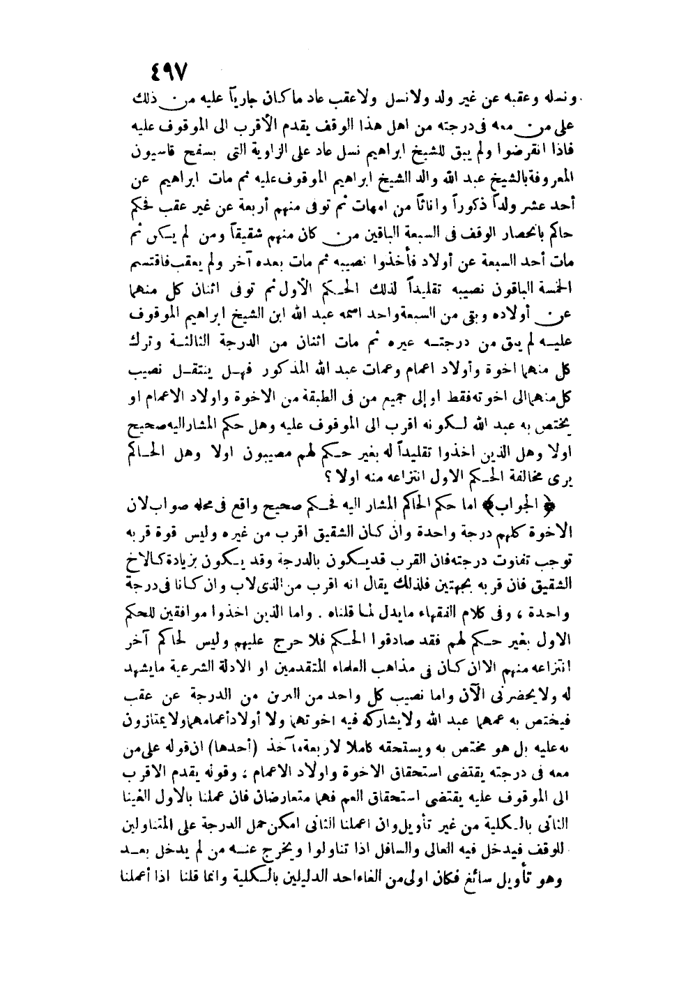 وَنَسْلِهِ وَعَقِبِهِ عَنْ غَيْرِ وَلَدٍ وَلَا نَسْلٍ وَلَا عَقِبٍ عَادَ مَا كَانَ جَارِيًا عَلَيْهِ مِنْ ذَلِكَ عَلَى مَنْ مَعَهُ فِي دَرَجَتِهِ مِنْ أَهْلِ هَذَا الْوَقْفِ يُقَدَّمُ الْأَقْرَبُ إلَى الْمَوْقُوفِ عَلَيْهِ فَإِذَا انْقَرَضُوا وَلَمْ يَبْقَ لِلشَّيْخِ إبْرَاهِيمَ نَسْلٌ عَادَ عَلَى الزَّاوِيَةِ الَّتِي بِسَفْحِ قَاسِيُونَ الْمَعْرُوفَةُ بِالشَّيْخِ عَبْدِ اللَّهِ وَالِد الشَّيْخِ إبْرَاهِيمَ الْمَوْقُوفِ عَلَيْهِ ثُمَّ مَاتَ إبْرَاهِيمُ عَنْ أَحَدَ عَشَرَ وَلَدًا ذُكُورًا وَإِنَاثًا مِنْ أُمَّهَاتٍ ثُمَّ تُوُفِّيَ مِنْهُمْ أَرْبَعَةٌ عَنْ غَيْرِ عَقِبٍ فَحَكَمَ حَاكِمٌ بِانْحِصَارِ الْوَقْفِ فِي السَّبْعَةِ الْبَاقِينَ مَنْ كَانَ مِنْهُمْ شَقِيقًا وَمَنْ لَمْ يَكُنْ ثُمَّ مَاتَ أَحَدُ السَّبْعَةِ عَنْ أَوْلَادٍ فَأَخَذُوا نَصِيبَهُ ثُمَّ مَاتَ بَعْدَهُ آخَرُ وَلَمْ يَعْقُبْ فَاقْتَسَمَ الْخَمْسَةُ الْبَاقُونَ نَصِيبَهُ تَقْلِيدًا لِذَلِكَ الْحُكْمِ الْأَوَّلِ ثُمَّ تُوُفِّيَ اثْنَانِ كُلٌّ مِنْهُمَا عَنْ أَوْلَادِهِ وَبَقِيَ مِنْ السَّبْعَةِ وَاحِدٌ اسْمُهُ عَبْدُ اللَّهِ بْنُ الشَّيْخِ إبْرَاهِيمَ الْمَوْقُوفِ عَلَيْهِ لَمْ يَبْقَ مِنْ دَرَجَتِهِ غَيْرُهُ ثُمَّ مَاتَ اثْنَانِ مِنْ الدَّرَجَةِ الثَّالِثَةِ وَتَرَكَ كُلٌّ مِنْهُمَا إخْوَةً وَأَوْلَادَ أَعْمَامٍ وَعَمَّاتِ عَبْدِ اللَّهِ الْمَذْكُورِ فَهَلْ يَنْتَقِلُ نَصِيبُ كُلٍّ مِنْهُمَا إلَى إخْوَتِهِ فَقَطْ أَوْ إلَى جَمِيعِ مَنْ فِي الطَّبَقَةِ مِنْ الْإِخْوَةِ وَأَوْلَادِ الْأَعْمَامِ أَوْ يَخْتَصُّ بِهِ عَبْدُ اللَّهِ لِكَوْنِهِ أَقْرَبَ إلَى الْمَوْقُوفِ عَلَيْهِ؟ وَهَلْ حُكْمُ الْمُشَارِ إلَيْهِ صَحِيحٌ أَوْ لَا؟ وَهَلْ الَّذِينَ أَخَذُوا تَقْلِيدًا لَهُ بِغَيْرِ حُكْمٍ لَهُمْ مُصِيبُونَ أَوْ لَا؟ وَهَلْ الْحَاكِمُ يَرَى مُخَالَفَةَ الْحُكْمِ الْأَوَّلِ انْتِزَاعَهُ مِنْهُ أَوْ لَا؟